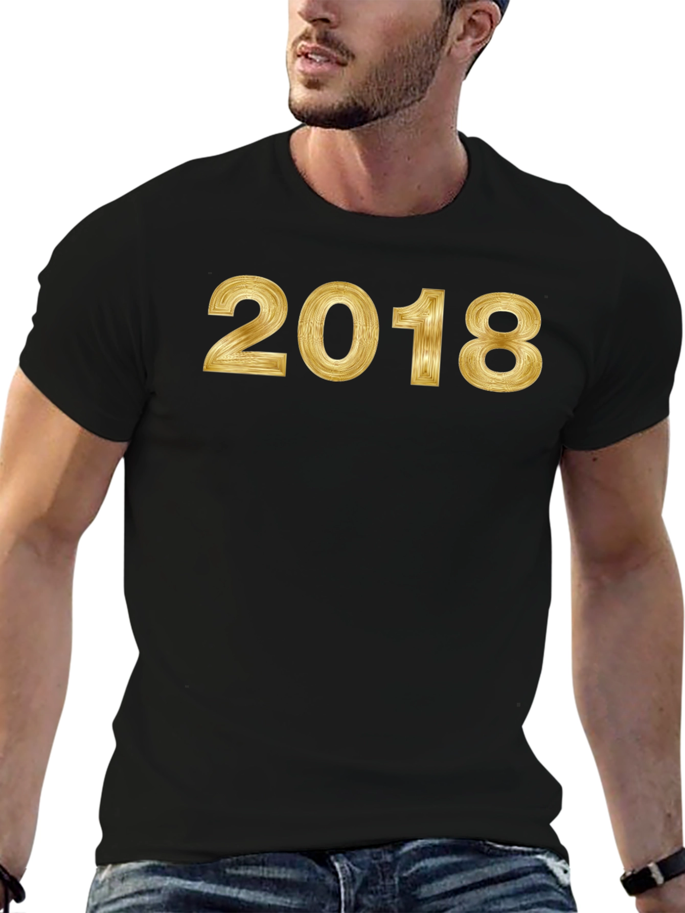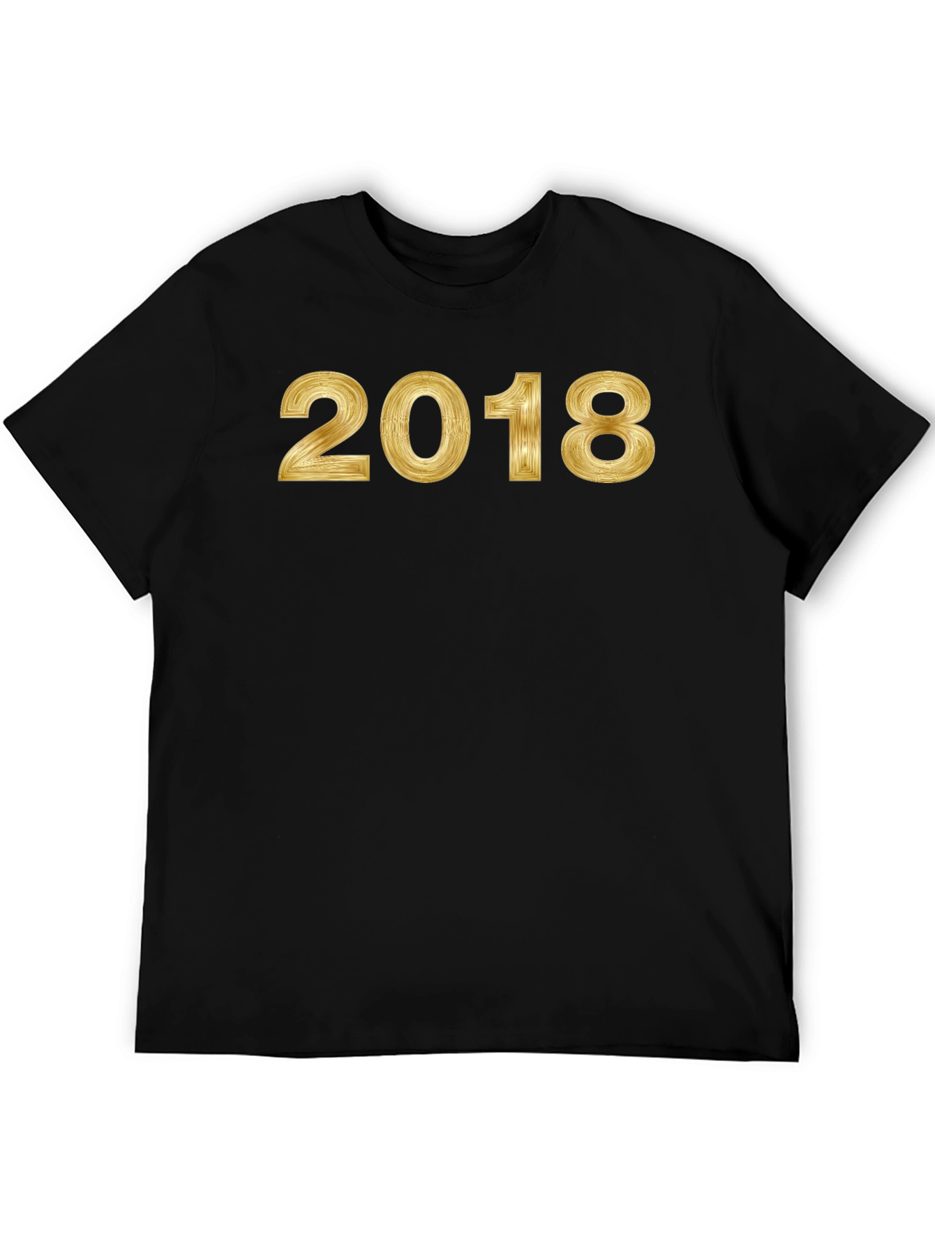 Show off your style with this bold, black t-shirt! Featuring a shiny, gold-toned “2018” print across the chest, this shirt makes a statement. The classic cut and comfortable fabric make it perfect for everyday wear, while the eye-catching design ensures you stand out from the crowd. Whether you're celebrating a special year, attending a casual event, or simply want to add some sparkle to your wardrobe, this t-shirt is an ideal choice. The quality print and durable material ensure long-lasting wear and style. Add this must-have piece to your collection!