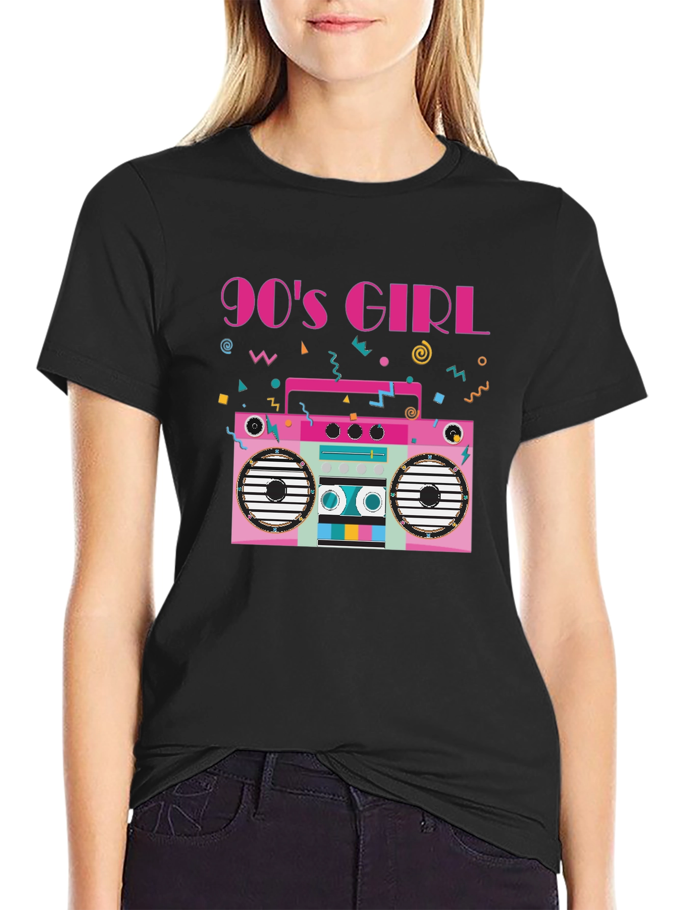 Step back into the vibrant era of the 90s with this stylish black t-shirt. The tee features a playful graphic of a classic boombox, complete with retro colors and geometric patterns. Bold "90's GIRL" text adorns the top, adding a touch of nostalgia. Made from comfortable materials, this tee is perfect for casual wear, 90s-themed parties, or anyone who loves vintage vibes. It's a statement piece that adds a pop of fun to any outfit. Embrace the era of mixtapes and neon colors with this unique and eye-catching t-shirt!