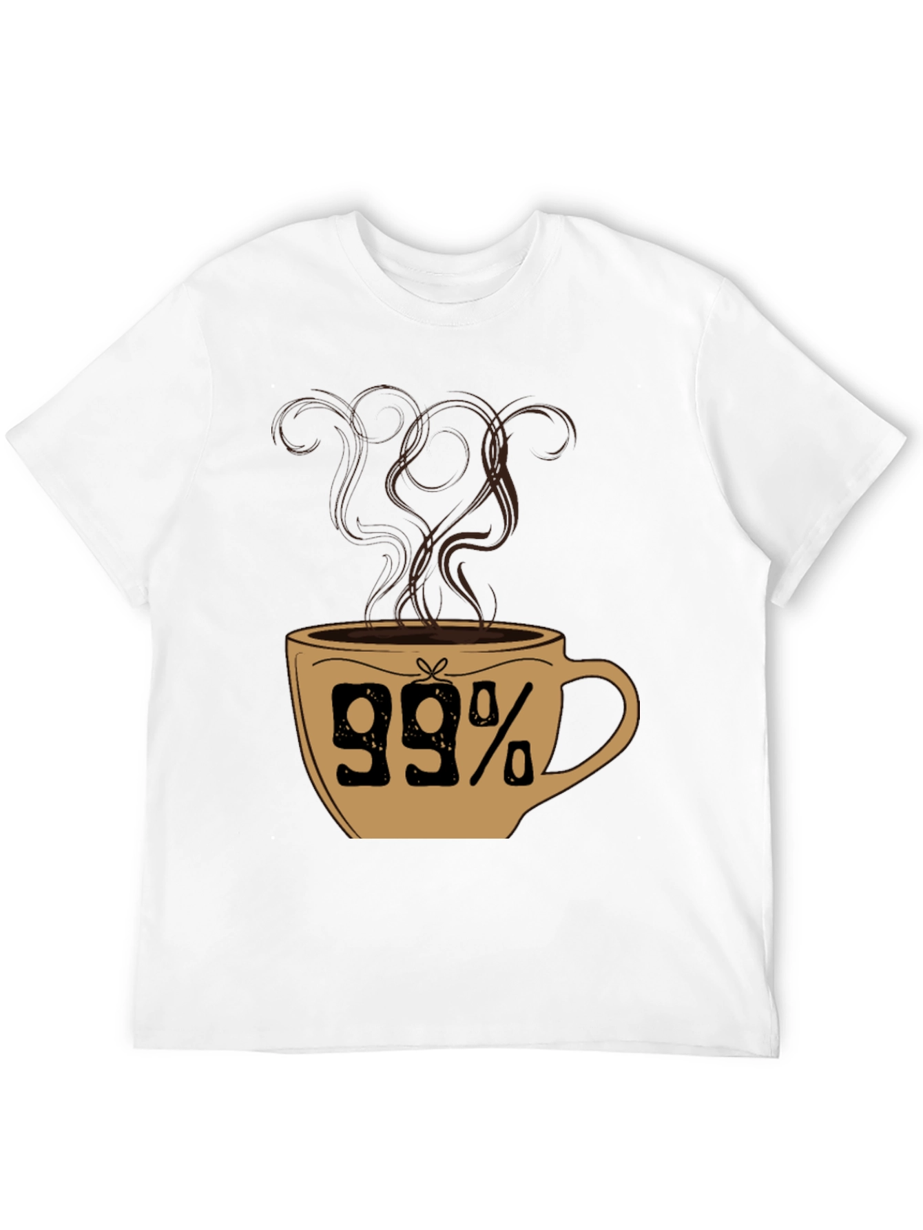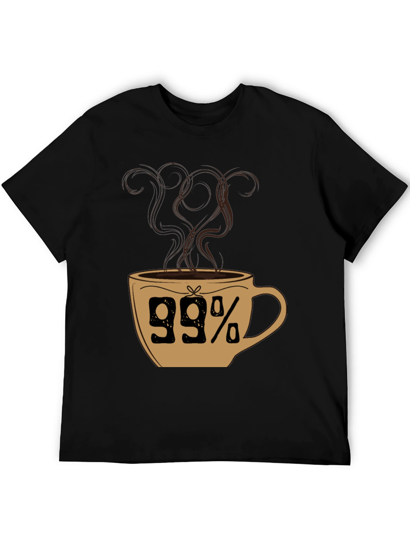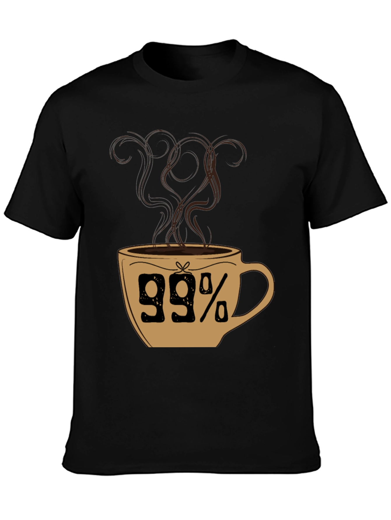 Express your love for coffee with this unique black t-shirt. The design features a stylized coffee cup graphic filled with dark brew and adorned with the bold statement "99%". The brown graphic includes wisps of steam, suggesting a hot, fresh cup of coffee. Made from a comfortable-looking fabric, this tee is perfect for everyday wear. Whether you're heading to a coffee shop, running errands, or relaxing at home, this t-shirt is a great way to show off your caffeine enthusiasm. It's a fun and casual piece that's sure to spark conversations and get you noticed.