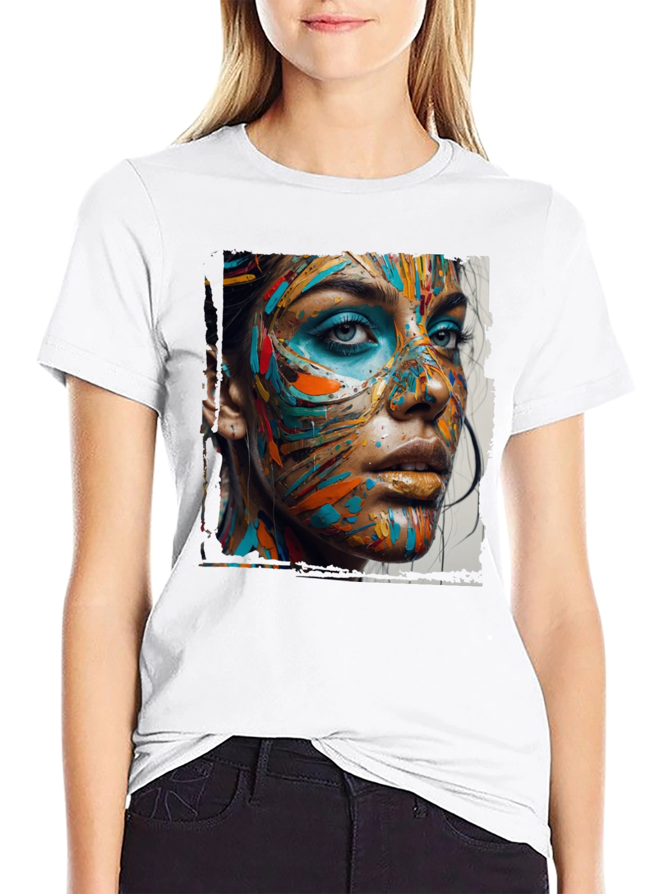 Make a statement with this striking black t-shirt, featuring a vibrant abstract face design. The artwork showcases a woman's face adorned with bold strokes of blue, orange, and gold paint, creating a unique and eye-catching look. This tee is perfect for expressing your artistic side and adding a pop of color to your wardrobe. Made from a comfortable, soft fabric, it's ideal for everyday wear or as a standout piece for casual outings. Show off your love for art and individuality with this must-have t-shirt.