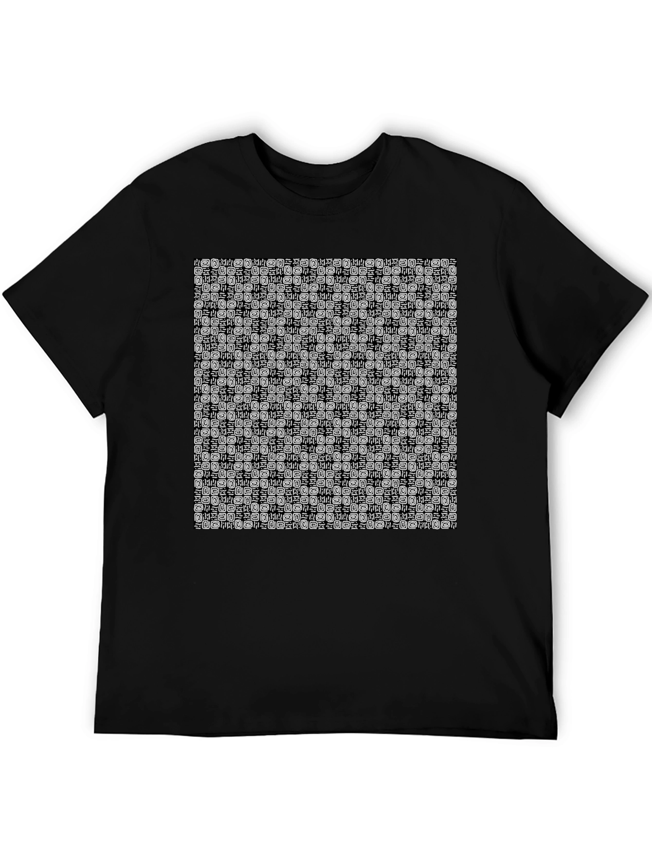 Elevate your everyday style with this eye-catching black t-shirt. Featuring a bold, abstract pattern of intricate geometric shapes, this tee is a statement piece that combines comfort and modern design. Made from what appears to be soft, breathable cotton, it's perfect for all-day wear. The striking contrast between the black fabric and the intricate white design ensures you'll stand out from the crowd. Whether you're heading to a casual gathering or simply expressing your unique style, this t-shirt is a versatile addition to any wardrobe. Make a statement without saying a word.