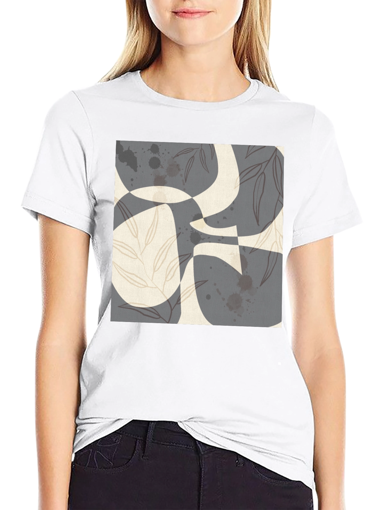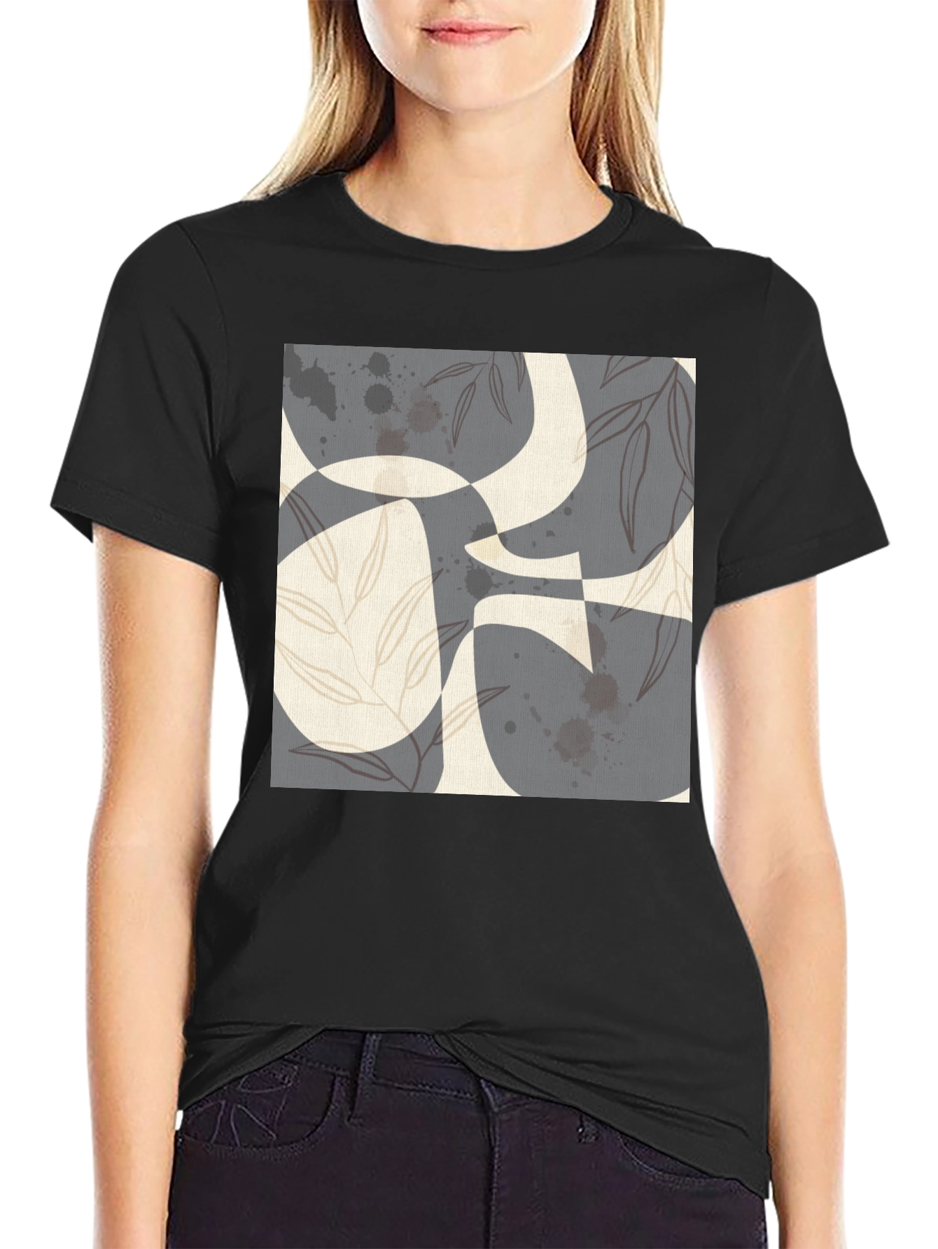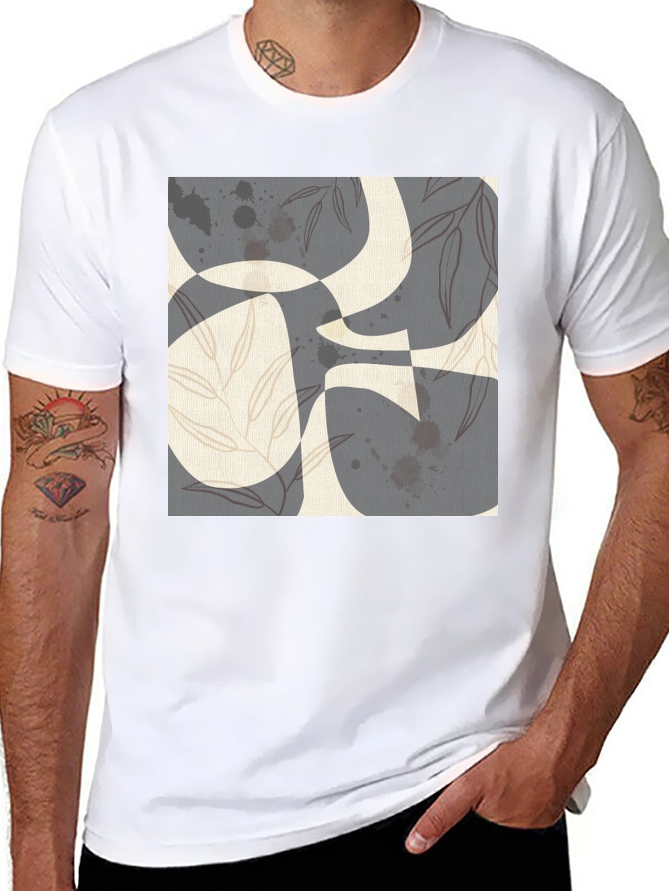 This stylish black t-shirt features an eye-catching abstract print on the front. The design incorporates geometric shapes, leaf-like accents, and splattered details in muted tones. The tee is made from a soft, comfortable fabric and has a classic fit, making it perfect for everyday wear. Dress it up with jeans or keep it casual with shorts for a versatile look. Ideal for expressing your unique sense of style. A great conversation starter. Get yours today!