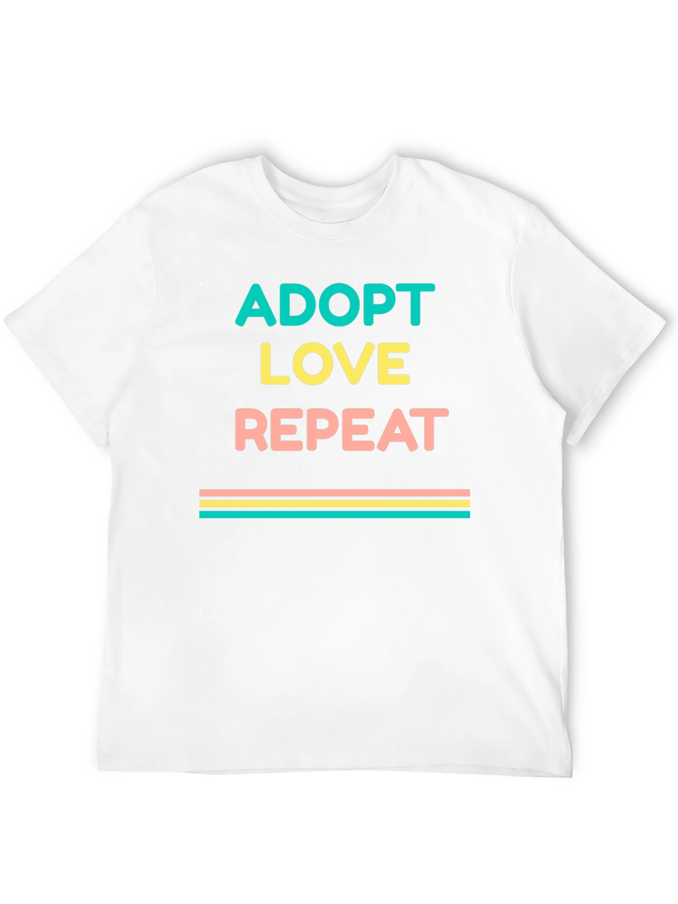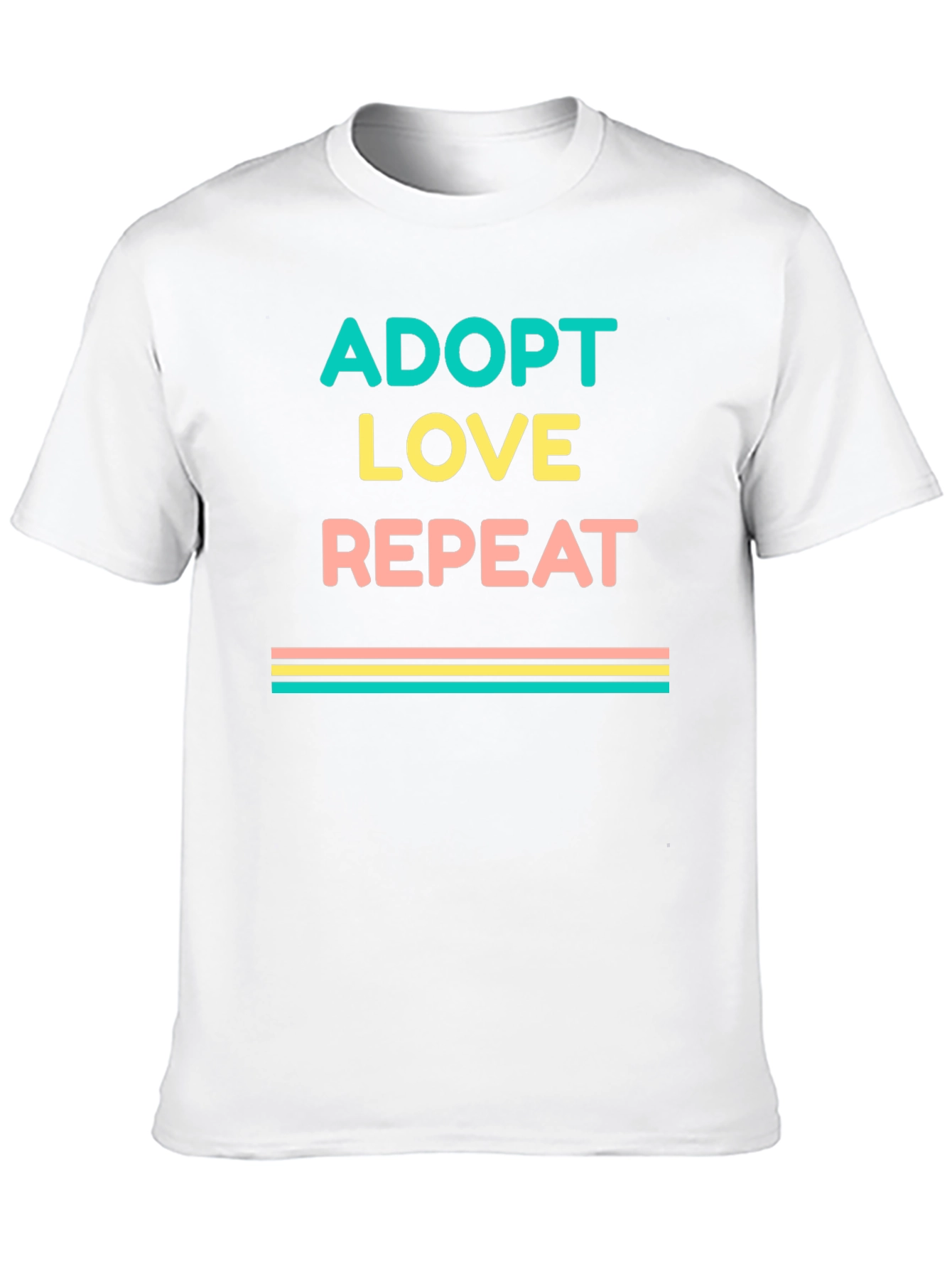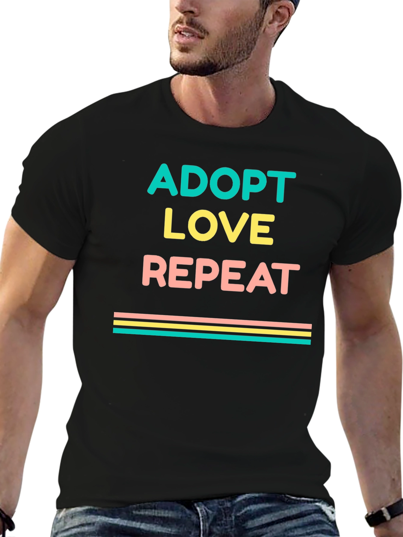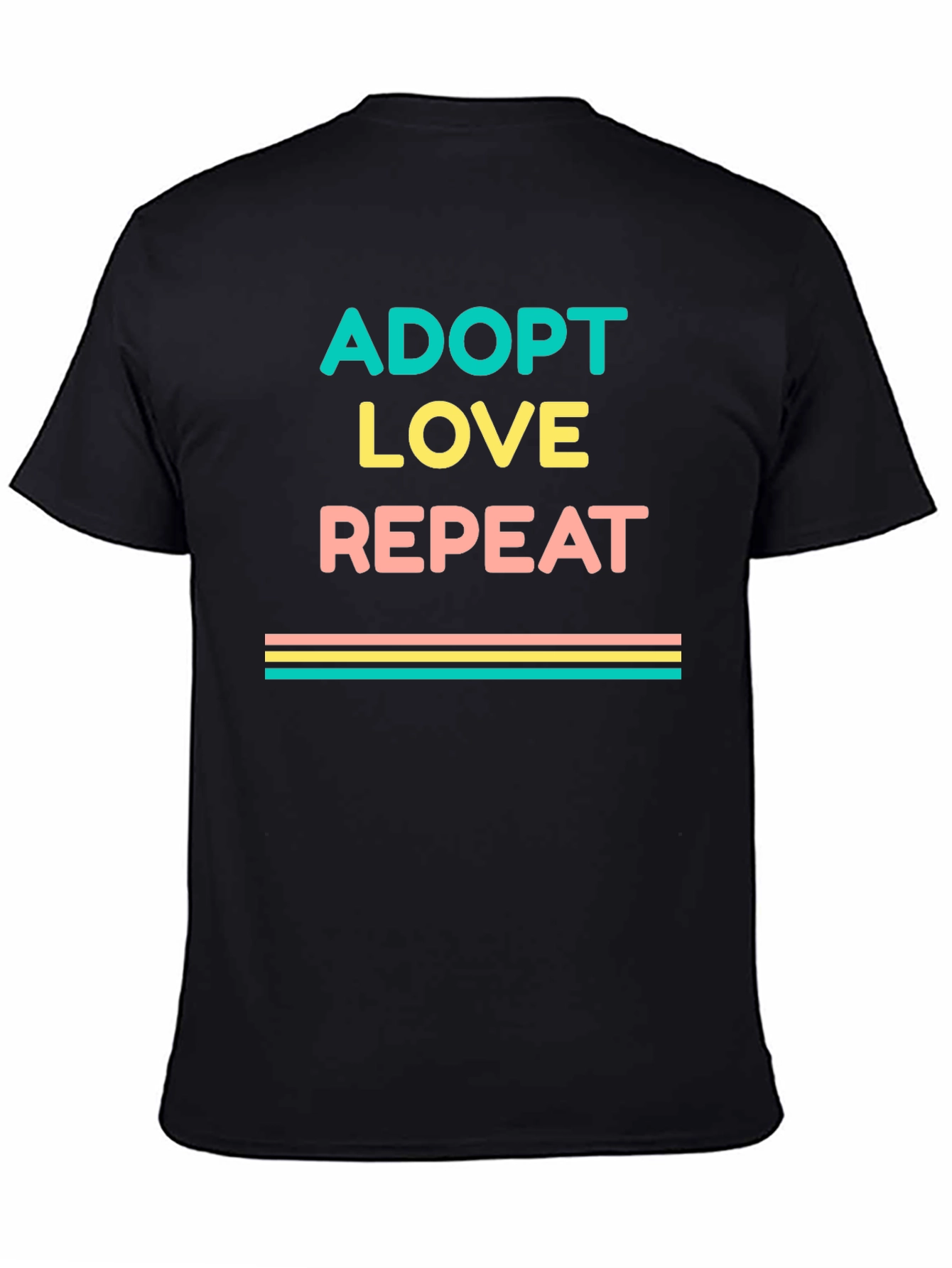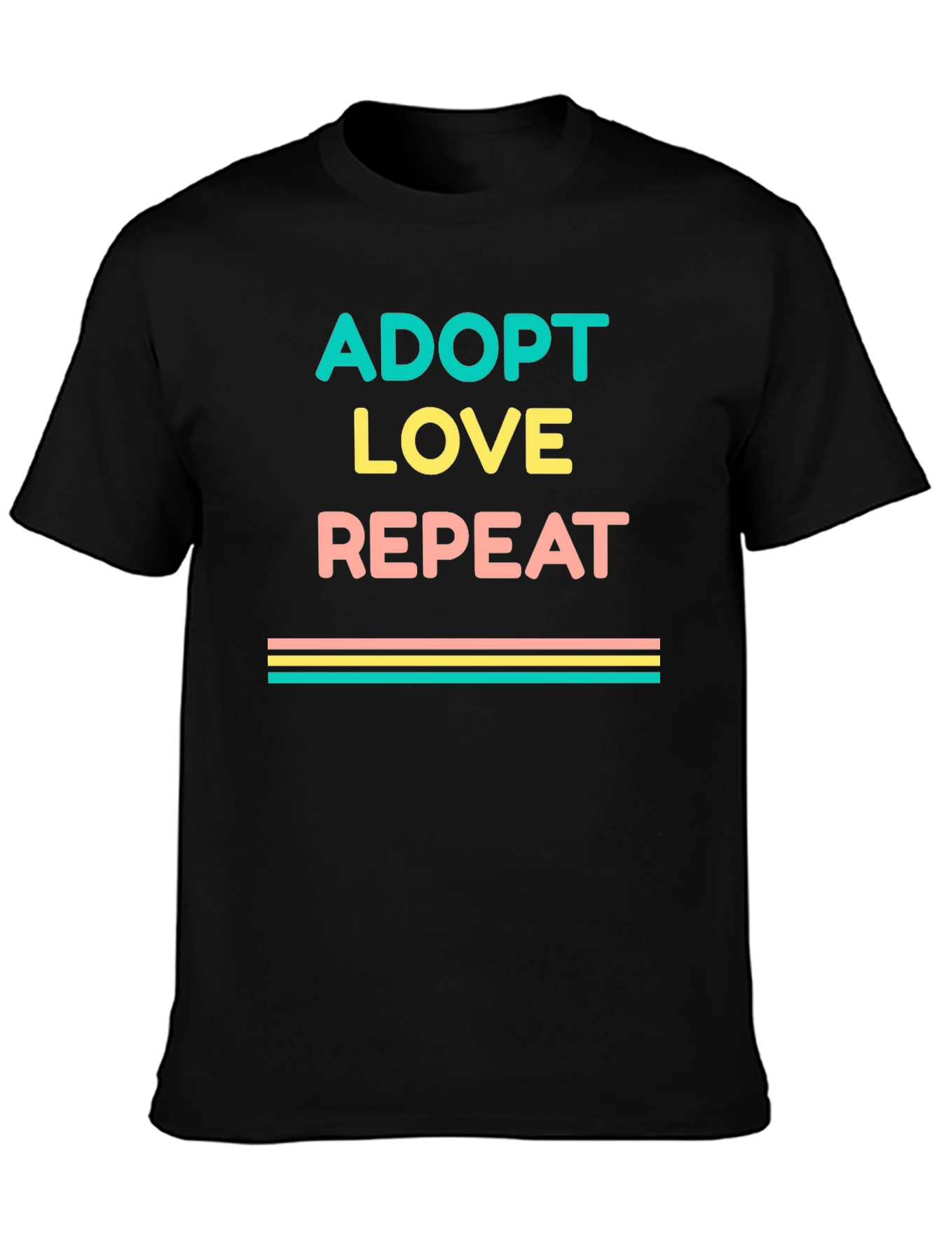 Show your love for adoption with this stylish graphic tee! This black t-shirt features the words "ADOPT LOVE REPEAT" in a stacked design with teal, yellow, and peach text. Below the text are horizontal stripes of similar colors. Made from a soft-looking fabric, this tee offers comfort and style. Ideal for everyday wear, adoption events, or animal rescues. A great way to show support for adoption and spread positivity! Get yours today and wear your heart on your sleeve.