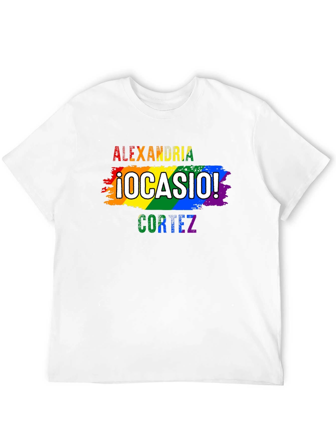Show your support with this vibrant Alexandria Ocasio-Cortez t-shirt. The design features the names "Alexandria Ocasio Cortez" in rainbow colors, creating a bold and eye-catching statement. Made from a soft, comfortable fabric, this classic fit tee is perfect for rallies, events, or everyday wear. The rainbow theme is a symbol of solidarity. Makes a great gift for anyone who supports equality. Let your views be known!