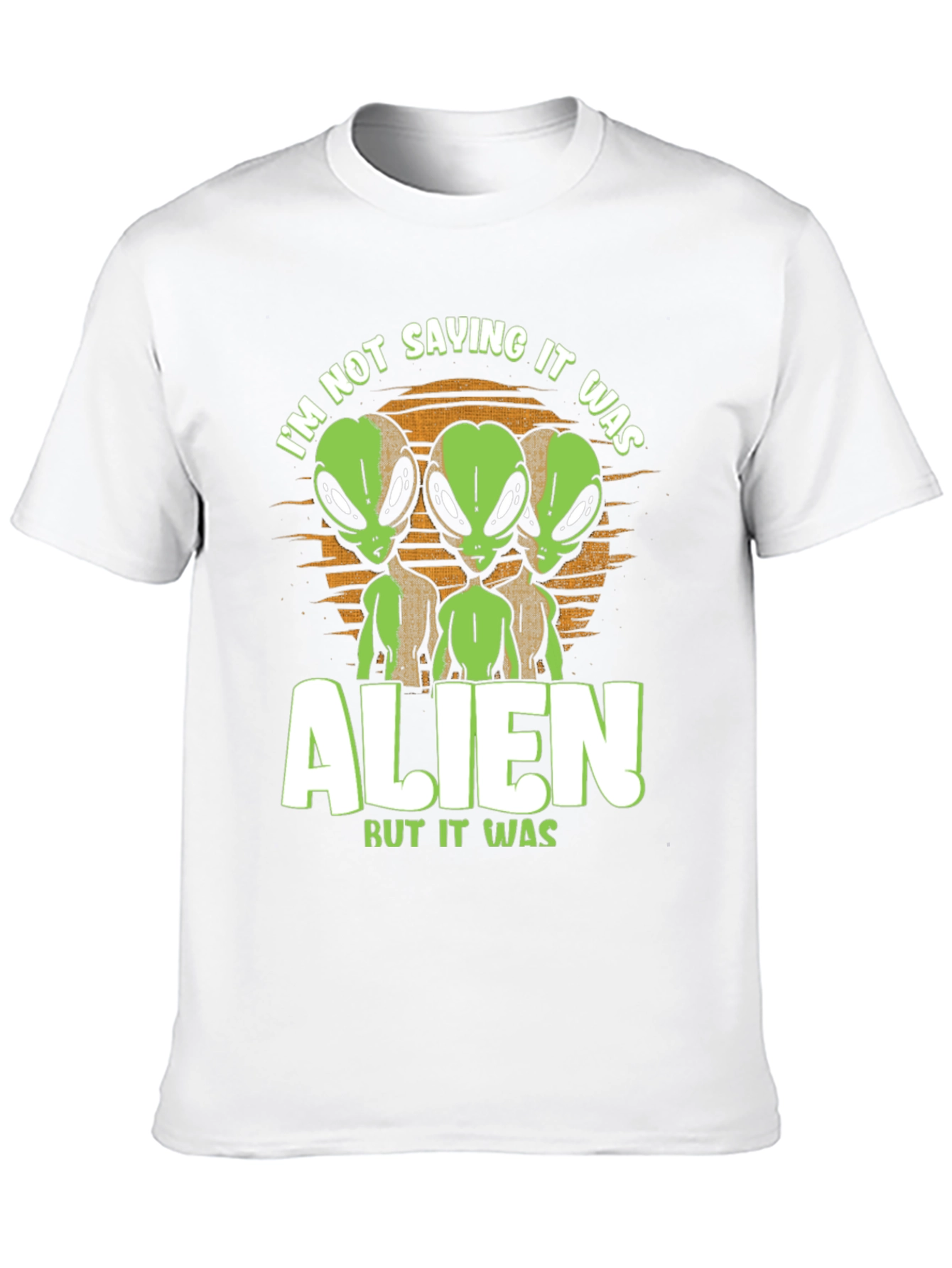 Show off your love for extraterrestrials with this unique graphic tee. The shirt features three green aliens against a sunset-like backdrop, accompanied by the phrase 'I'm Not Saying It Was Alien But It Was'. This bold and eye-catching design is printed on a soft, comfortable black fabric. Perfect for casual wear, sci-fi conventions, or as a conversation starter, this tee adds a touch of humor and mystery to your wardrobe. Get yours now and let everyone know you're a believer!