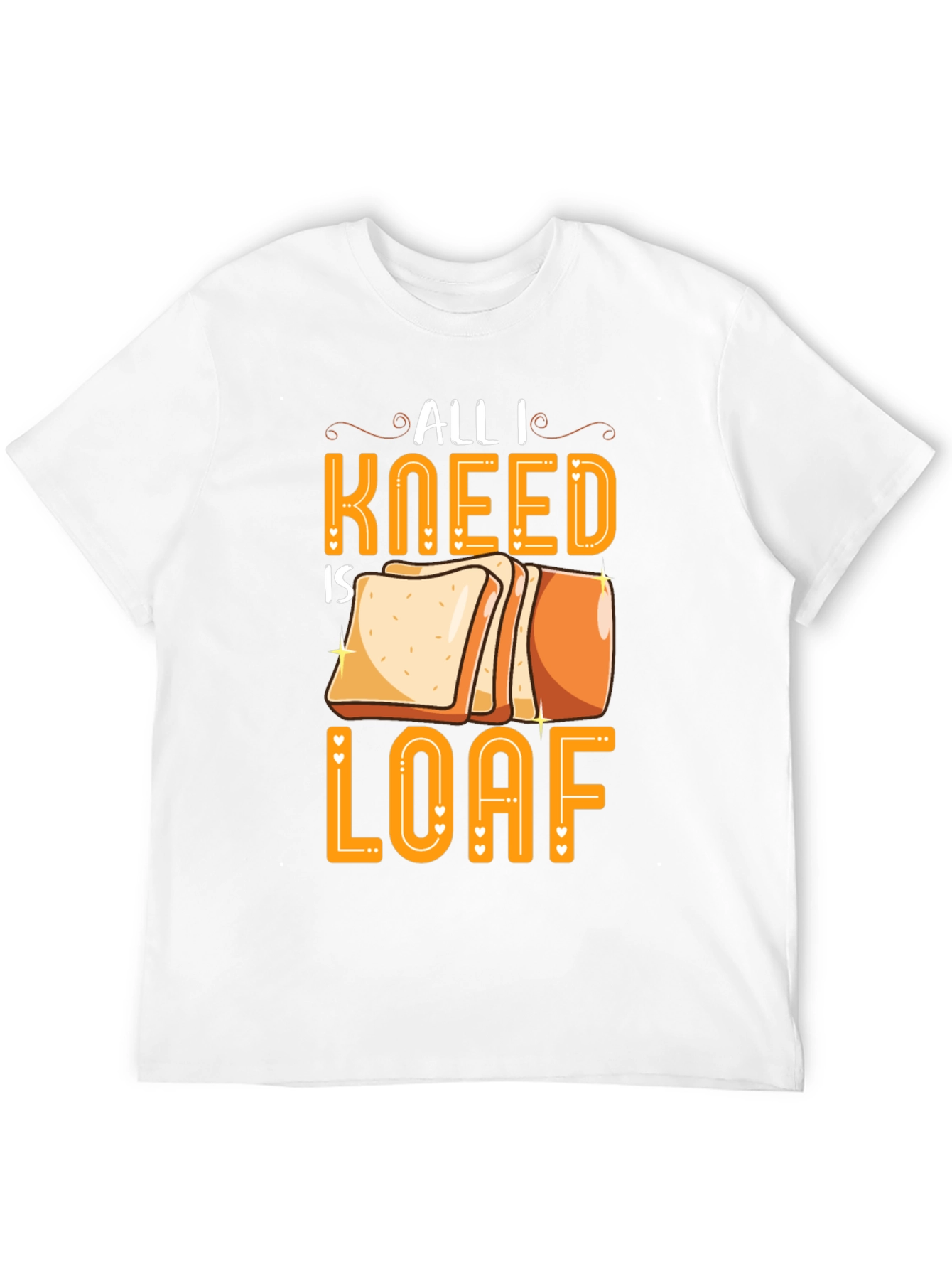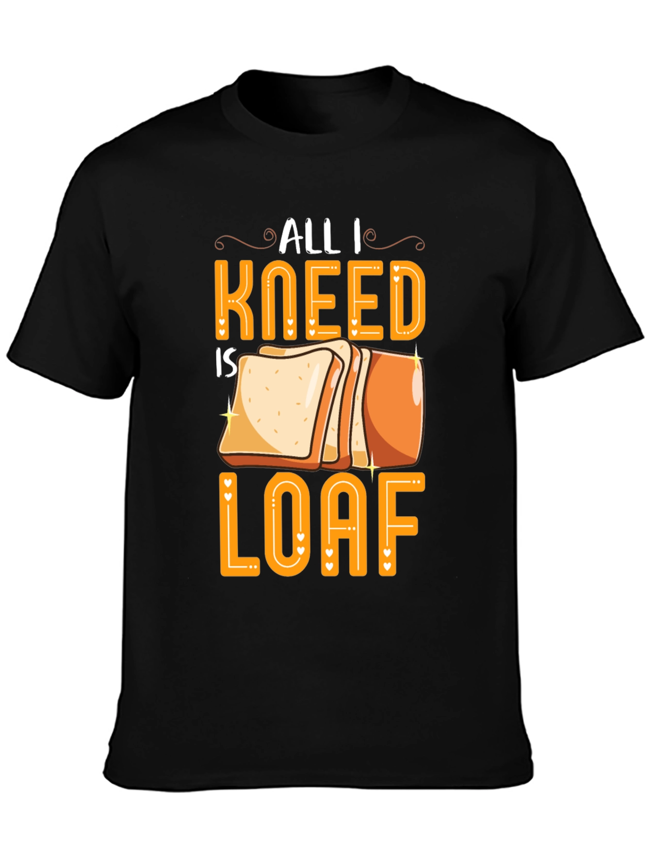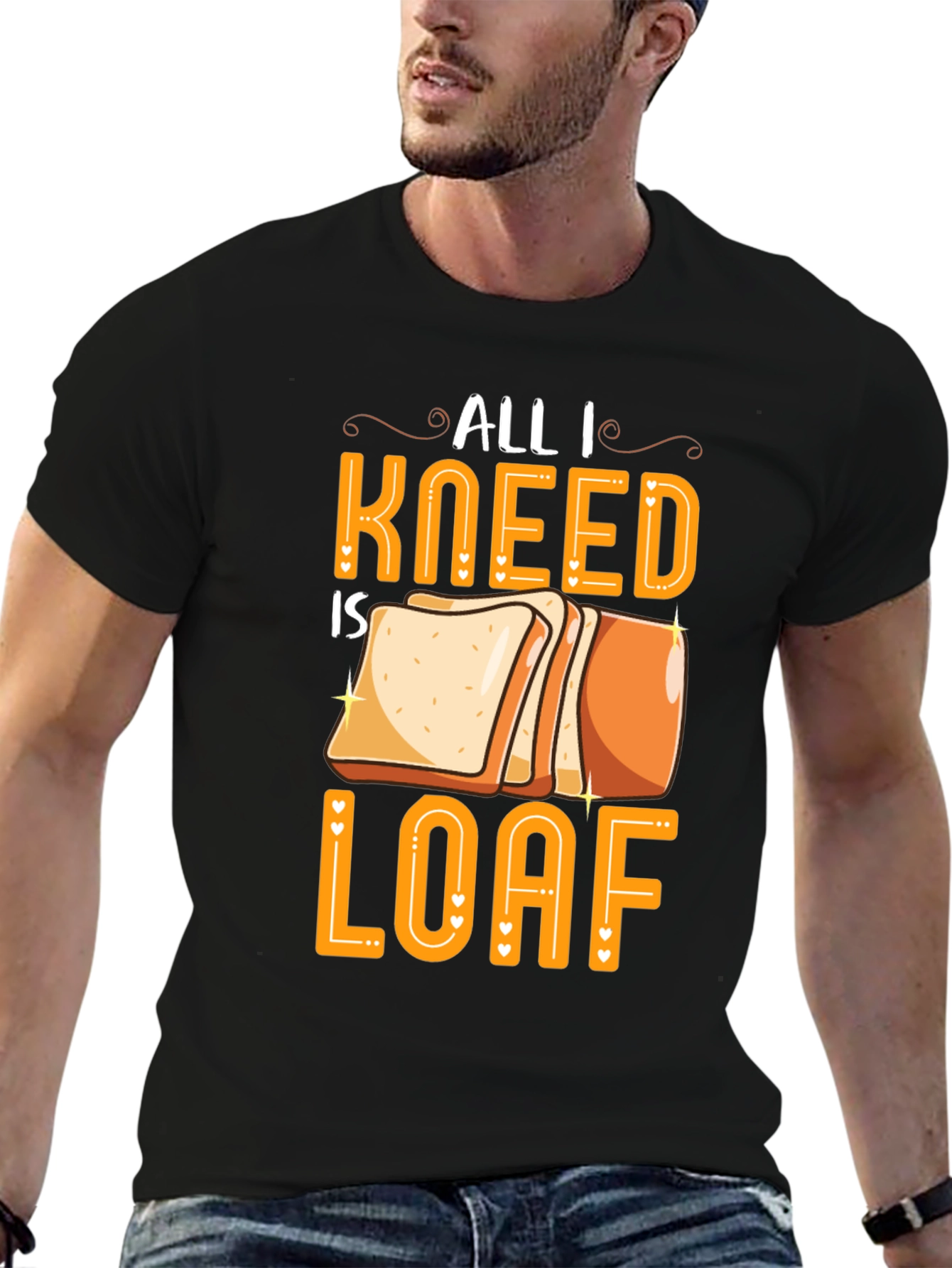 This eye-catching black t-shirt features a fun and playful graphic design. The design includes the phrase "All I Kneed is Loaf" in a bold, orange, slightly rounded font, accented with cute little hearts. The word "Kneed" is prominently displayed above an illustrated stack of bread slices, adding a visual pun to the message. Made from what appears to be a soft and comfortable material, this tee is perfect for casual wear. Its humorous design makes it a great conversation starter and a fun gift for bakers or bread lovers. Wear it while baking, out running errands, or just lounging around the house for a touch of whimsical style.