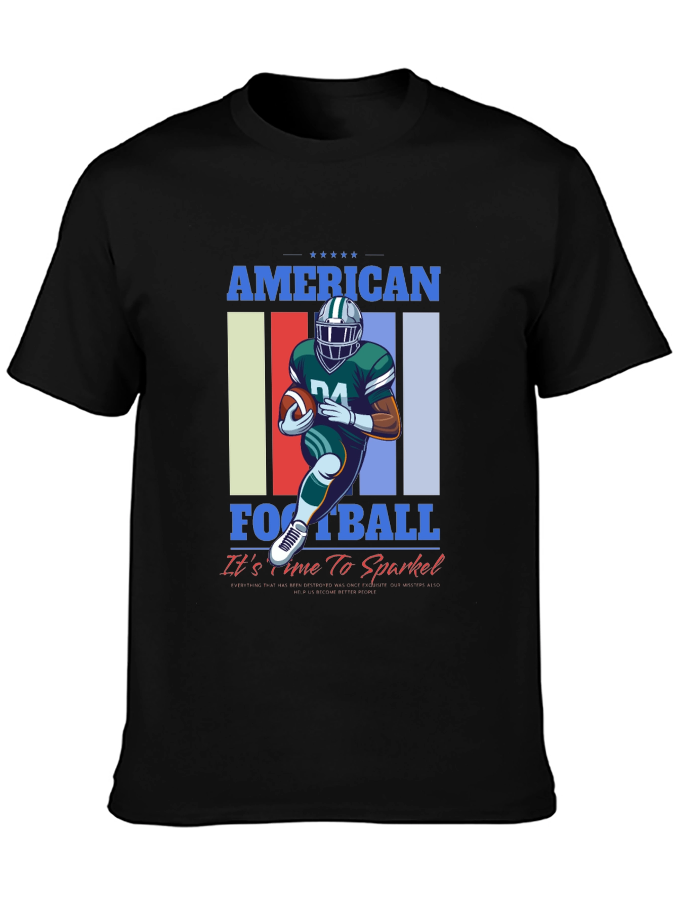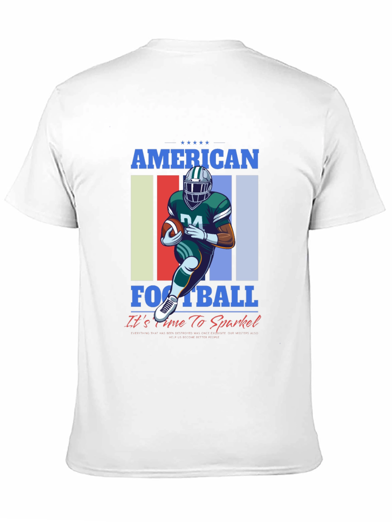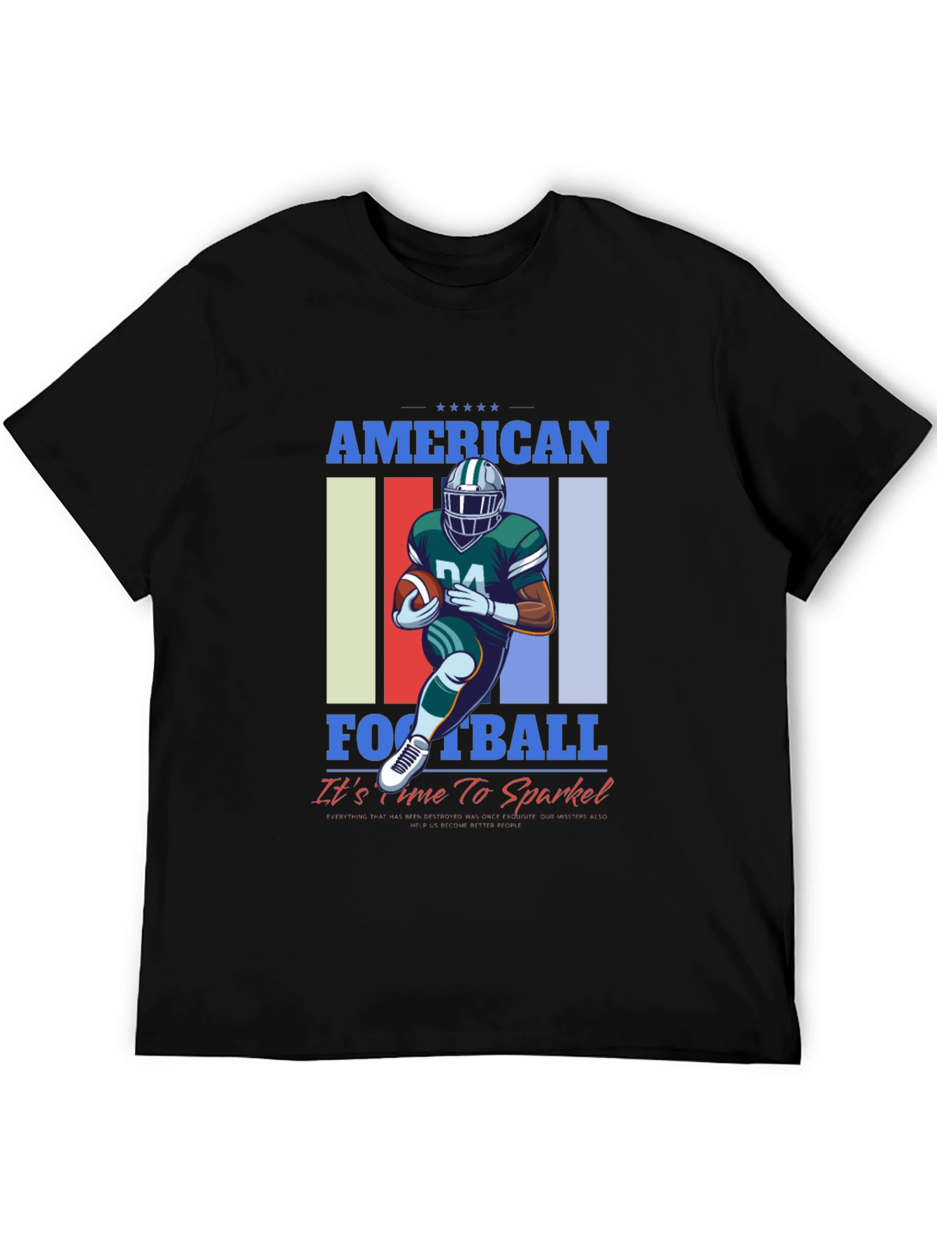 Show your love for American Football with this stylish graphic tee! The shirt features a vibrant design of a football player in action against a colorful striped backdrop. "AMERICAN FOOTBALL" is displayed prominently above and below the graphic with the phrase "It's time to Sparkle!" adding a touch of fun. Made from comfortable, breathable fabric, this tee is perfect for game day, workouts, or casual wear. Let your passion for football shine with this eye-catching t-shirt, it's sure to turn heads and start conversations. Wear your team colors and sparkle with pride!
