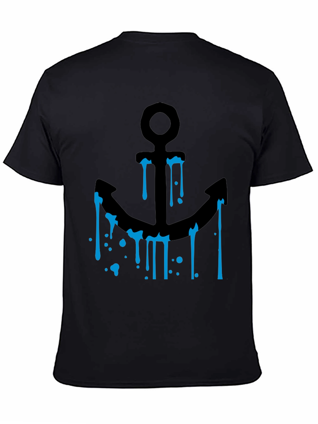 This stylish black t-shirt features a bold anchor graphic design. The anchor is depicted in black with dripping blue accents, giving it a modern and edgy feel. Made from comfortable, breathable fabric, this tee is perfect for casual wear. Whether you're hitting the beach, hanging out with friends, or just relaxing at home, this t-shirt is sure to make a statement. Show off your love for nautical themes with this unique and eye-catching piece. It's a great addition to any wardrobe and makes a fantastic gift for anyone who loves the sea.