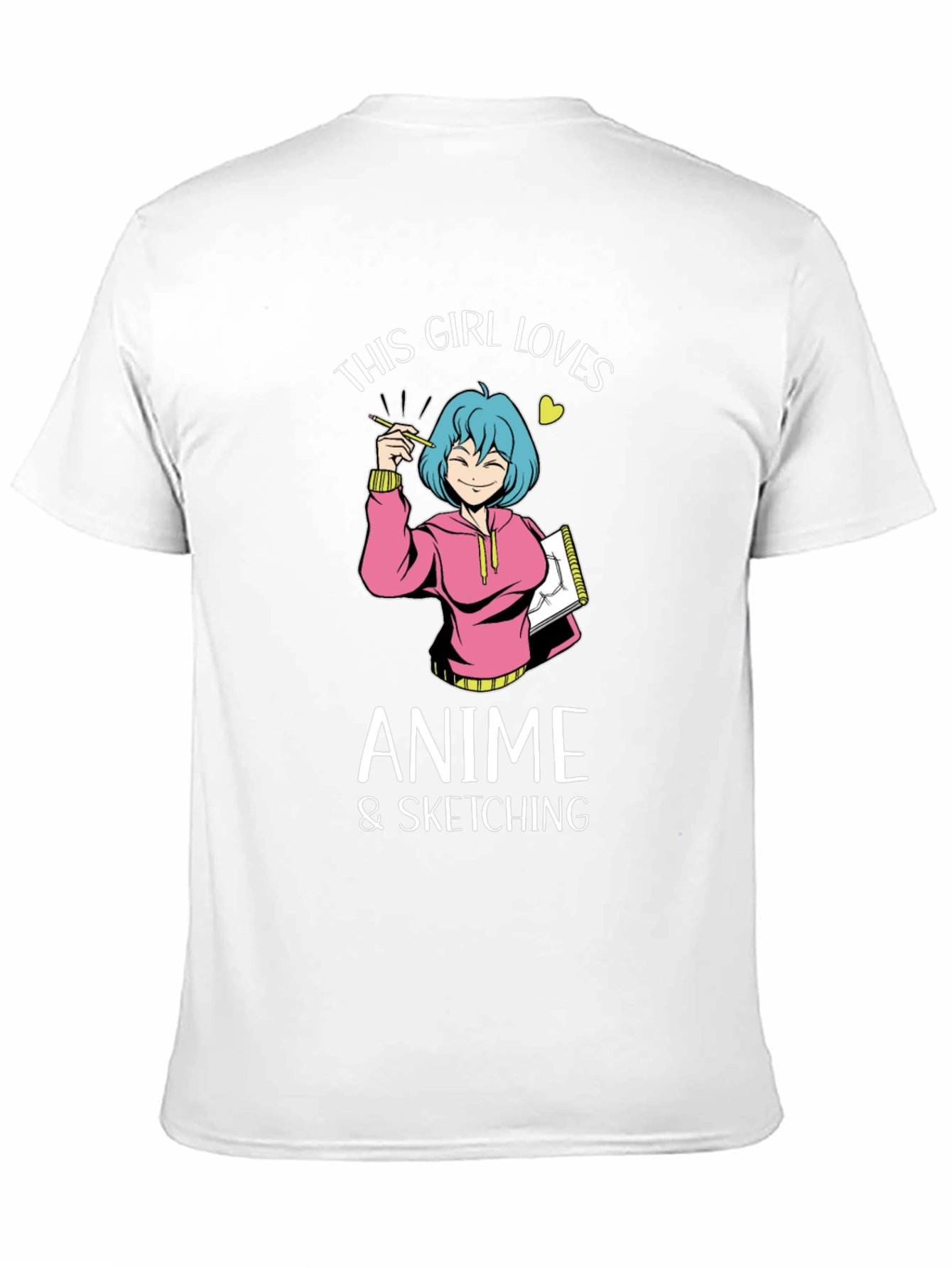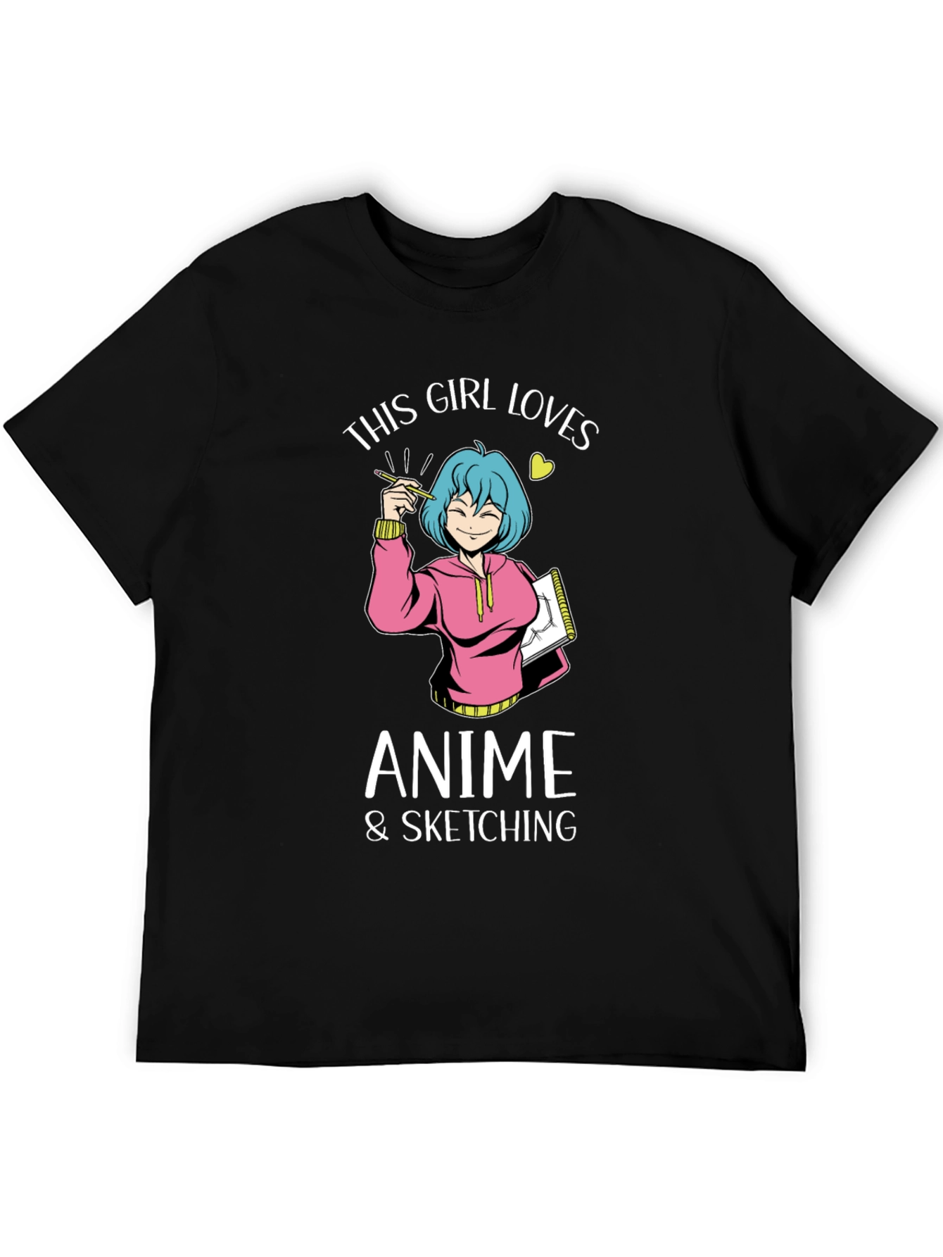 Show off your love for anime and sketching with this unique t-shirt! The design features an anime-style girl with blue hair, holding a pencil and sketchbook. She's wearing a cute pink hoodie, adding a pop of color to the black tee. Above her, the text 'THIS GIRL LOVES' is written, followed by 'ANIME & SKETCHING' underneath. This t-shirt is perfect for casual wear, anime conventions, or simply expressing your passion. Comfortable and stylish, it's a great addition to any anime lover's wardrobe. Get yours today and let the world know what you love!