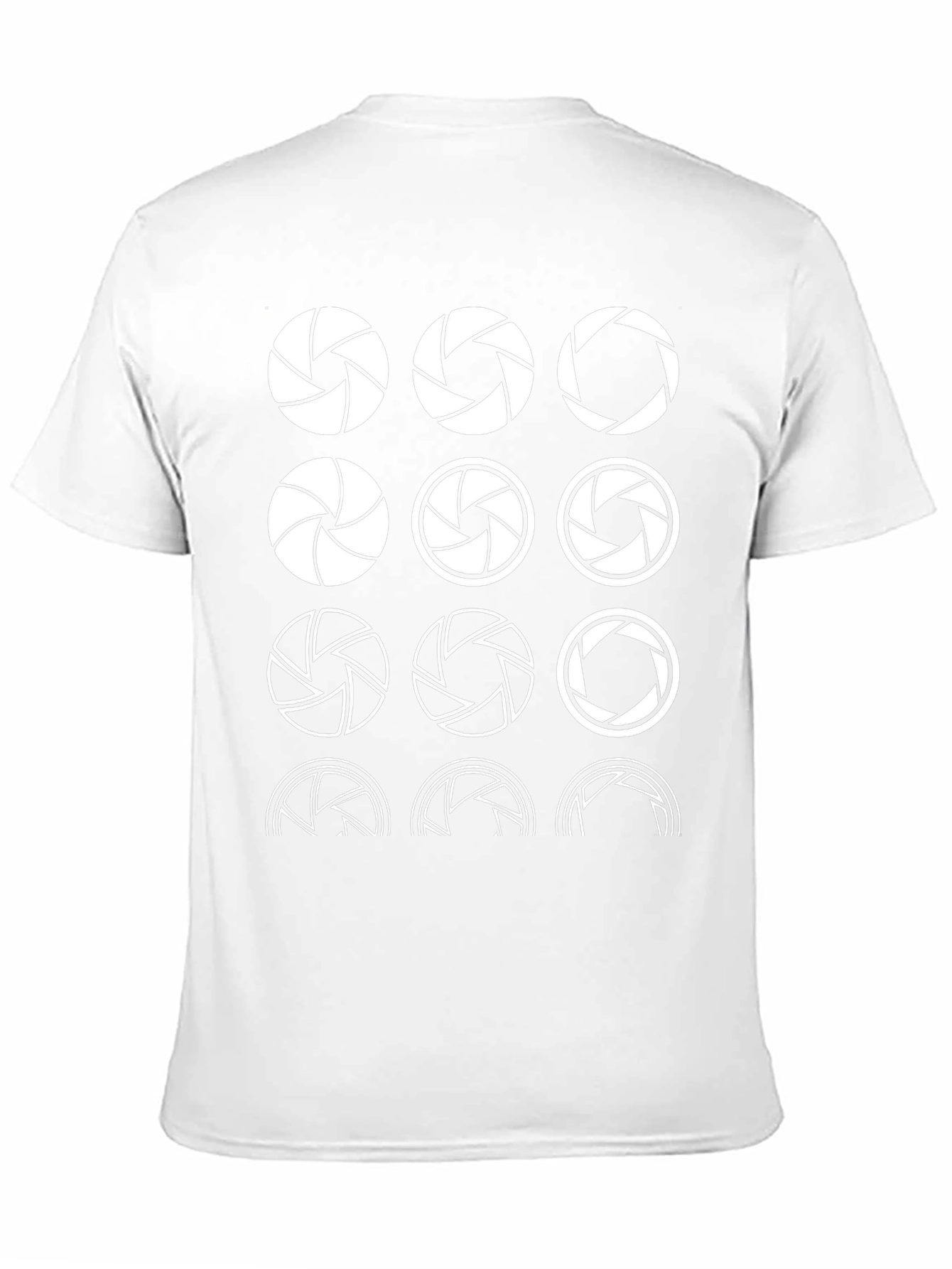 Capture attention with this striking black graphic t-shirt! The tee features a grid of white aperture designs, creatively showcasing the camera lens diaphragm in various stages of opening. Constructed from a comfortable-looking fabric, likely cotton or a cotton blend, this shirt offers both style and wearability. The design is bold and eye-catching, making it a great conversation starter for photographers, design enthusiasts, or anyone with an appreciation for unique graphics. Perfect for casual outings, photo shoots, or just expressing your creative side. Upgrade your wardrobe with this stand-out tee!