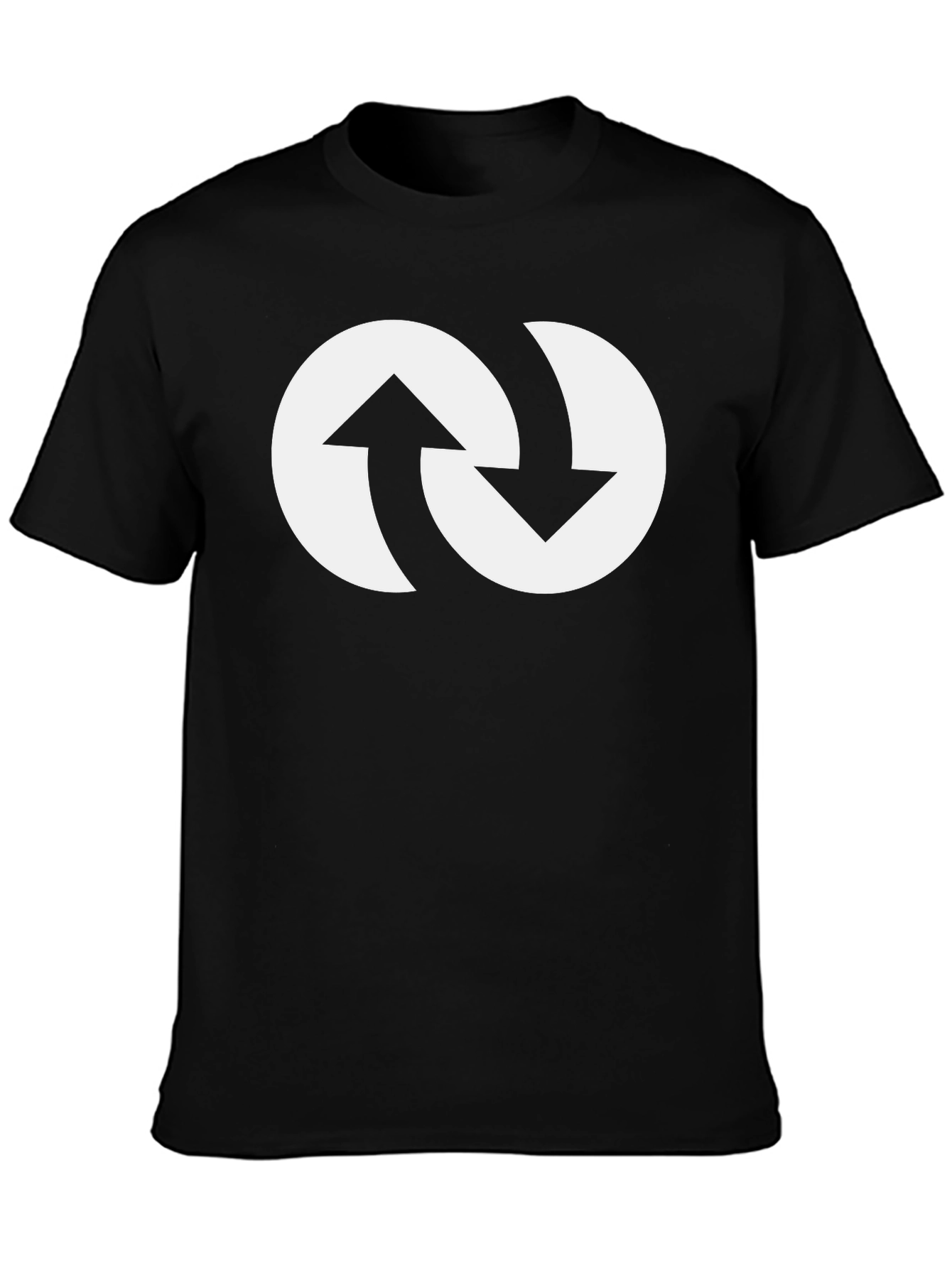 Showcase a unique style with this striking black t-shirt, featuring a bold white graphic design. The circular design incorporates dual arrows that loop and connect, creating a distinctive, eye-catching look. Made from comfortable cotton, this tee offers a relaxed fit perfect for casual wear. The short sleeves and classic crew neck make it a versatile addition to any wardrobe. Ideal for everyday wear, weekend outings, or as a statement piece, this t-shirt combines comfort and modern design seamlessly. Elevate your wardrobe with this must-have graphic tee.