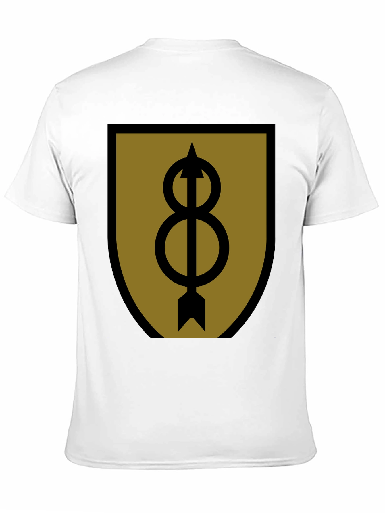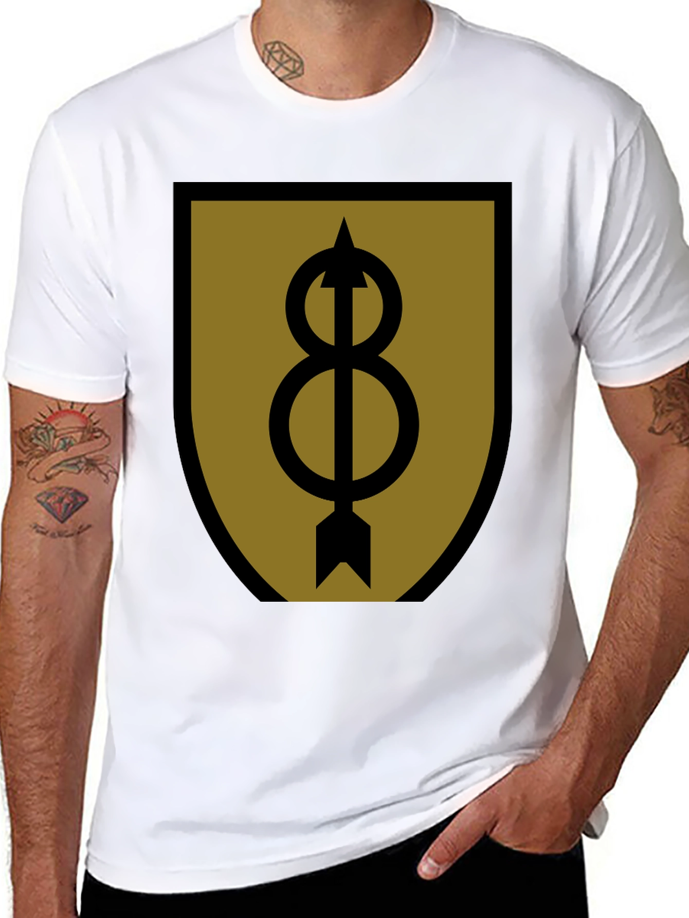 Showcase your unique style with this striking black t-shirt featuring a distinctive graphic print. The design boasts a shield shape with a brown-gold background and a bold black symbol: an arrow piercing through two intertwined circles, representing infinity. Crafted from what appears to be soft and breathable cotton, this tee offers both comfort and durability. The classic crew neck and short sleeves make it a versatile addition to any wardrobe. Perfect for casual outings, concerts, or simply expressing your individuality. Add a touch of edgy sophistication to your look with this eye-catching graphic t-shirt.