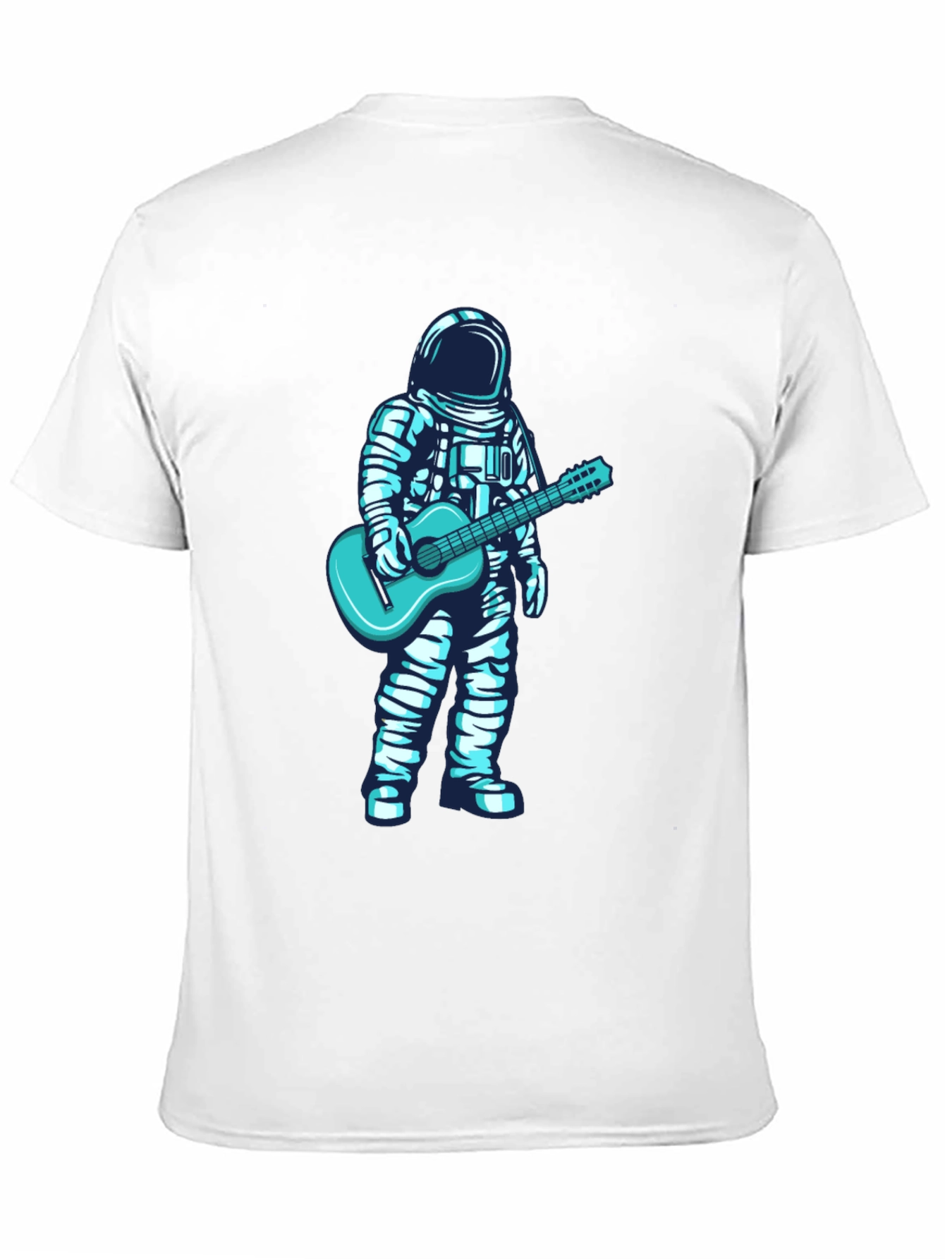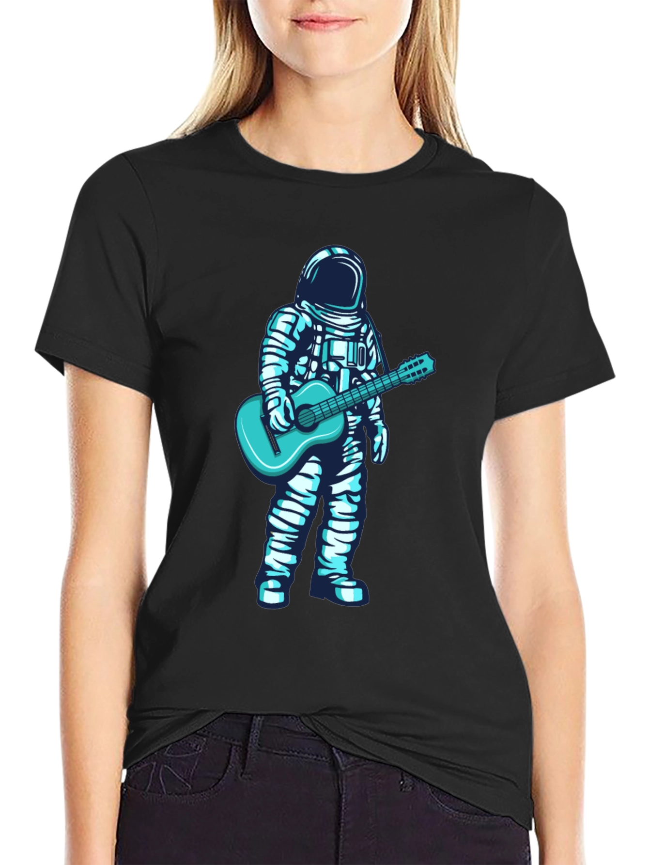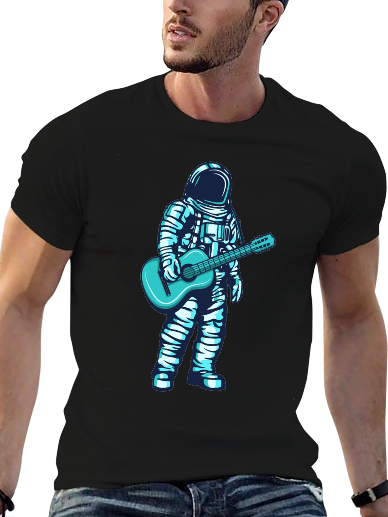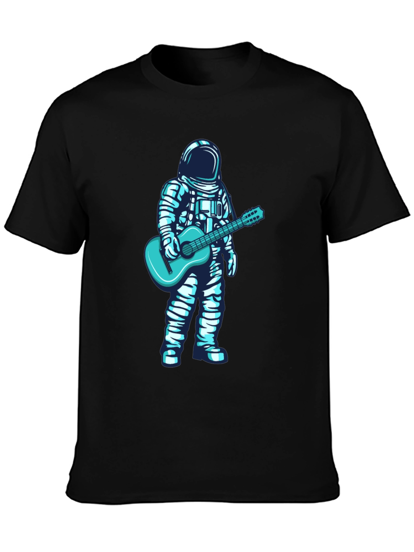 Show off your love for music and space with this unique graphic tee. This black t-shirt features a detailed, vibrant print of an astronaut playing a guitar. The design stands out, creating a fun and eye-catching look. Made from a soft, comfortable fabric, this tee is perfect for everyday wear. Ideal for casual outings, concerts, or just relaxing at home. Add a touch of cosmic style to your wardrobe with this must-have graphic tee. Makes a great gift for music lovers and space enthusiasts alike!