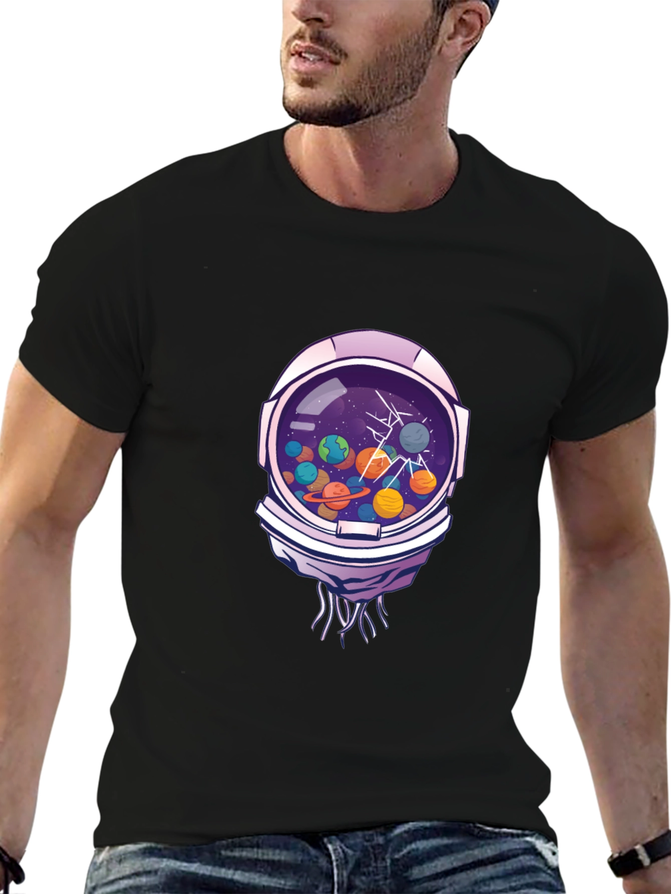 Explore the universe in style with this unique graphic t-shirt! Featuring a vibrant and eye-catching design of an astronaut helmet filled with colorful planets, this shirt is perfect for space enthusiasts and anyone who loves bold, creative apparel. The intricate details of the helmet and planets create a captivating visual effect that's sure to turn heads. Made from comfortable, breathable fabric, this t-shirt is ideal for everyday wear, casual outings, or even as a statement piece for special occasions. Add a touch of cosmic flair to your wardrobe and let your imagination soar with this must-have graphic tee!