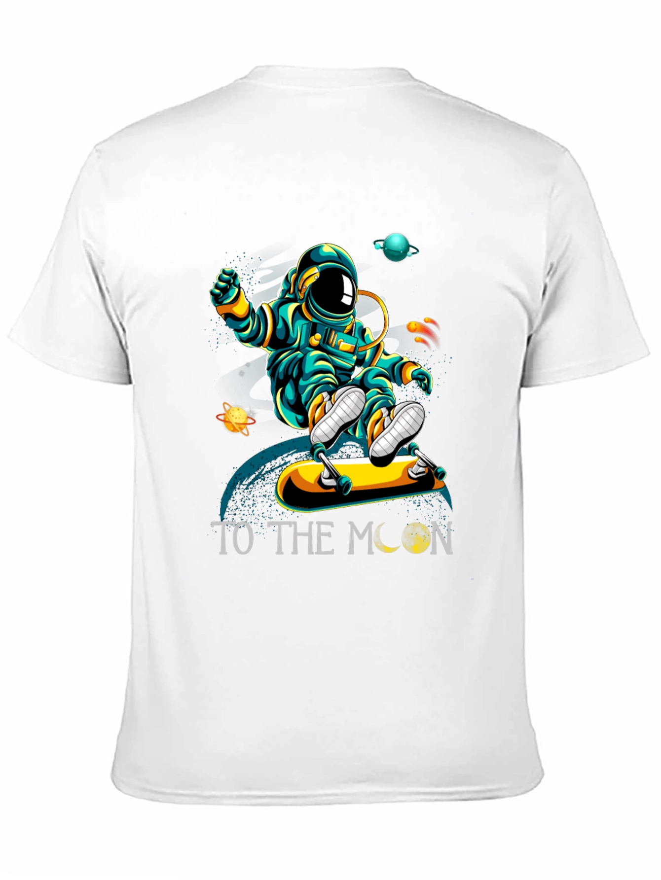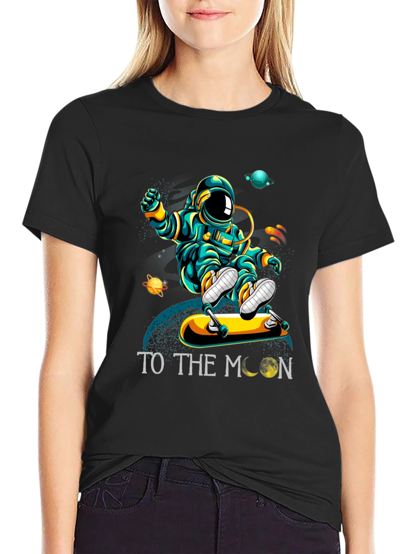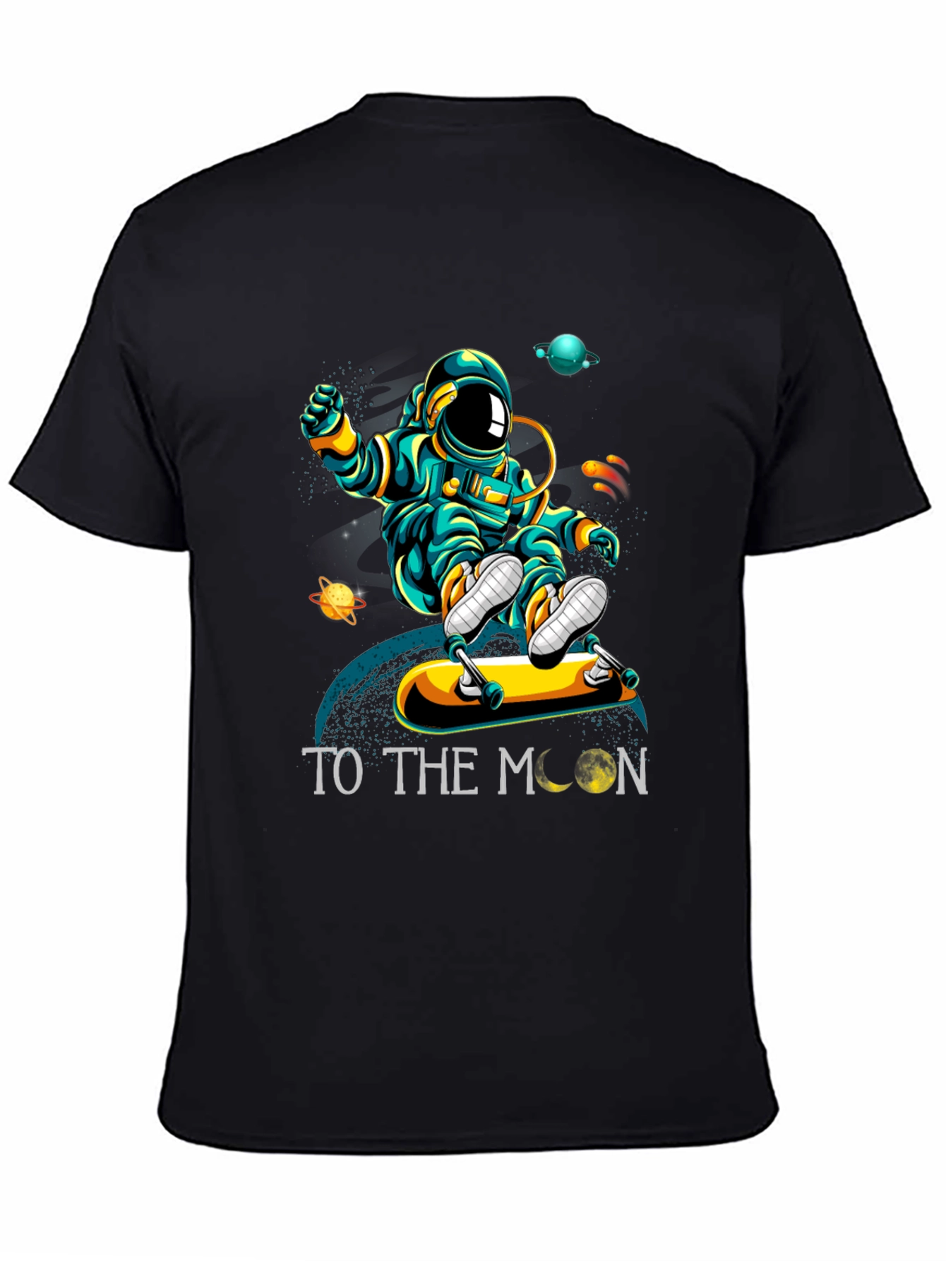 Reach for the stars with this unique Astronaut Skateboard T-shirt! Featuring a vibrant graphic of an astronaut riding a skateboard through space, complete with planets and cosmic details. The design incorporates the phrase "To The Moon," making it perfect for crypto enthusiasts or anyone with ambitious dreams. Made from a comfortable, likely cotton blend fabric, this black tee offers a classic fit suitable for everyday wear. Show off your adventurous spirit with this standout piece! Great for casual outings, skateboarding sessions, or a fun conversation starter.