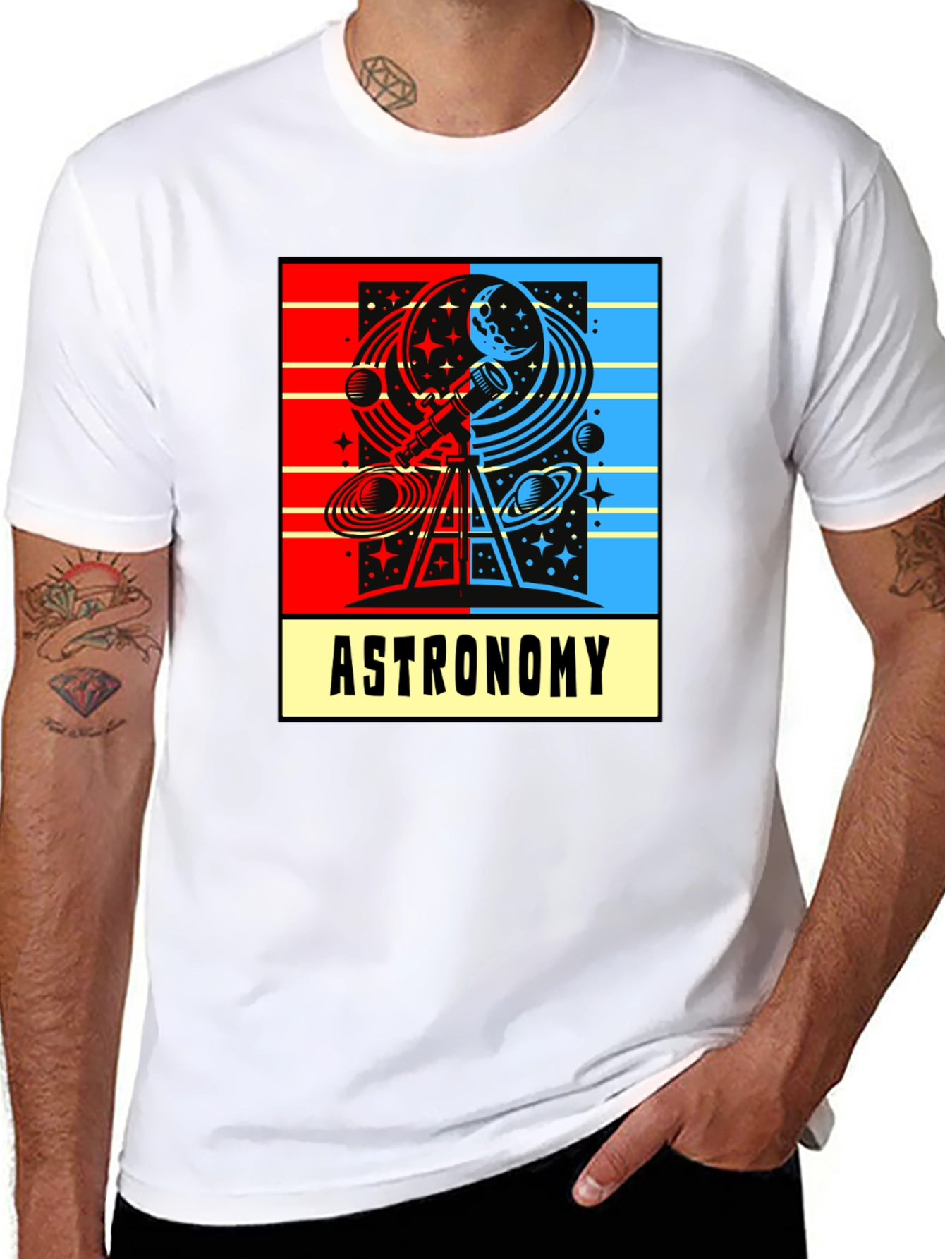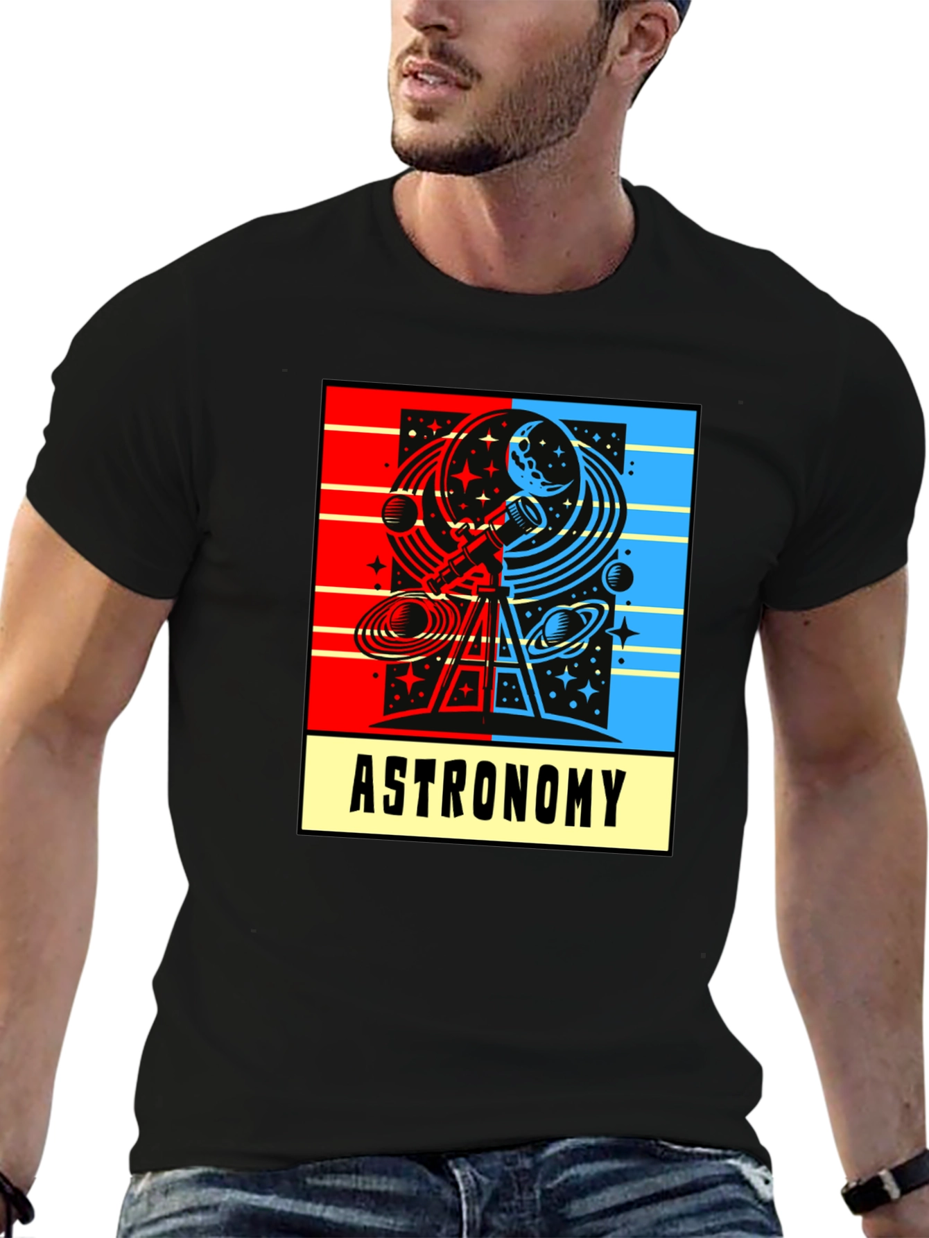 Explore the cosmos with this eye-catching astronomy t-shirt. The design features a vibrant, dual-tone graphic with a telescope, planets, stars, and celestial patterns. The word "ASTRONOMY" is clearly printed below the graphic.The shirt appears to be made from soft, comfortable cotton or a cotton blend, perfect for everyday wear. The design is both fun and educational, making it a great conversation starter. Wear it casually, to astronomy club meetings, or while stargazing. It's a stylish way to express your love for space and science. Makes a great gift for astronomers, students, and space enthusiasts alike!