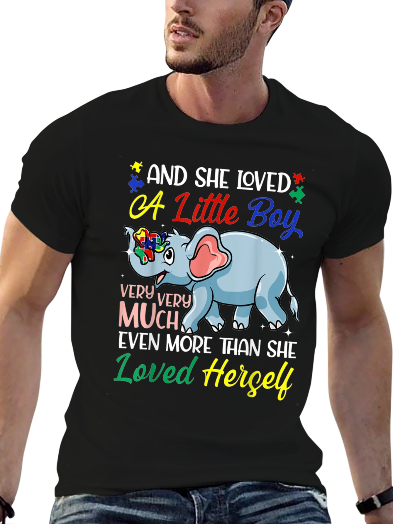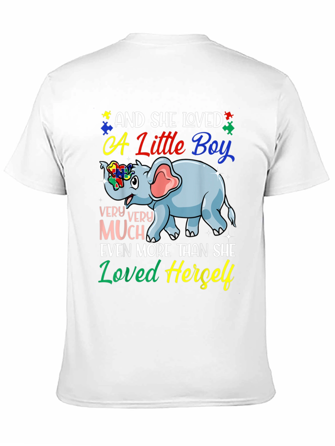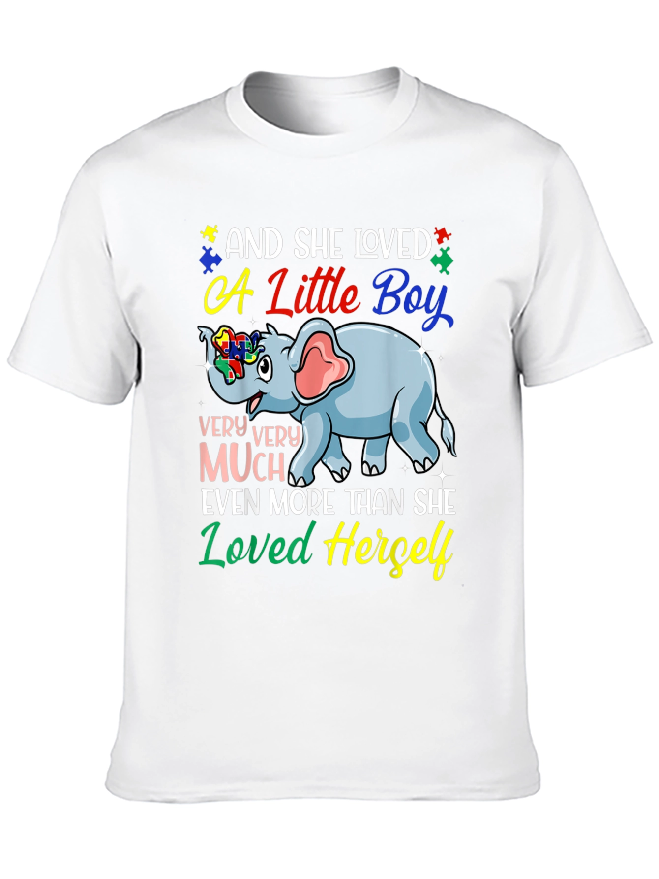 Show your love and support with this heartwarming t-shirt. This black tee features a colorful design including an adorable blue elephant with puzzle piece details symbolizing autism awareness. The heartfelt message "And She Loved a Little Boy VERY VERY MUCH Even More Than She Loved Herself" is printed in vibrant, eye-catching fonts. Made from a comfortable material, this shirt is perfect for everyday wear, autism awareness events, or as a thoughtful gift for a loving mother. Spread positivity and support with this meaningful t-shirt that speaks volumes.
