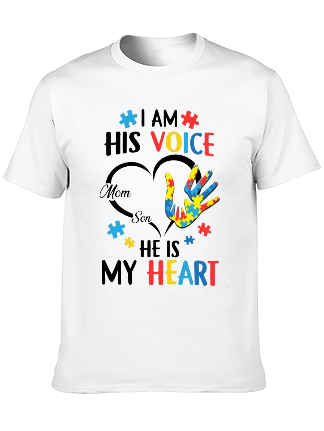 Show your support with this heartwarming autism awareness t-shirt. Crafted from comfortable material, this black tee features the phrase "I AM HIS VOICE, HE IS MY HEART", interwoven with puzzle pieces, a recognizable symbol for autism awareness. The design incorporates a hand filled with colorful puzzle pieces, surrounded by hearts. Perfect for parents, family members, or allies looking to spread awareness and promote acceptance. Wear it to walks, events, or simply as a daily reminder of love and support. A stylish and meaningful way to make a difference!