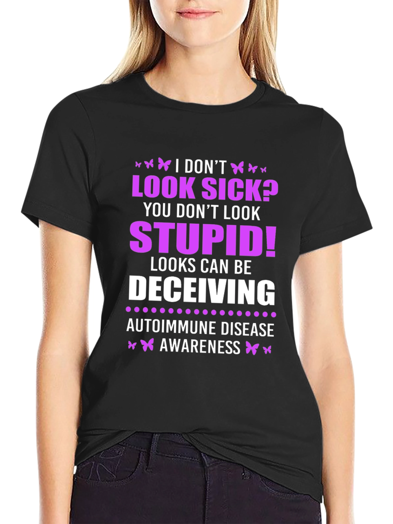 Show your support with this powerful black t-shirt. The design features the phrase "I DON'T LOOK SICK? YOU DON'T LOOK STUPID! LOOKS CAN BE DECEIVING" in bold, eye-catching white and purple text, adorned with butterfly accents. It also states “Autoimmune Disease Awareness.” Ideal for raising awareness and sparking conversations. Perfect for casual wear and awareness events. Get yours now and make a statement!