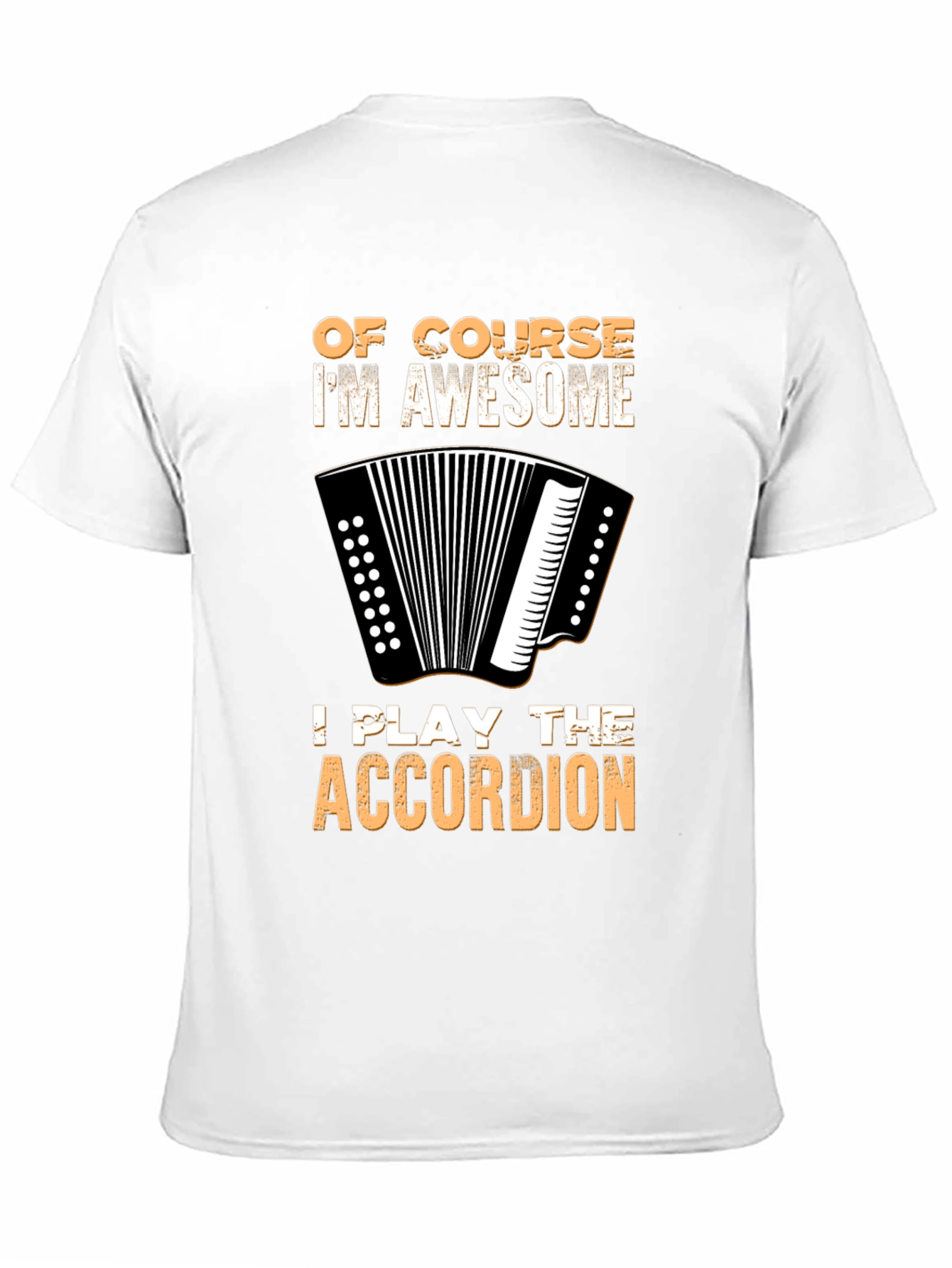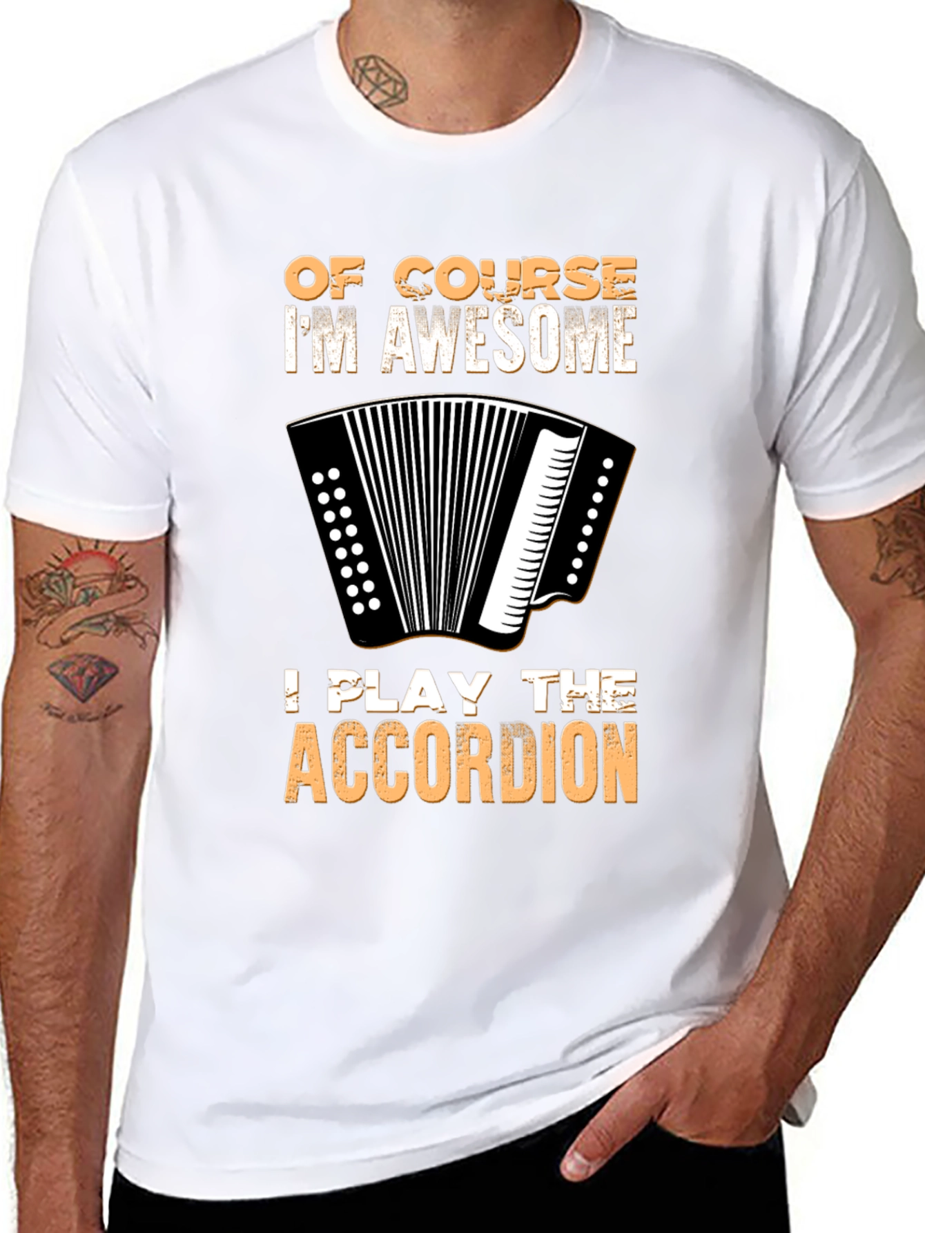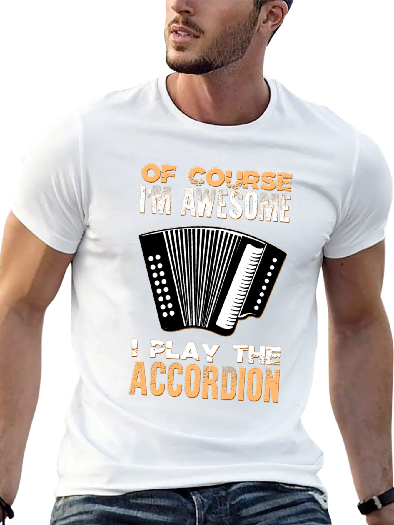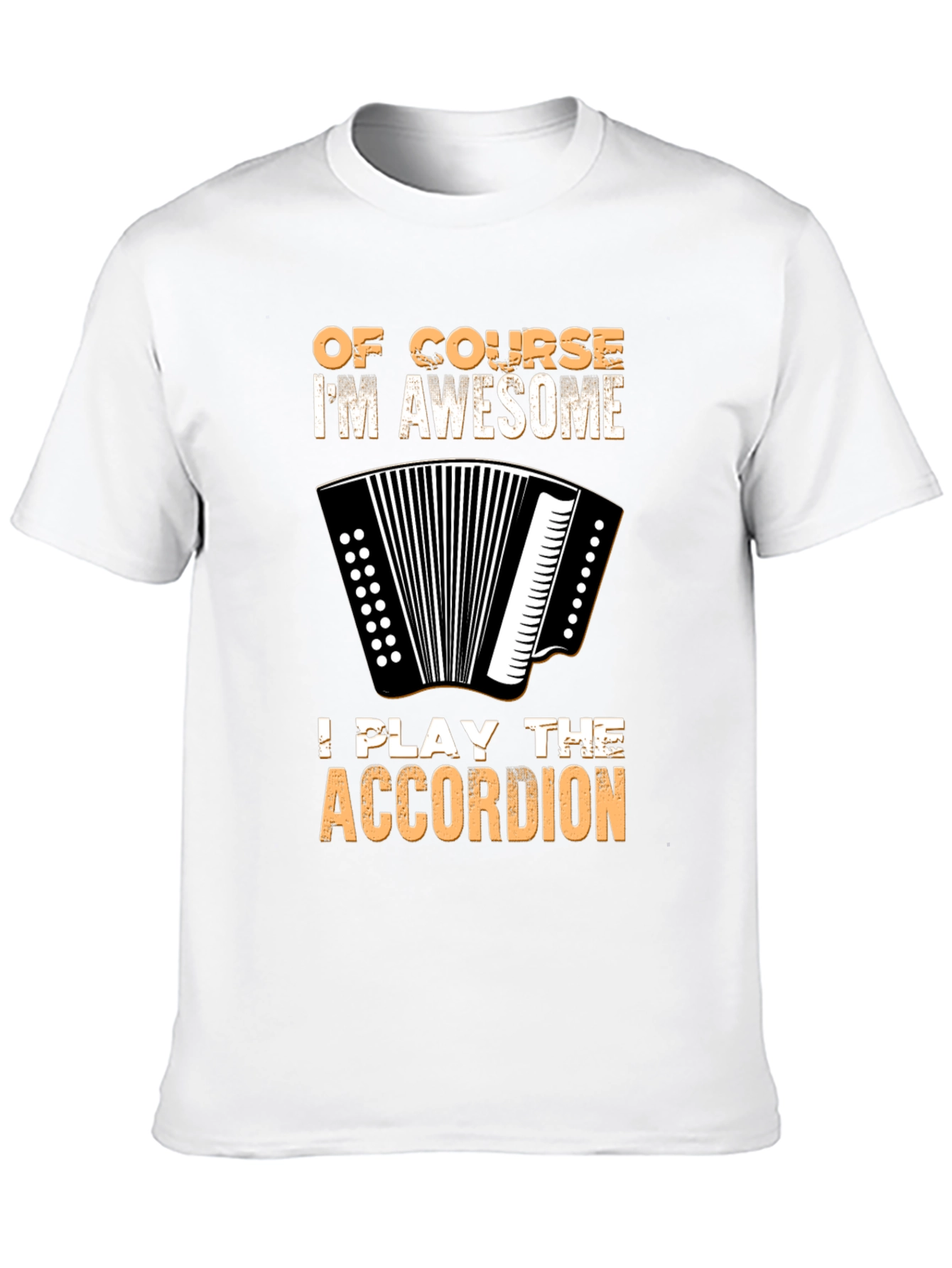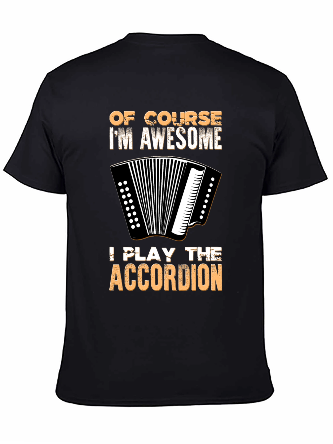 Show off your love for music with this awesome accordion-themed t-shirt! This black t-shirt features the text "OF COURSE I'M AWESOME I PLAY THE ACCORDION" accompanied by a graphic of an accordion in the center. The design is printed in a bold orange color, giving it a cool and eye-catching look. Made from comfortable material, this short-sleeved shirt is perfect for casual wear, concerts, or music events. A great way to express your personality and musical talent! Makes a great gift for accordion players and music enthusiasts.
