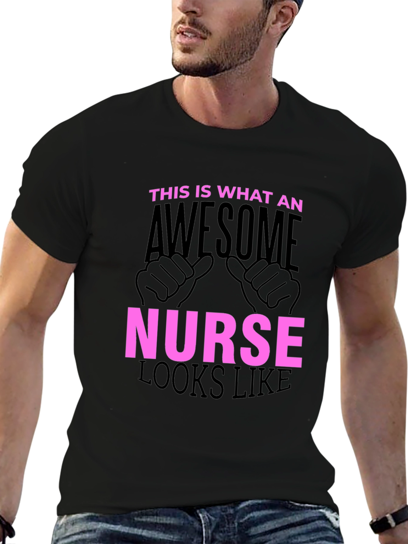 Show your appreciation for nurses with this stylish black t-shirt. Made from comfortable cotton, this tee features a bold graphic print that reads "This is What an Awesome Nurse Looks Like" in eye-catching pink and black lettering. The thumbs-up illustrations add a fun and positive vibe. Perfect for nurses to wear at work, during casual outings, or as a thoughtful gift. This shirt is a great way to celebrate the dedication and hard work of nurses everywhere. Stand out and make a statement with this unique and comfortable tee!