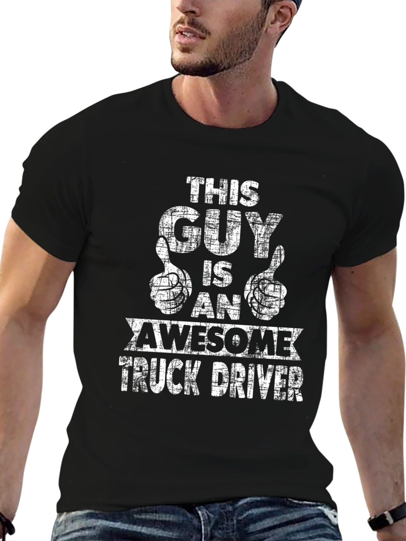 Show off your profession with this stylish black graphic tee! This eye-catching shirt features the text "This Guy Is An Awesome Truck Driver" in a distressed white font. The design includes thumbs-up symbols, giving it a fun and playful touch. Crafted from a comfortable material, this t-shirt is perfect for everyday wear, whether you're on the road or relaxing at home. It makes a great gift for the truck driver in your life. Stand out and let everyone know you're proud of what you do with this cool and unique t-shirt.