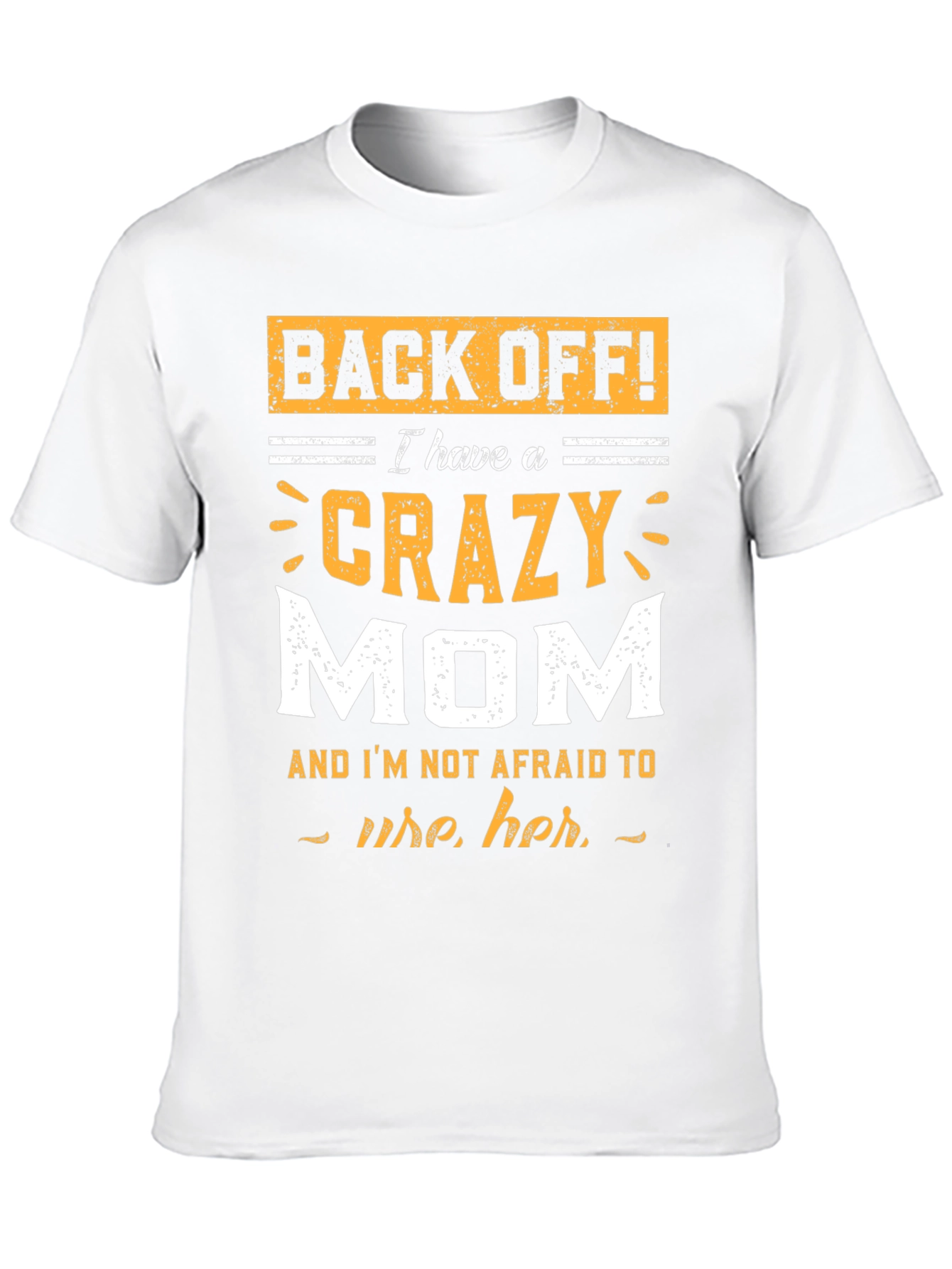 Show your love and appreciation for your mom with this bold black graphic t-shirt! The design features a humorous statement: "BACK OFF! I have a CRAZY MOM and I'M NOT AFRAID to use her." in a distressed, eye-catching yellow and white font. This short-sleeved tee is perfect for casual wear. Great for expressing your unique style and sending a clear message. Whether you're running errands or hanging out with friends, this tee is sure to get a laugh and show off your bond with your awesome mom. Get yours today and wear it with pride!