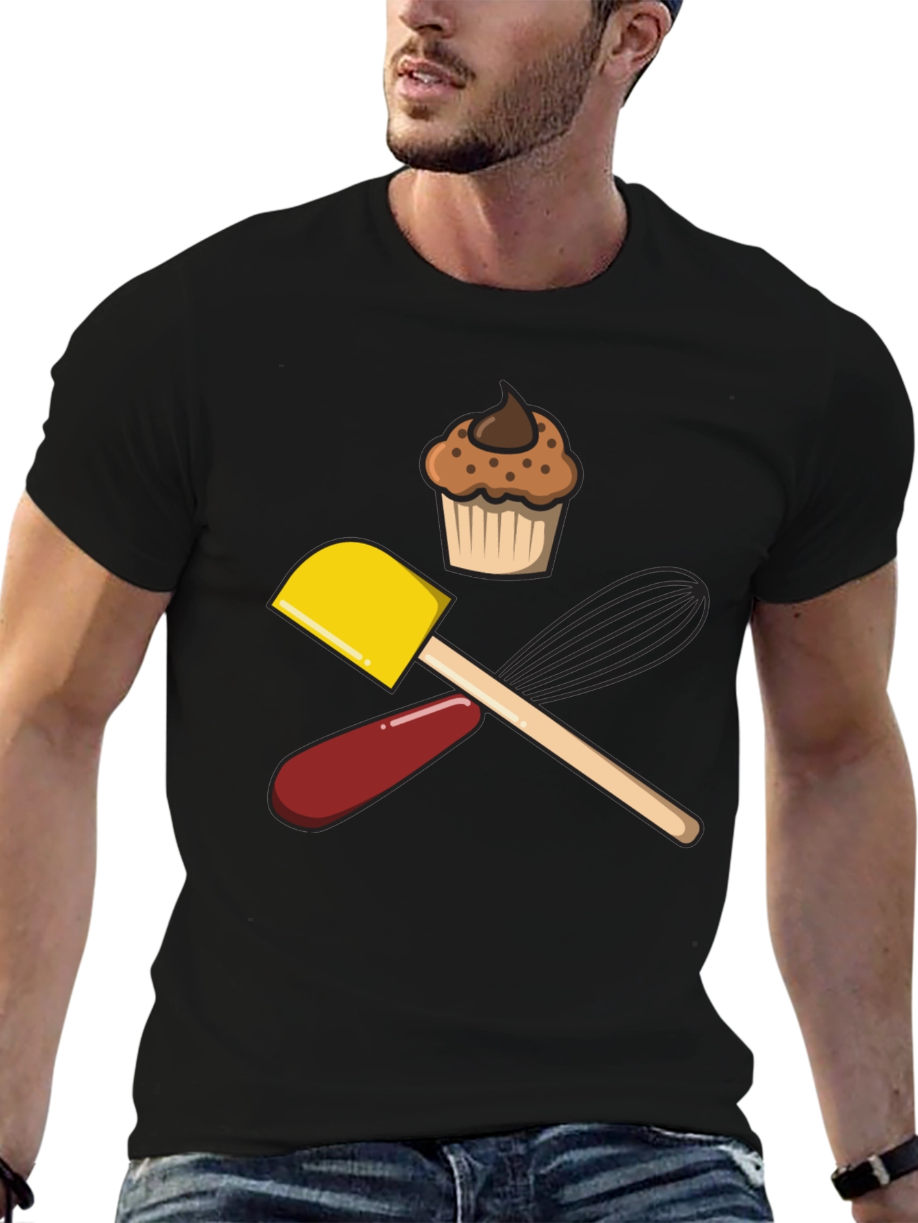 Show off your love for baking with this unique T-shirt! This comfortable black tee features a playful design with a cupcake, spatula, whisk, and red cooking tool. The design is colorful and eye-catching, making it the perfect shirt for a baker. Whether you're whipping up a batch of cookies or perfecting your pastry skills, this shirt is the perfect way to express your passion. It's a great gift for bakers or anyone who enjoys spending time in the kitchen. Get yours today and let everyone know you're a baking enthusiast!