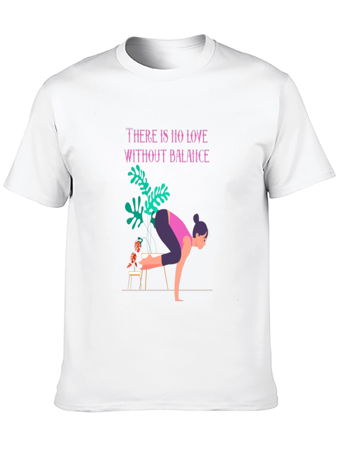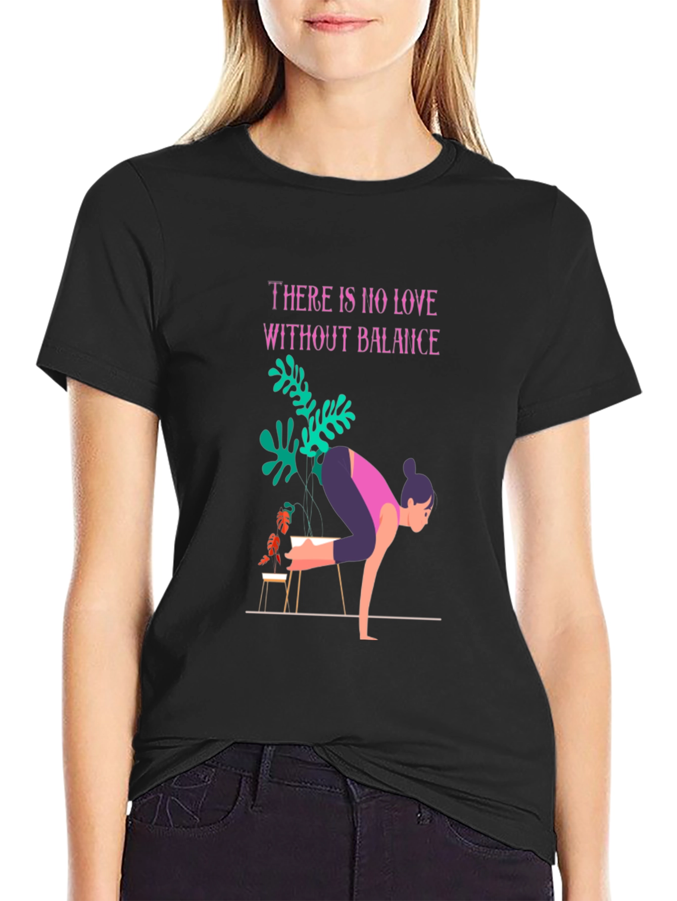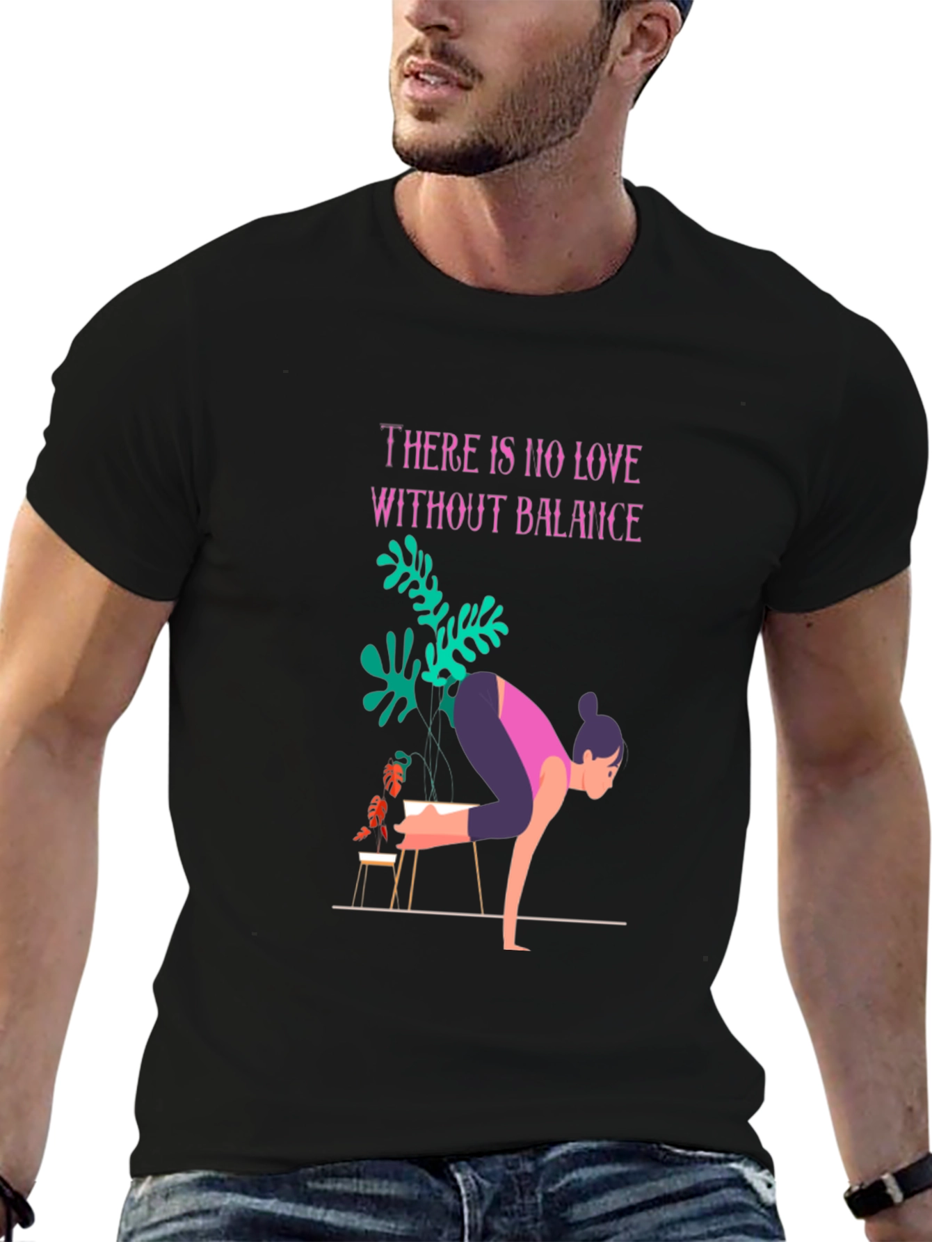 Find your inner peace with this unique graphic tee. Crafted from soft, breathable black cotton, this t-shirt features a stylish design incorporating a yoga pose figure, lush green plants, and an inspiring message: "There is no love without balance." The vibrant colors and modern artwork make this a standout piece. Perfect for yoga enthusiasts, plant lovers, or anyone seeking a touch of zen in their everyday style. Comfortable, eye-catching, and effortlessly cool, it's ideal for casual wear, studio sessions, or relaxed weekends. Express your passion for balance and wellbeing with this artistic t-shirt.