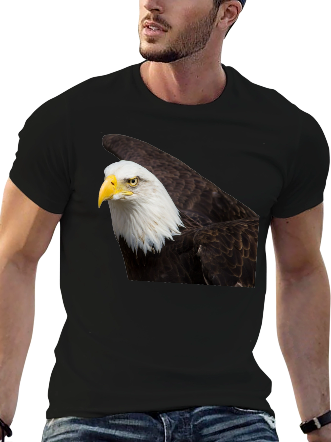 Show your patriotic side with this bold black t-shirt featuring a striking image of a bald eagle. The realistic graphic captures the majestic beauty of this iconic bird of prey, with its sharp yellow beak and intense gaze. This tee is perfect for everyday wear, casual outings, or as a statement piece for those who appreciate wildlife and American pride. Made from comfortable material, it's soft to the touch and great for layering. Add this unique shirt to your wardrobe and let your style take flight!