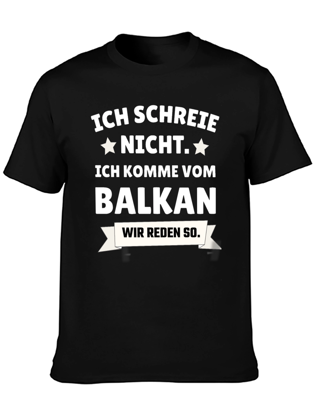 Show off your Balkan pride with this bold black t-shirt! The design features the phrase "Ich Schreie Nicht. Ich Komme Vom Balkan. Wir Reden So." in crisp white lettering, complete with star accents. This classic tee is perfect for casual wear, cultural events, or as a unique gift. Express your heritage with style and make a statement wherever you go. Durable construction ensures lasting comfort and a great fit.