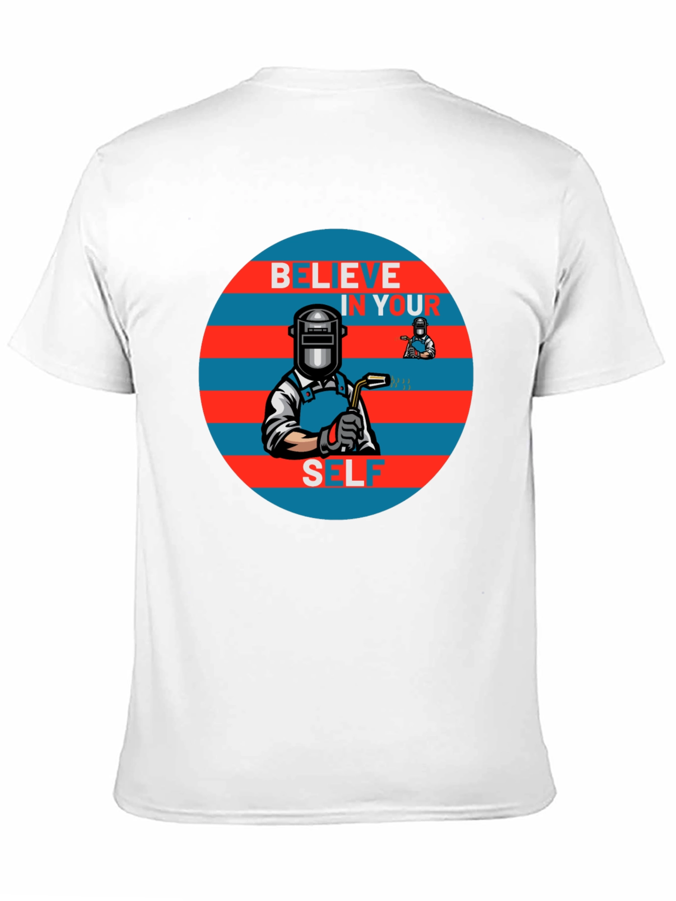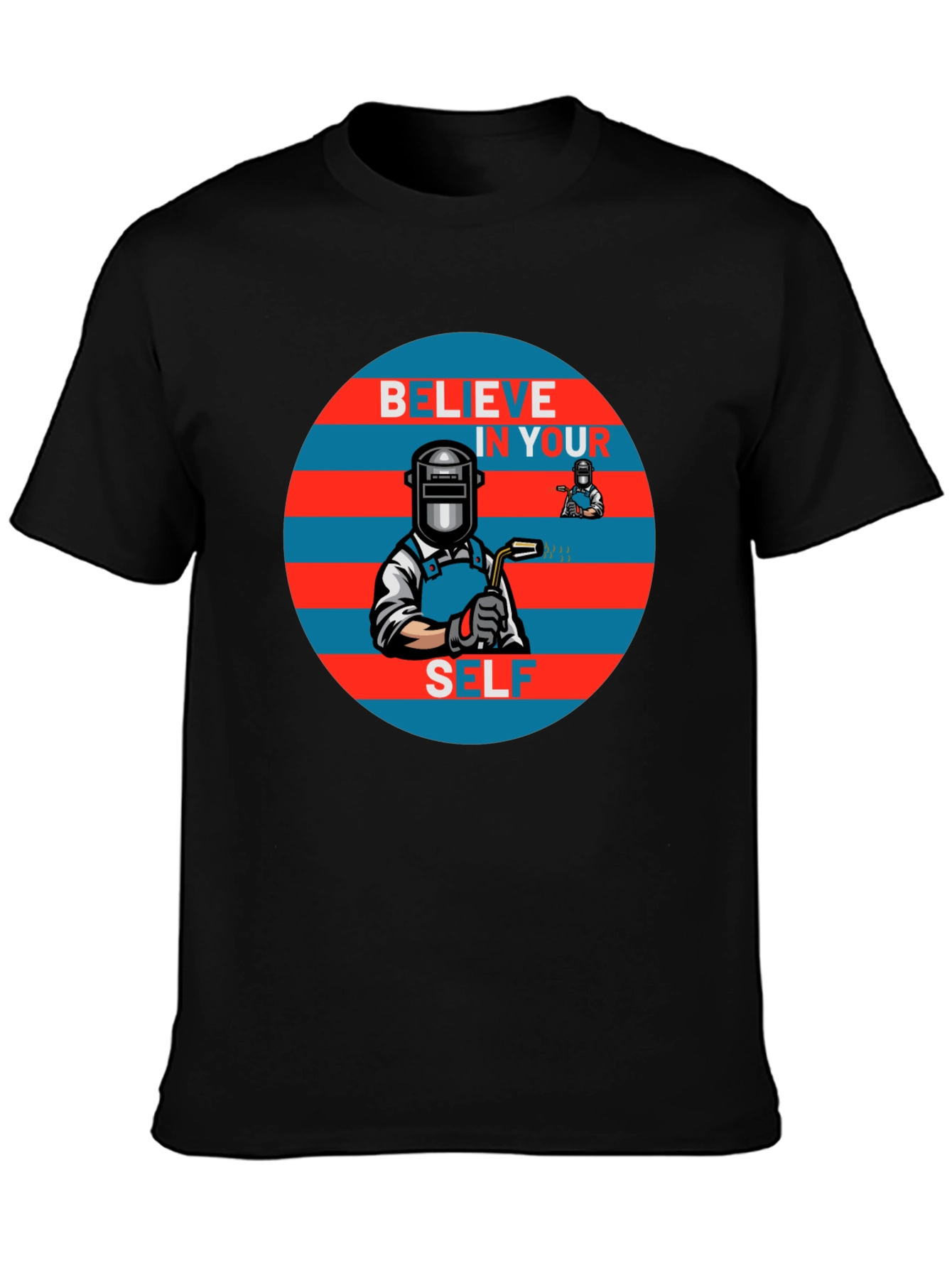 Show your support for welders with this unique graphic tee! The black t-shirt features a striking design of a welder in a mask, set against a red and blue striped circle with the words "Believe In Yourself". The design is eye-catching, perfect for everyday wear or as a gift for the welder in your life. Made from comfortable materials, this t-shirt is both stylish and practical. It is perfect for casual outings or wearing on the job. Get yours now and show off your passion!