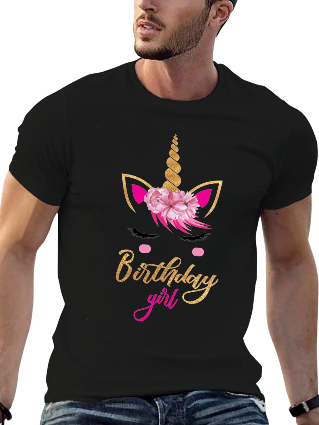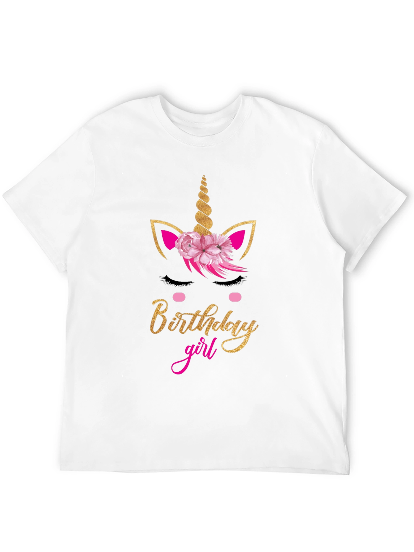 Celebrate in style with this adorable "Birthday Girl" t-shirt! The black tee features a delightful graphic of a gold glittery unicorn with a pink floral crown. The words "Birthday" are also displayed in matching gold glitter above the pink script that says, "girl". This festive shirt is perfect for birthday parties and photo opportunities. This tee is soft and comfortable, perfect for all-day wear. Make your birthday celebration extra special with this charming and memorable t-shirt!