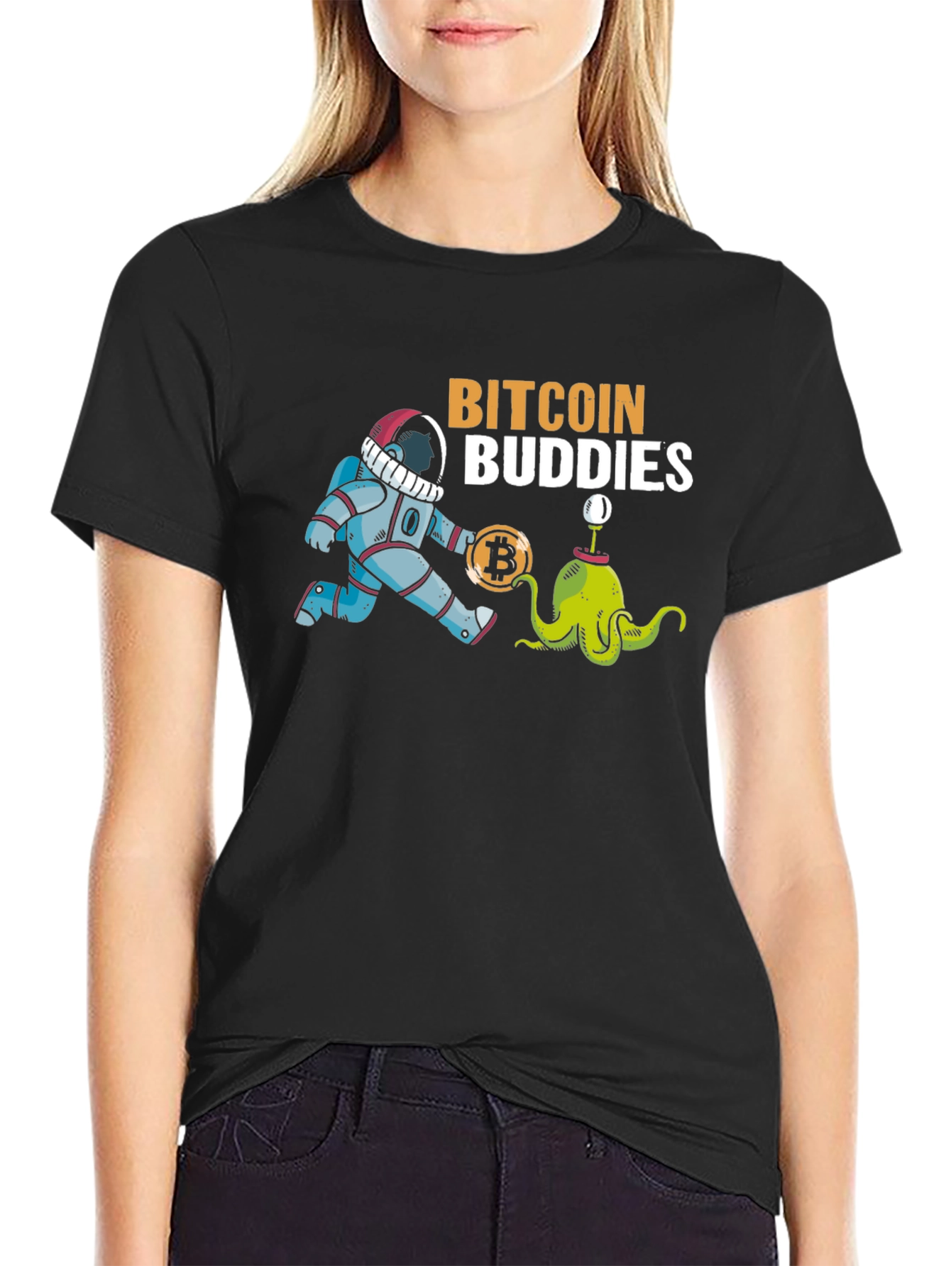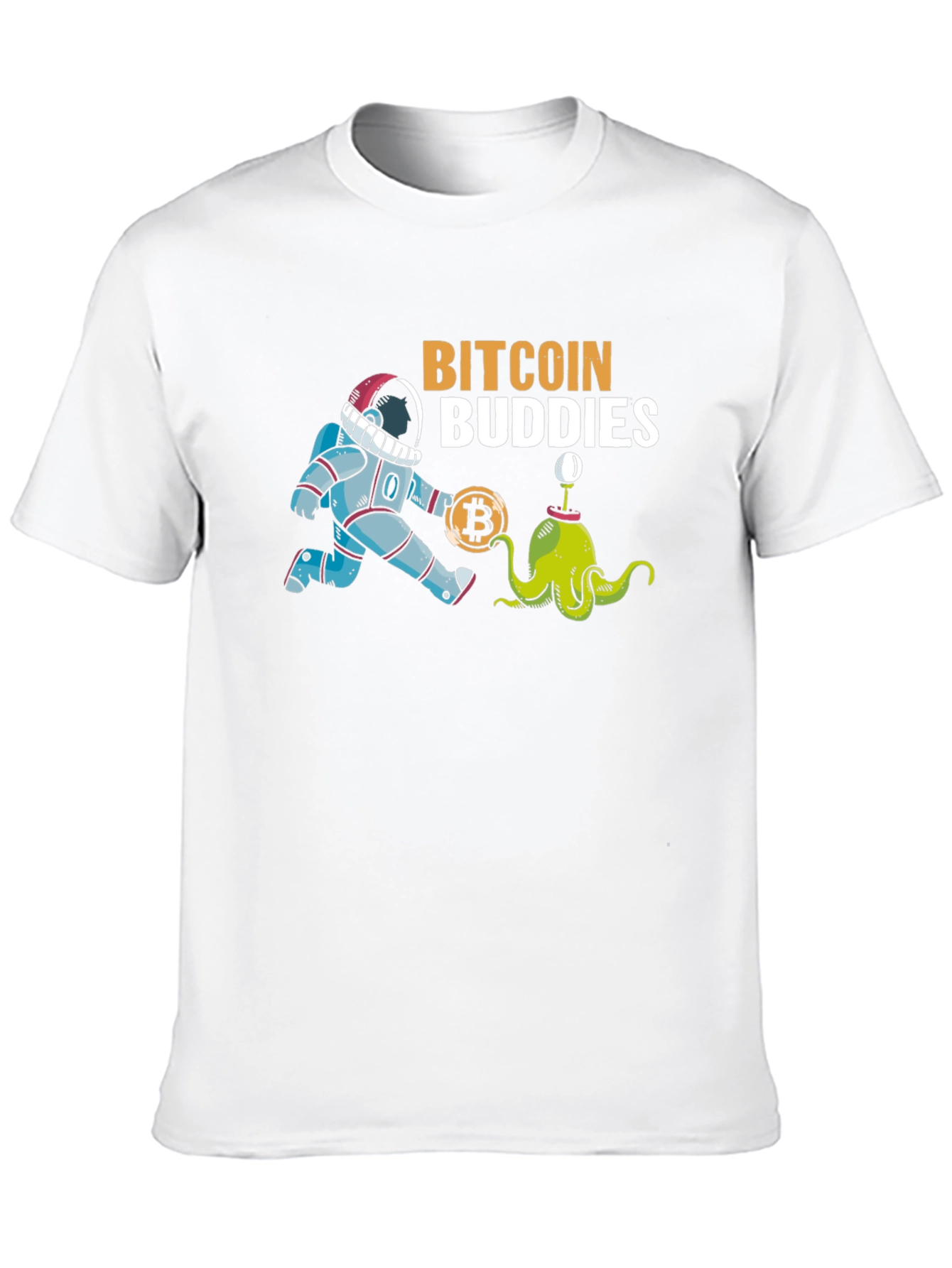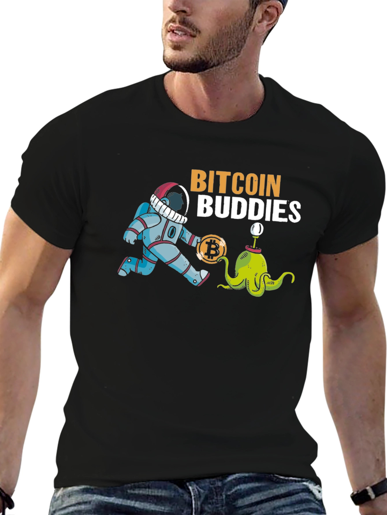 Show off your love for cryptocurrency with this unique graphic tee. The black t-shirt features a playful design with an astronaut and a cartoon alien creature, alongside a bitcoin symbol, and the text "Bitcoin Buddies." This shirt is perfect for casual wear, crypto meetups, or as a fun gift for bitcoin enthusiasts. Made from comfortable materials, this t-shirt ensures a great fit and long-lasting wear. Add some personality to your wardrobe with this cool crypto tee!