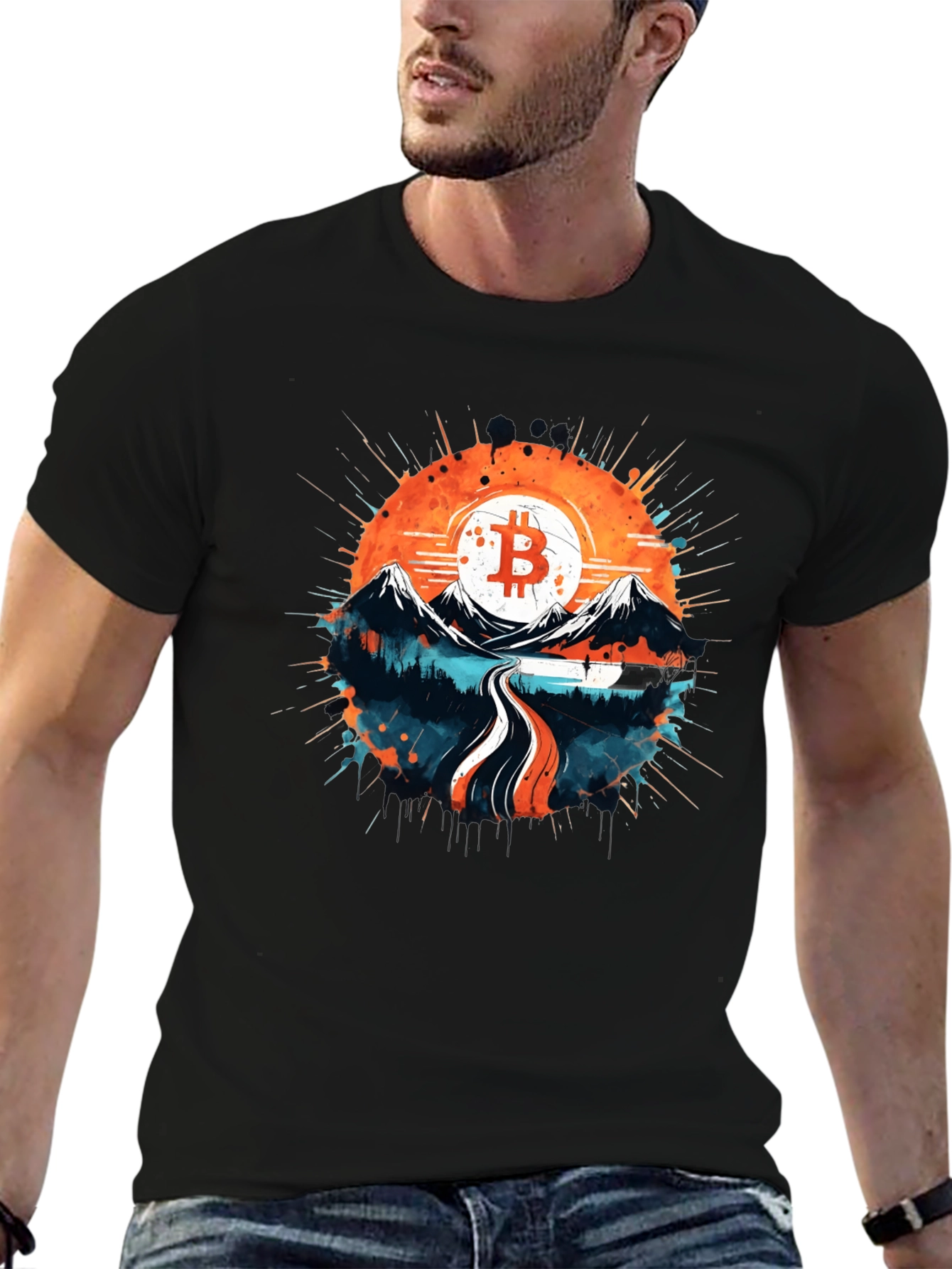 Elevate your style with this eye-catching black graphic tee featuring a unique Bitcoin-inspired design. The shirt showcases a vibrant landscape with mountains, a winding road, and a Bitcoin logo set against a sun-like backdrop. Perfect for crypto enthusiasts, this tee is made from comfortable fabric ideal for casual wear or making a statement. Stand out from the crowd and express your passion for Bitcoin with this trendy and comfortable shirt.