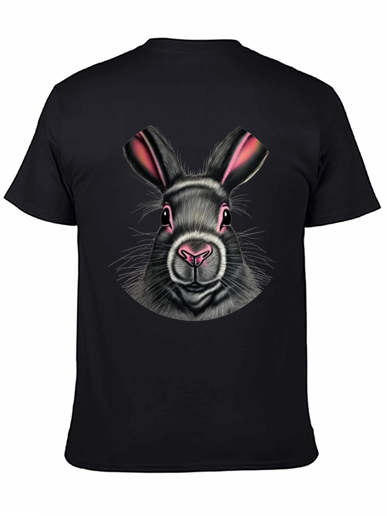 Show off your love for animals with this stylish black t-shirt featuring an adorable rabbit graphic. The shirt showcases a detailed, realistic-looking bunny with striking pink accents on the ears and nose. Made from a comfortable-looking fabric, this tee is perfect for casual wear, adding a touch of playful charm to any outfit. Whether you're heading to a picnic, running errands, or just relaxing at home, this rabbit t-shirt is a versatile and eye-catching choice. Get yours today and hop into style!