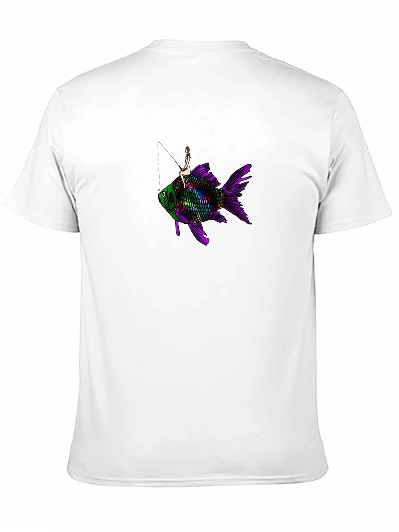 This black t-shirt features a captivating and surreal design. A woman appears to be riding atop a large, colorful fish. The fish is predominantly green and purple with a rainbow-like effect adding a touch of fantasy. The shirt has a classic crew neck and short sleeves, suggesting a comfortable and casual fit. This tee would make a statement piece in any wardrobe and could be worn for everyday outings or as a conversation starter at social events. The graphic is eye-catching and unique, appealing to those with an appreciation for the unusual and artistic.