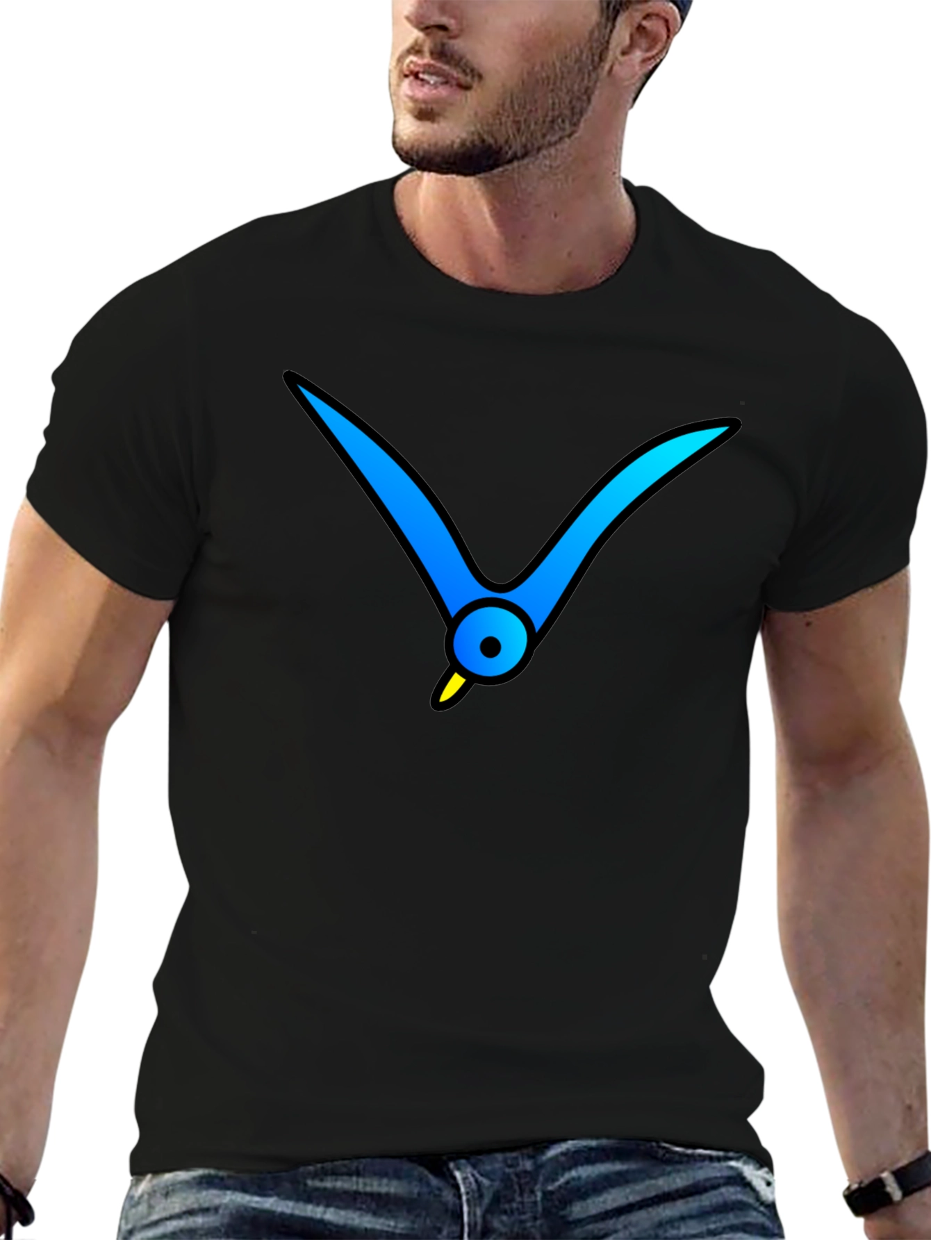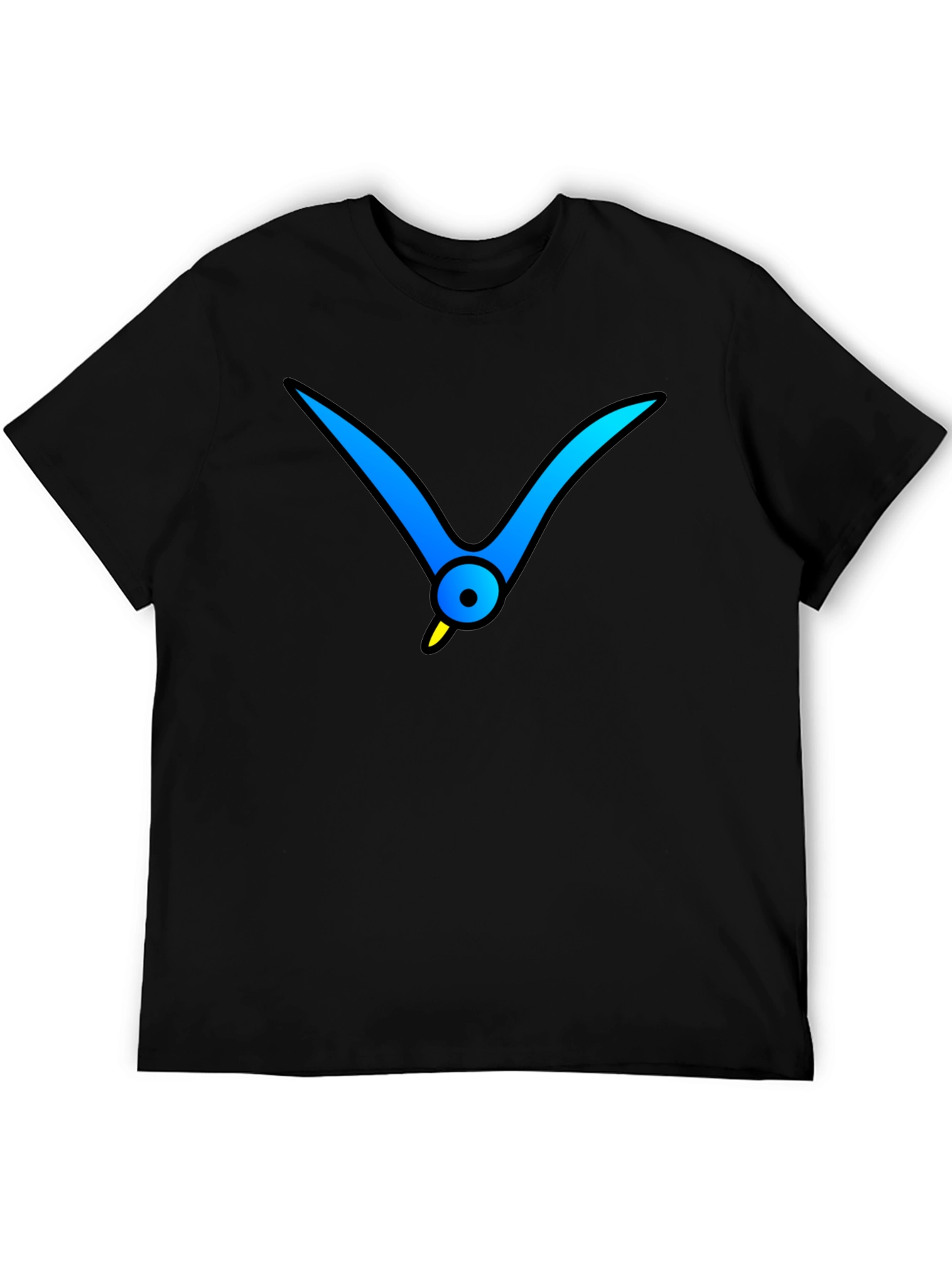 Show off your unique style with this eye-catching black t-shirt. Featuring a vibrant, abstract graphic of a blue bird with a yellow beak, this shirt is sure to turn heads. The design offers a modern and artistic twist on a classic wardrobe staple. Made from a soft, comfortable fabric, this t-shirt is perfect for everyday wear. Dress it up with jeans for a casual night out, or wear it with shorts for a relaxed weekend look. Make a statement with this must-have tee!