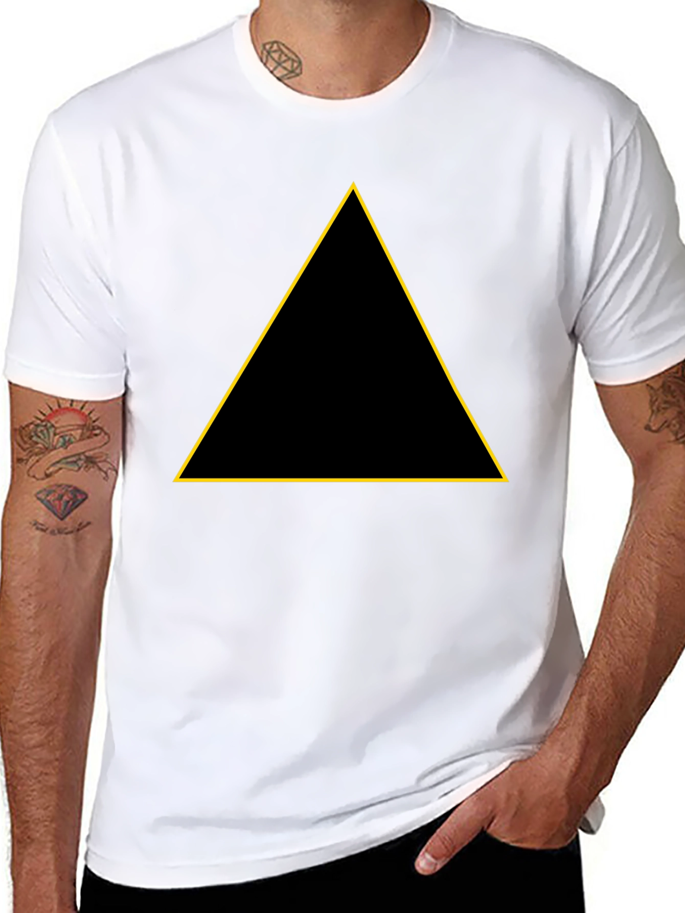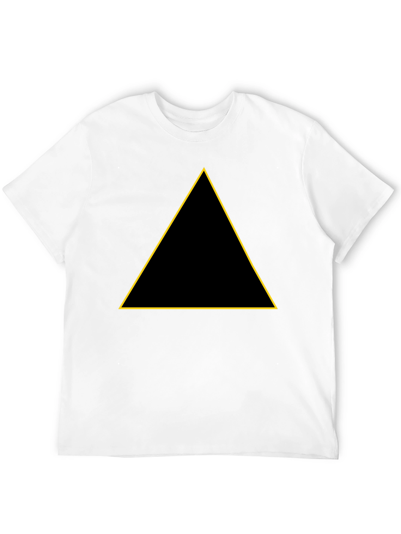 This classic black t-shirt features a bold, golden triangle design that adds a modern, minimalist touch. The shirt appears to be made of a soft, comfortable material, perfect for everyday wear. Its simple yet stylish design makes it versatile for various occasions, whether you're heading to a casual outing or just relaxing at home. The contrasting golden triangle creates a striking visual appeal, making it a standout piece in your wardrobe. Pair it with jeans or shorts for a relaxed look, or dress it up with a blazer for a more refined style.