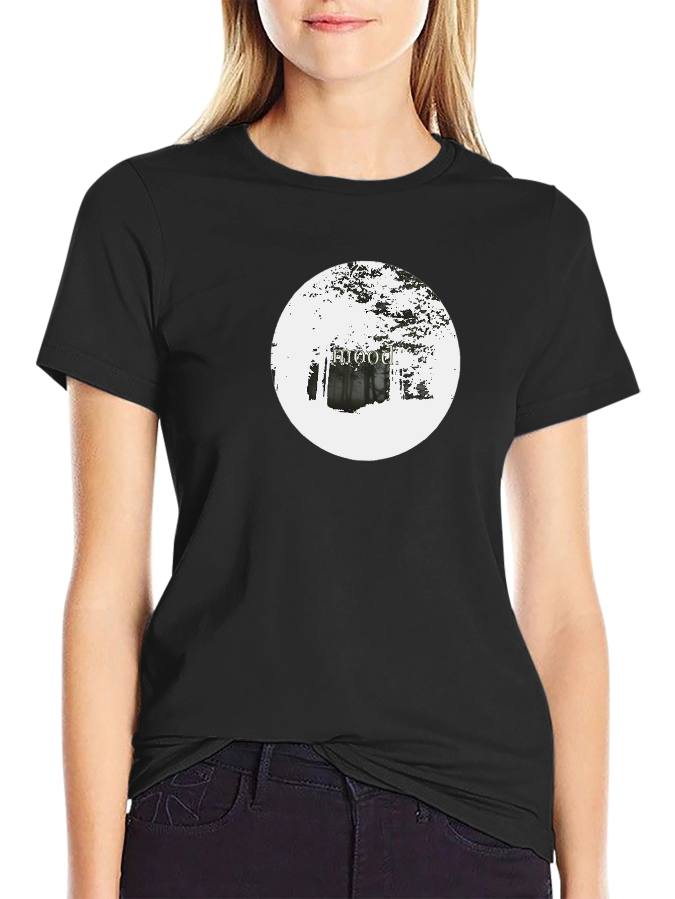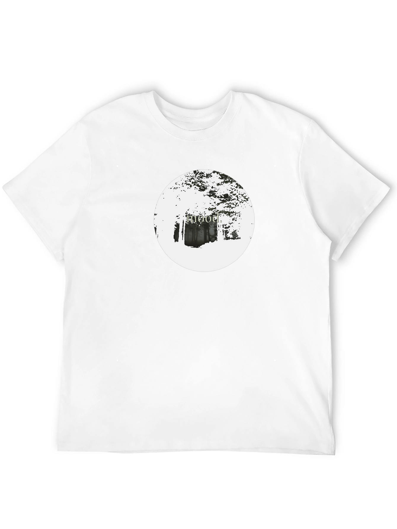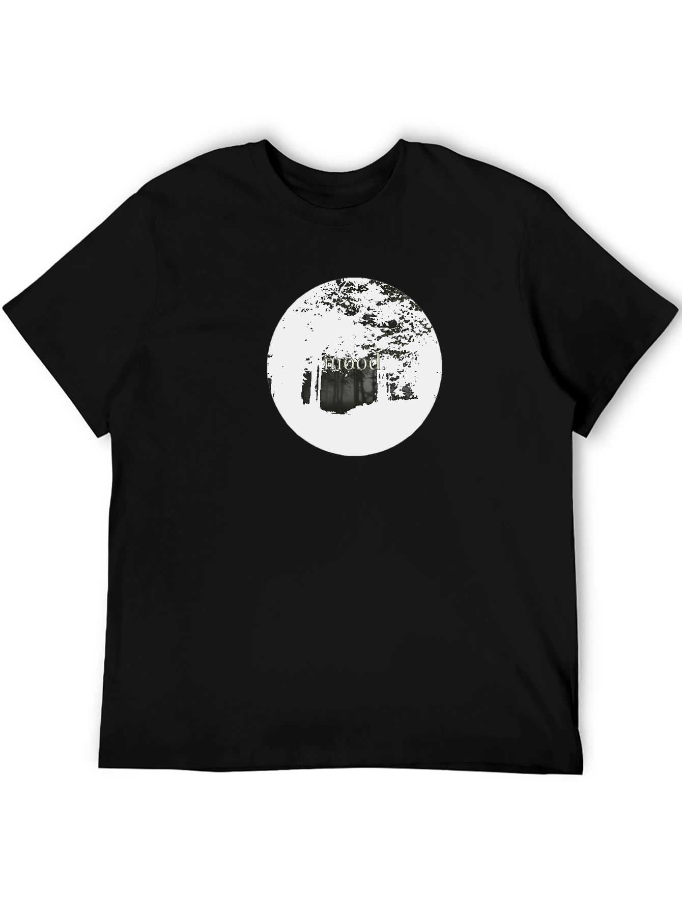 This classic black t-shirt features a unique and eye-catching design. A crisp white circle on the chest showcases what appears to be a hooded figure illustration against a backdrop of trees or foliage. The design adds an element of mystery and intrigue to the garment. Made from what appears to be a soft and comfortable fabric, this t-shirt is ideal for casual wear, concerts, or expressing your unique style. Pair it with jeans, shorts, or layer it under a jacket for a versatile look. The black color ensures it can be easily integrated into any wardrobe, making it a must-have staple.