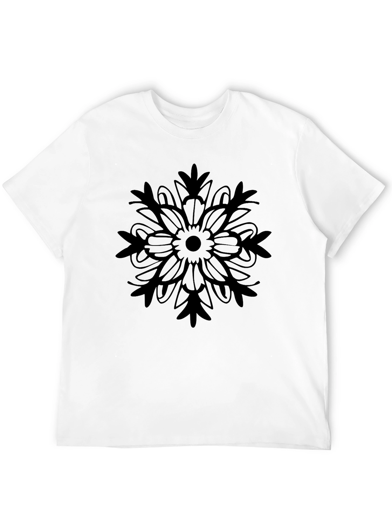 Elevate your casual wardrobe with this striking black t-shirt. The shirt features a bold, symmetrical floral mandala design that adds a touch of artistry to your everyday look. Made from comfortable, breathable fabric, this tee offers a relaxed fit perfect for all-day wear. The dark color makes it a versatile piece, easily paired with jeans, shorts, or even dressed up with a blazer. Whether you're heading to a casual outing or relaxing at home, this t-shirt combines style and comfort effortlessly. A must-have addition for those who appreciate unique and expressive clothing.