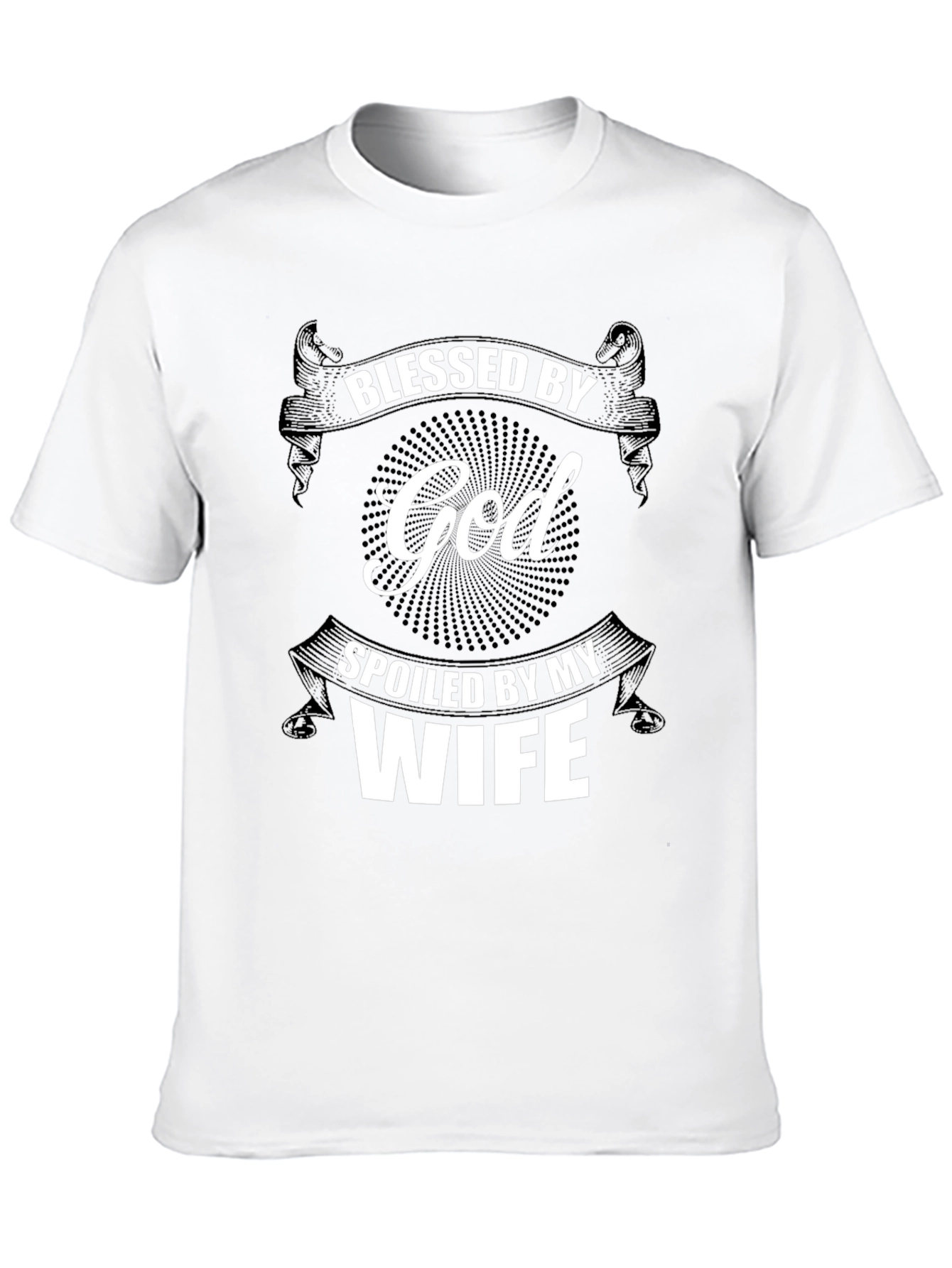 Show your love and appreciation with this stylish black t-shirt. Featuring bold white text proclaiming "Blessed by God, Spoiled by My Wife," this shirt is a perfect way to express gratitude and affection. The design incorporates decorative banner elements, adding a touch of elegance to the message. Made from a comfortable, breathable fabric, this tee is ideal for everyday wear. Whether you're running errands, relaxing at home, or spending time with loved ones, this t-shirt will make a statement. Makes a thoughtful gift for husbands, fathers, or anyone who wants to show their love for God and their spouse.