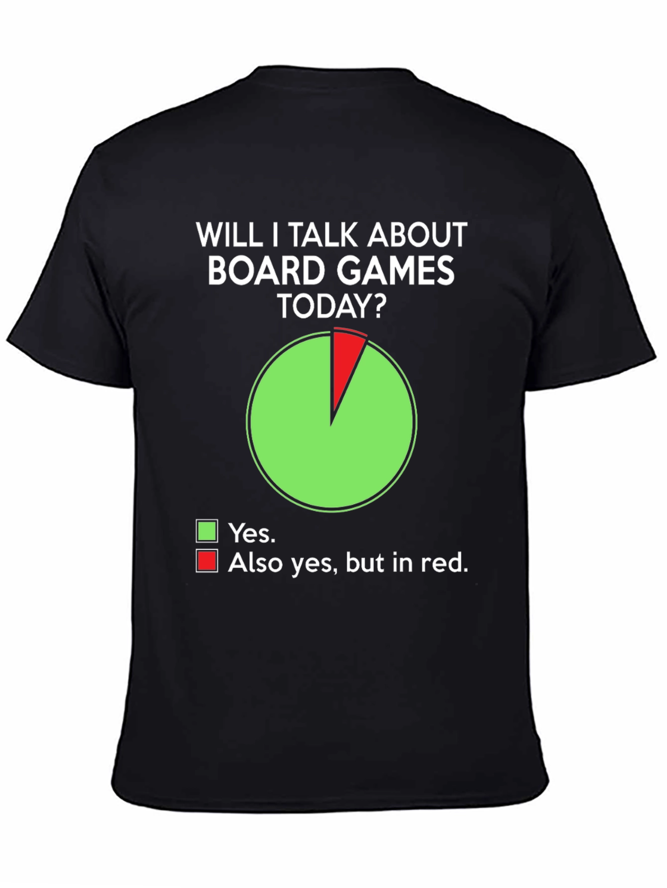 Show off your love for board games with this humorous t-shirt. The design features a pie chart answering the question 'Will I talk about board games today?' with 'Yes' dominating in green and 'Also yes, but in red' taking up the remaining sliver. This funny tee is perfect for game nights, conventions, or any day you want to express your passion for board games. Made from a comfortable, breathable fabric, this shirt is durable and suitable for everyday wear. Get ready to spark conversations and share your enthusiasm for all things board games!