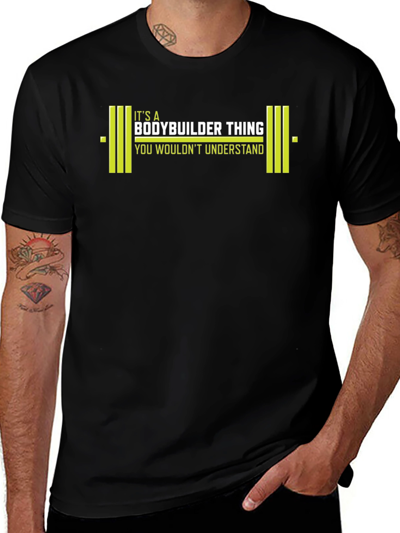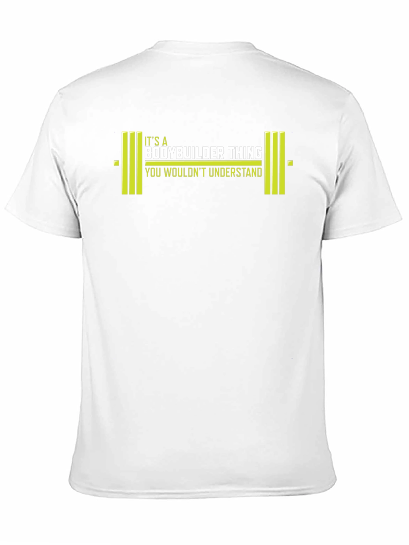 Show off your dedication to fitness with this unique graphic tee! This black t-shirt features a playful design with a vibrant, stylized barbell graphic in a striking yellow-green. The text "It's a Bodybuilder Thing You Wouldn't Understand" is printed in a matching font, completing the design. Made from what appears to be a soft and breathable cotton blend, this tee ensures comfort during workouts or casual wear. Perfect for gym enthusiasts, bodybuilders, and anyone proud of their fitness lifestyle. Get yours today!