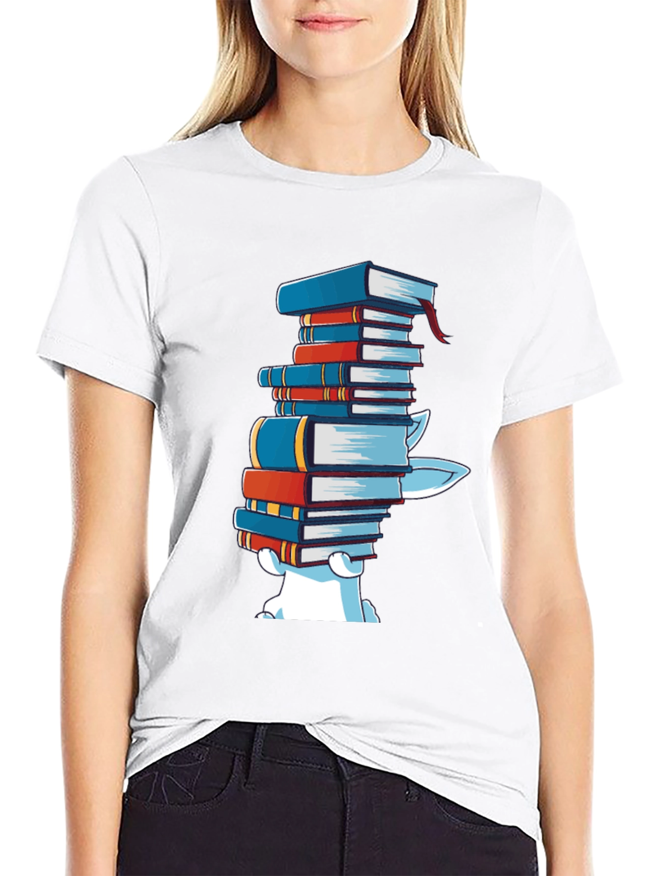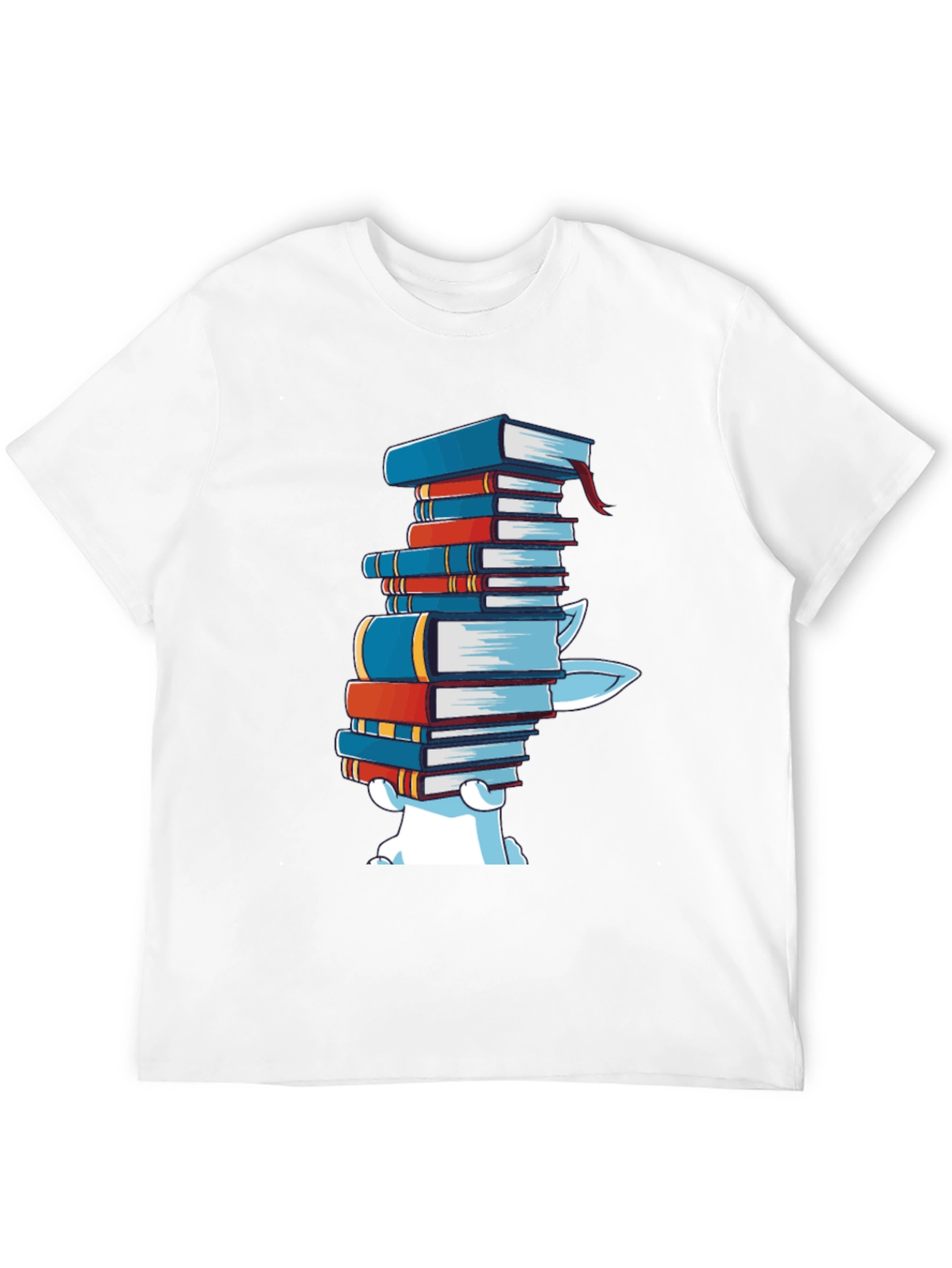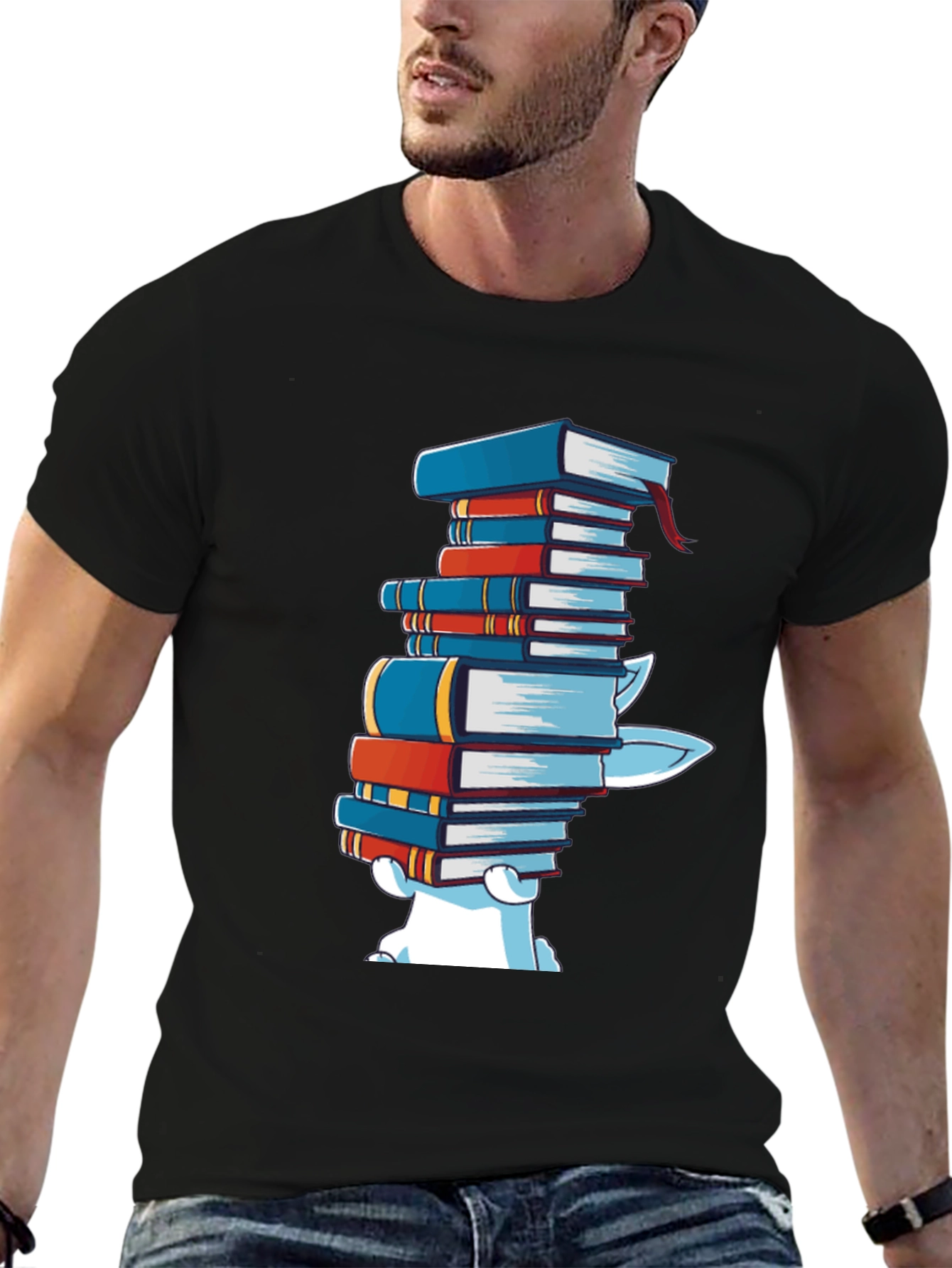 This stylish black t-shirt features a playful design of a cartoon bear playfully carrying a stack of colorful books. The vibrant colors of the books pop against the dark background of the tee, making the design stand out. Made from a soft, comfortable fabric, this t-shirt is perfect for casual wear, book clubs, library visits, or for any occasion where you want to express your love of reading. It's a unique and humorous gift for book lovers, librarians, or anyone with a great sense of humor.