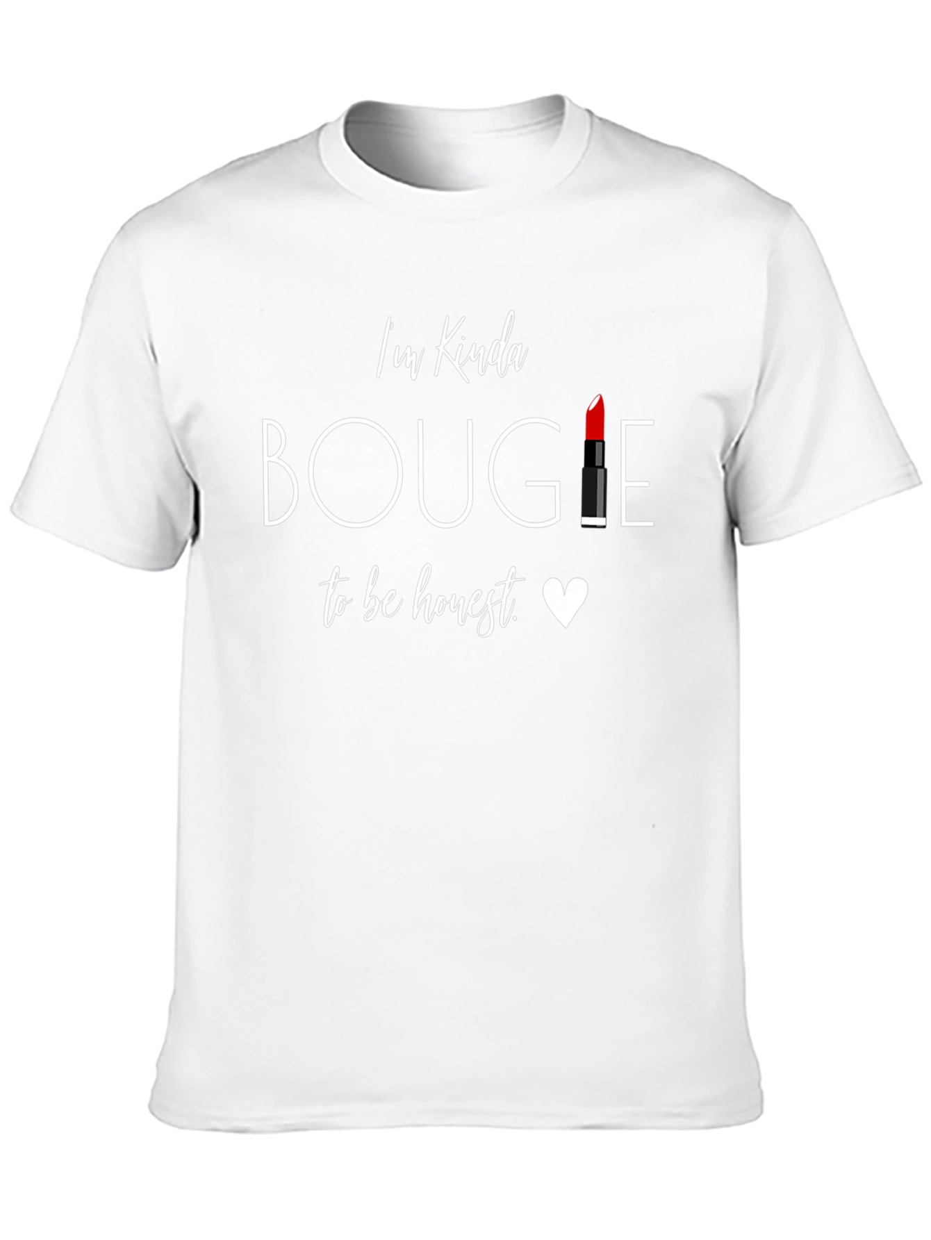 Show off your stylish side with this trendy black t-shirt! The design features the playful text "I'm Kinda BOUGIE to be honest" with a lipstick replacing the letter "I" for a unique touch. A small heart graphic adds an extra dose of charm. Made from soft, breathable fabric, this tee is perfect for casual outings, social gatherings, or everyday wear. Pair it with jeans, shorts, or a skirt for a fun, fashionable look. Get ready to turn heads and make a statement with this bougie-chic t-shirt!