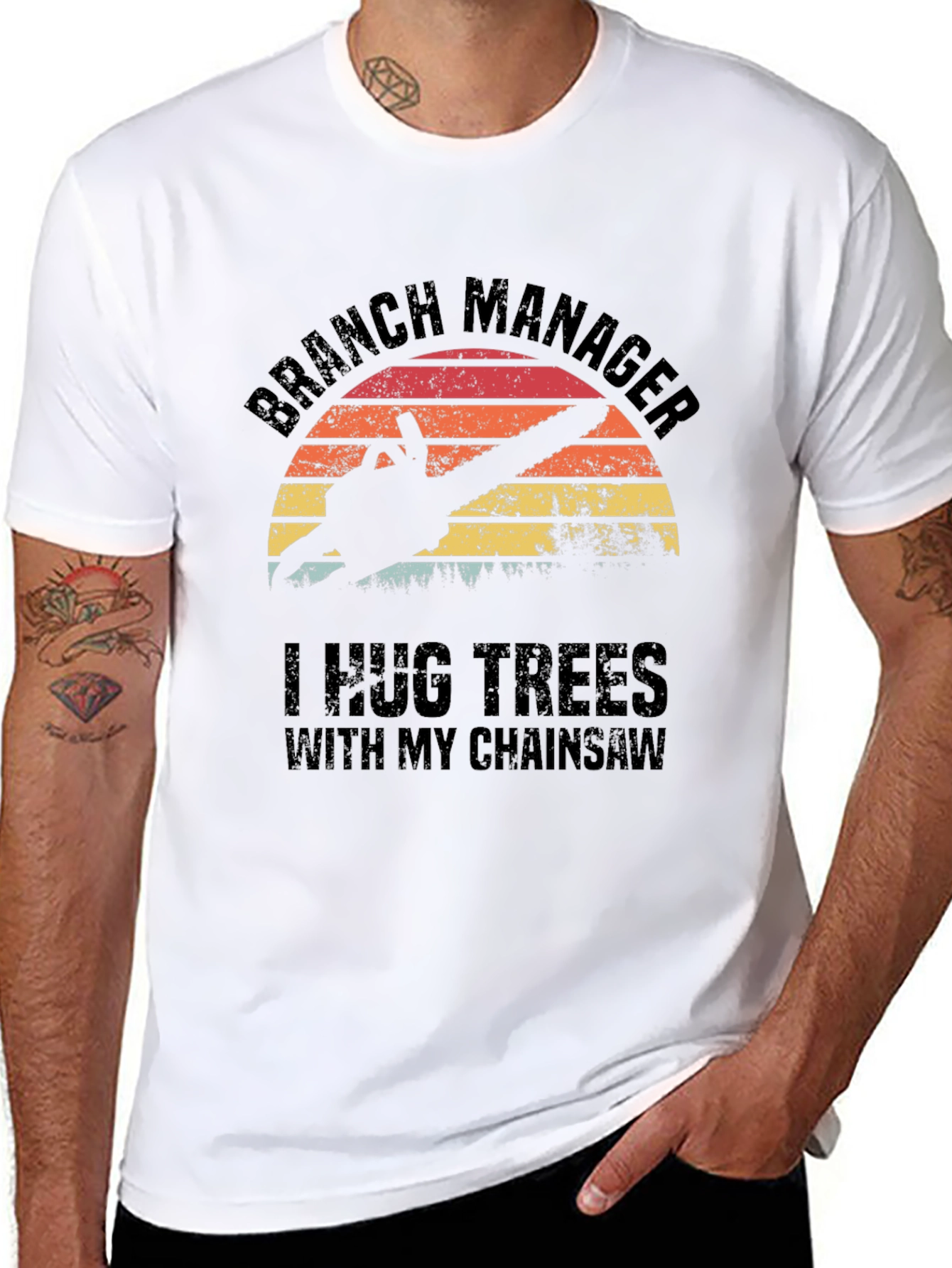 This classic black t-shirt features a humorous and eye-catching design. The print showcases a retro-style sunset graphic behind a silhouette of a chainsaw and trees, accompanied by the text "BRANCH MANAGER I HUG TREES WITH MY CHAINSAW". Made from what appears to be soft, breathable cotton, this tee offers both comfort and style. The short-sleeved design makes it perfect for casual wear. It's an ideal gift for lumberjacks, arborists, or anyone with a quirky sense of humor and love for the outdoors. Show off your playful side with this unique statement piece!