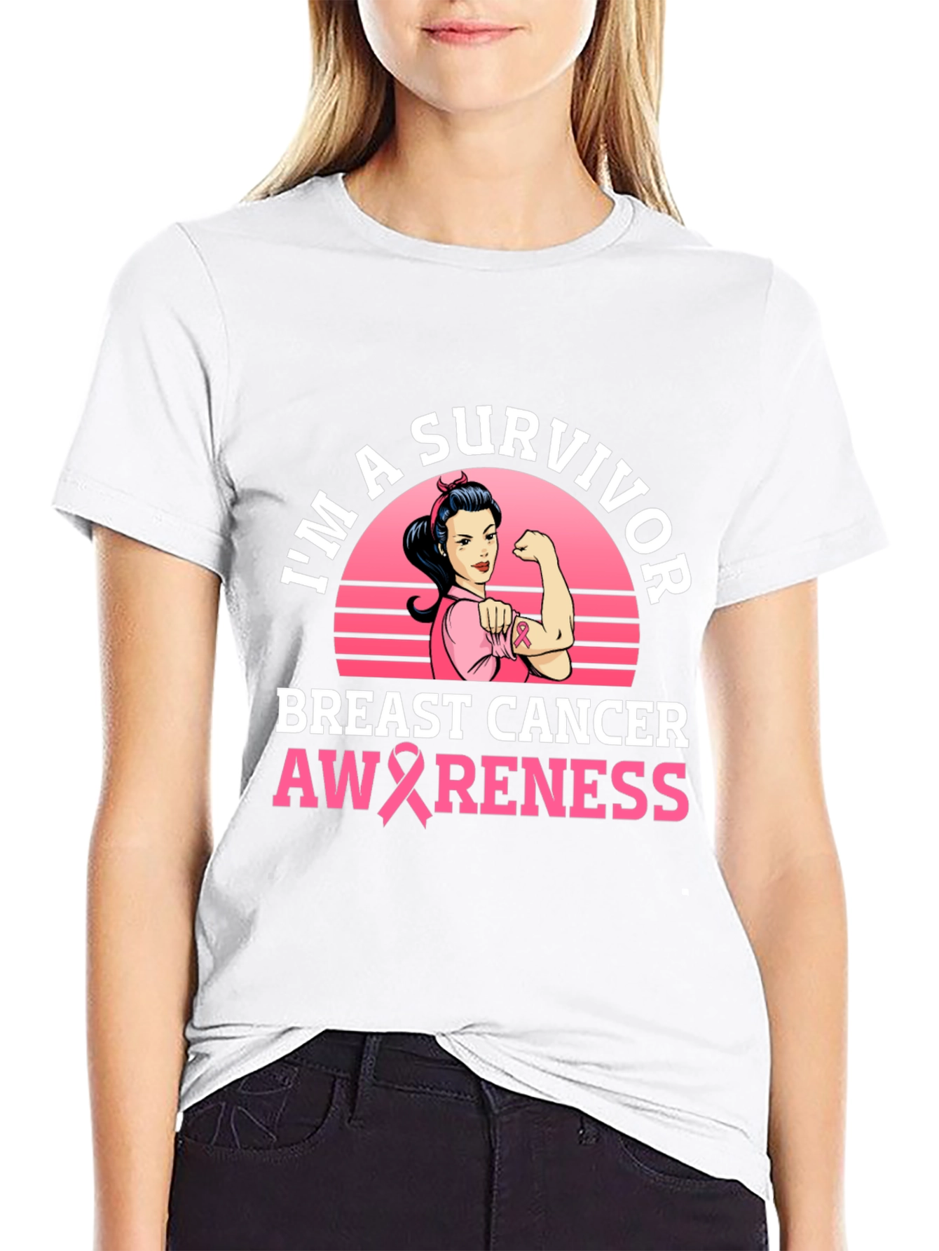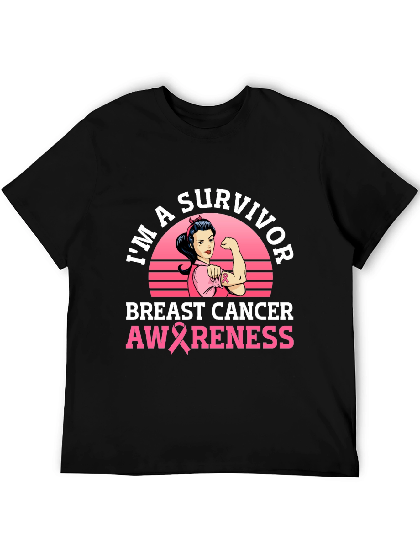 Show your support with this empowering black t-shirt featuring a "I'm A Survivor" design. The graphic includes a retro-style image of a strong woman flexing her arm against a pink sunset backdrop, symbolizing strength and resilience. The phrase "BREAST CANCER AWARENESS" is prominently displayed, incorporating a pink ribbon to further raise awareness. Made from a comfortable fabric, this shirt is perfect for breast cancer awareness walks, support groups, or simply to show solidarity for survivors. Wear it with pride and spread the message of hope and strength!