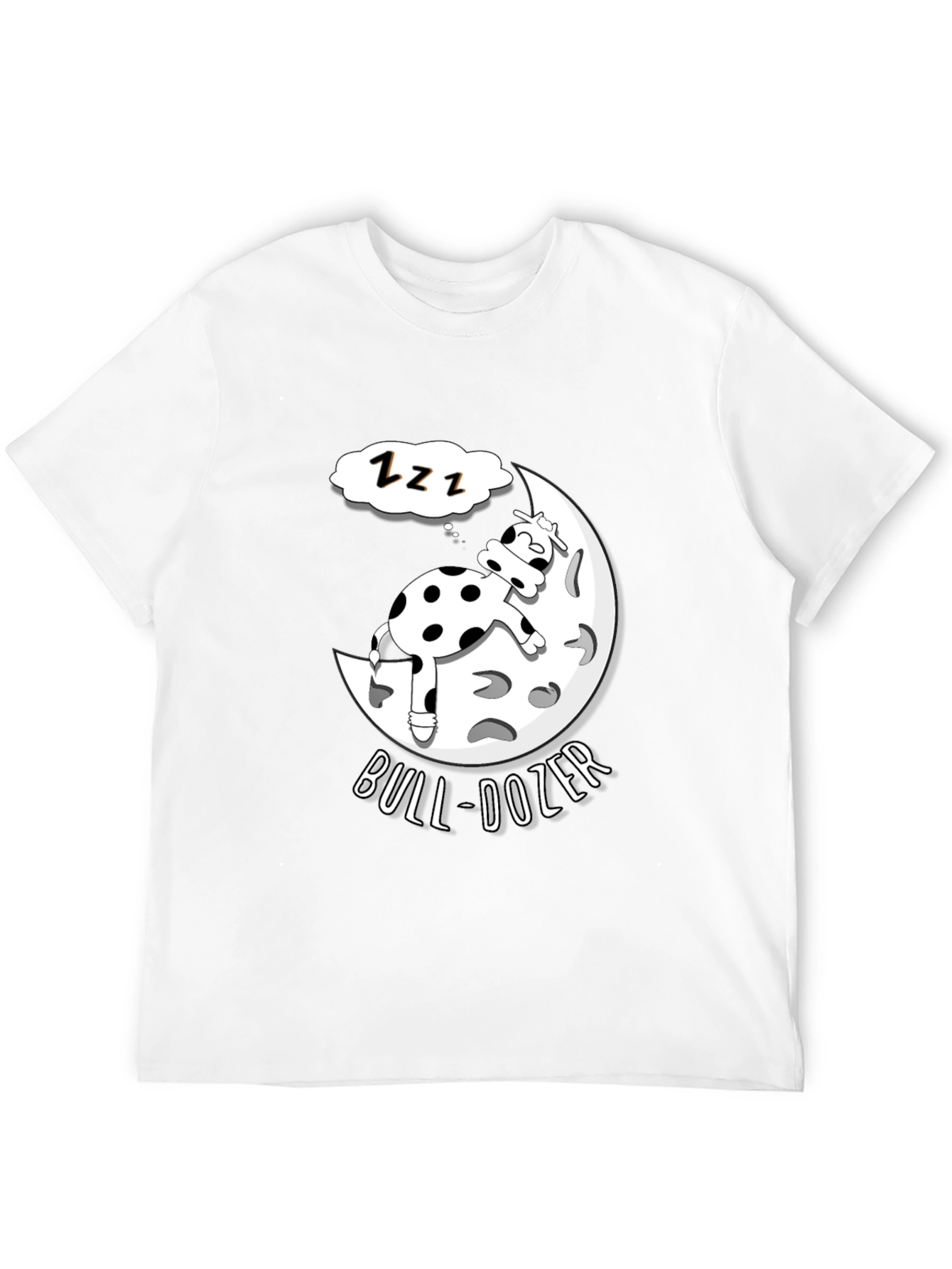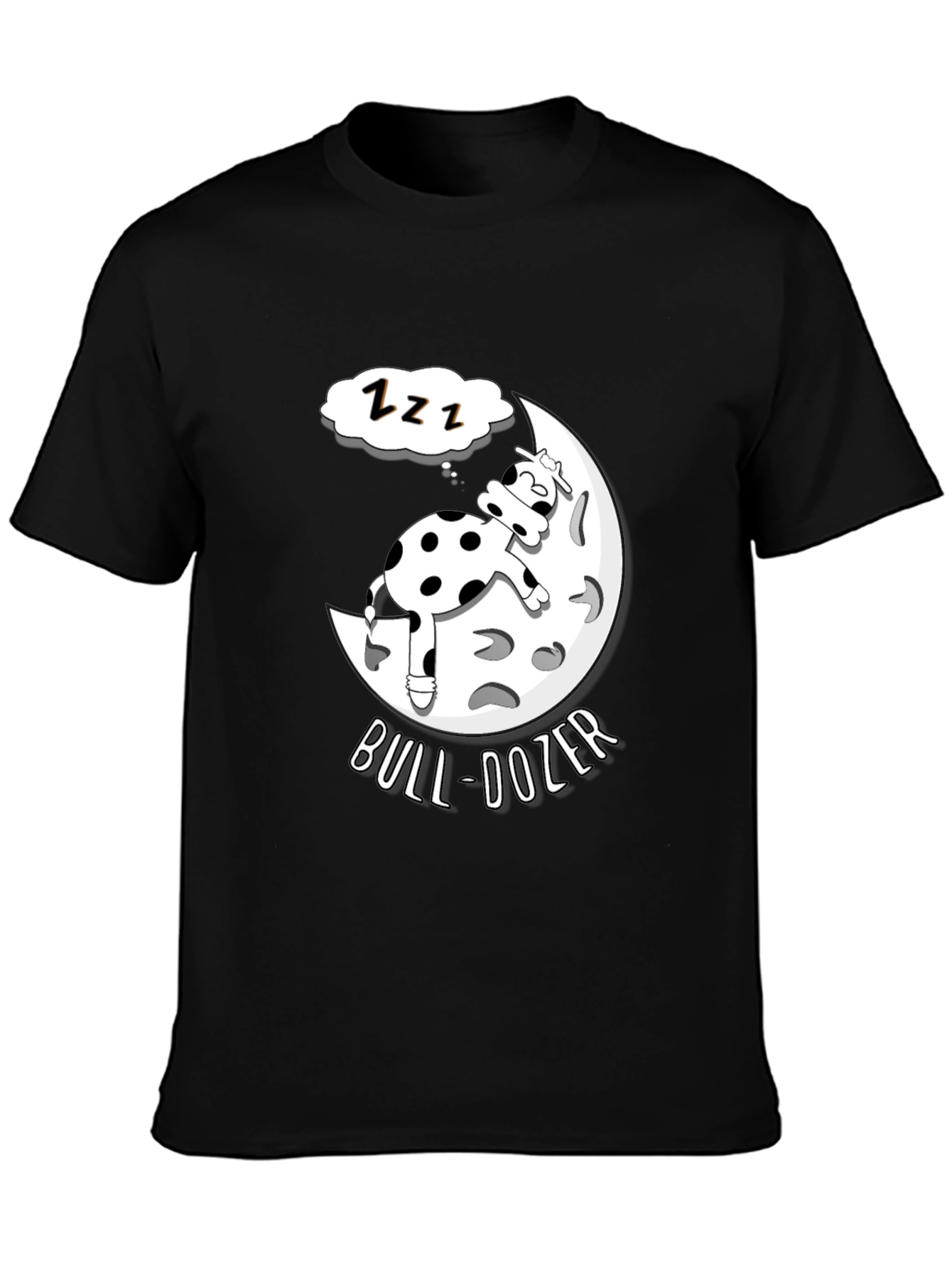 This black t-shirt features a humorous cartoon design. A spotted cow is depicted asleep on a crescent moon, complete with "ZZZ" thought bubble. The punny phrase "BULL-DOZER" curves below the moon, adding to the whimsical nature of the shirt. The shirt appears to be made of soft, comfortable material. Perfect for anyone who loves cows, puns, or quirky graphic tees. This t-shirt is a great conversation starter. Ideal for casual wear, lounging, or as a fun gift for a friend or family member.