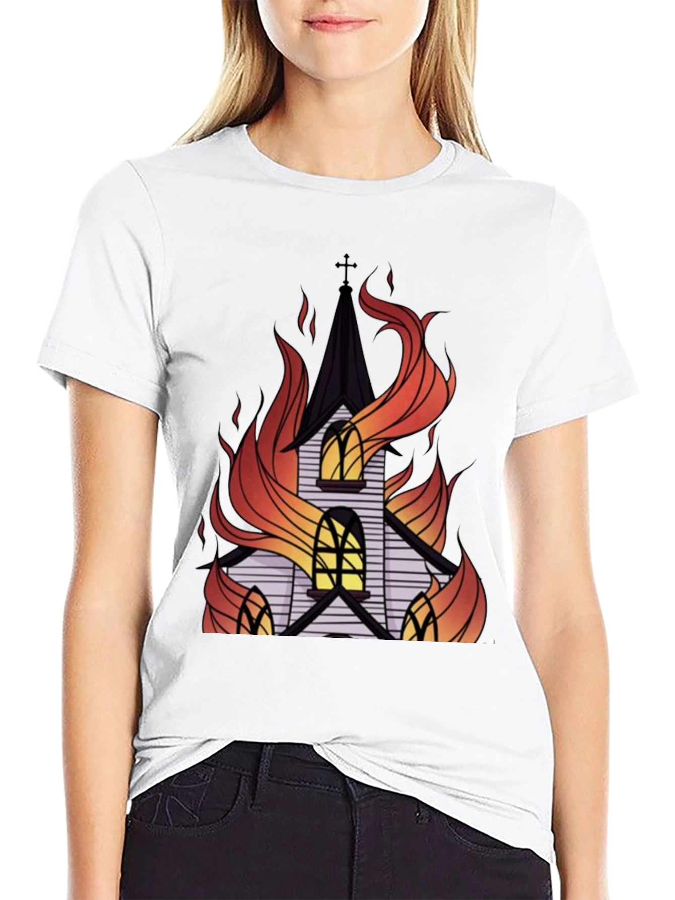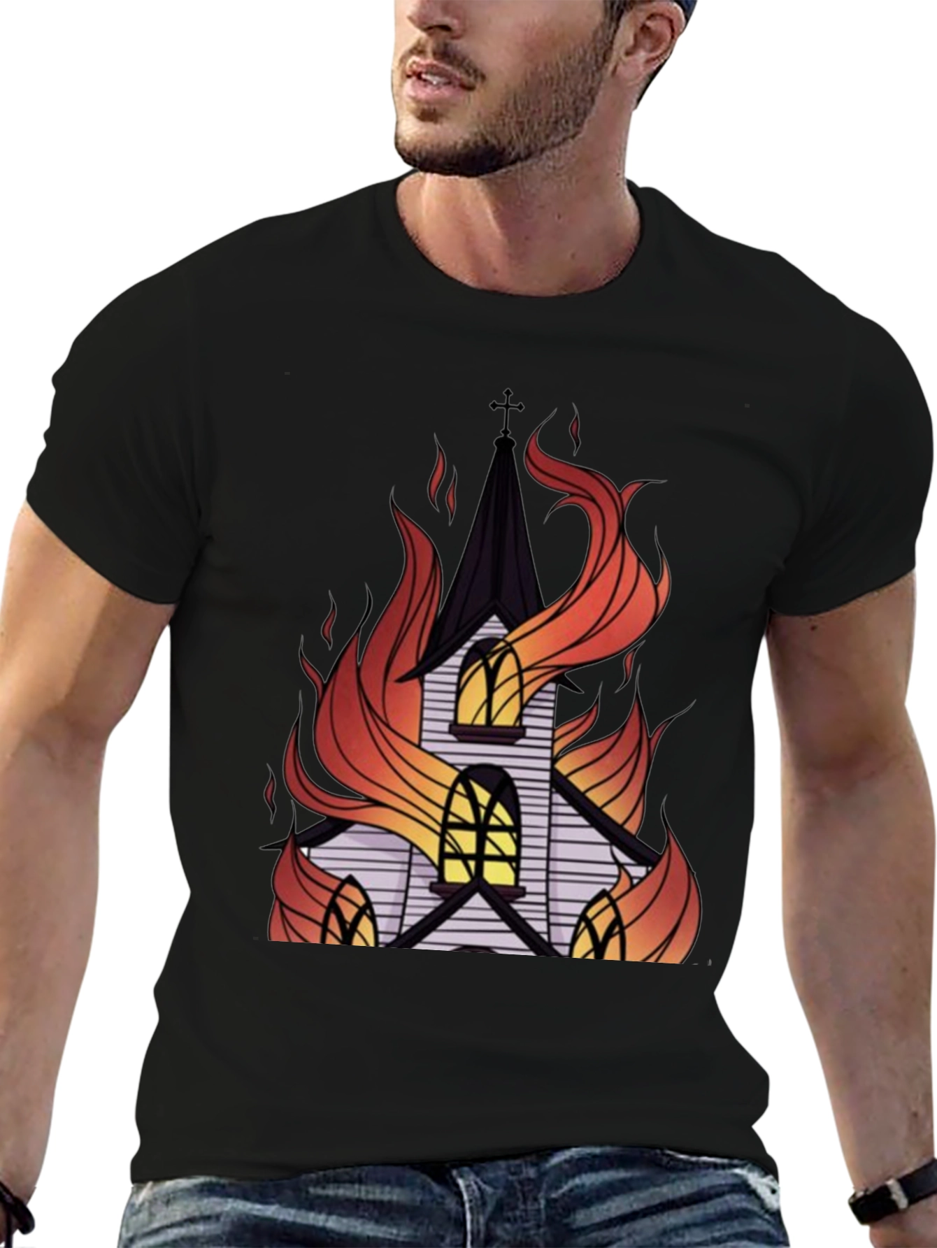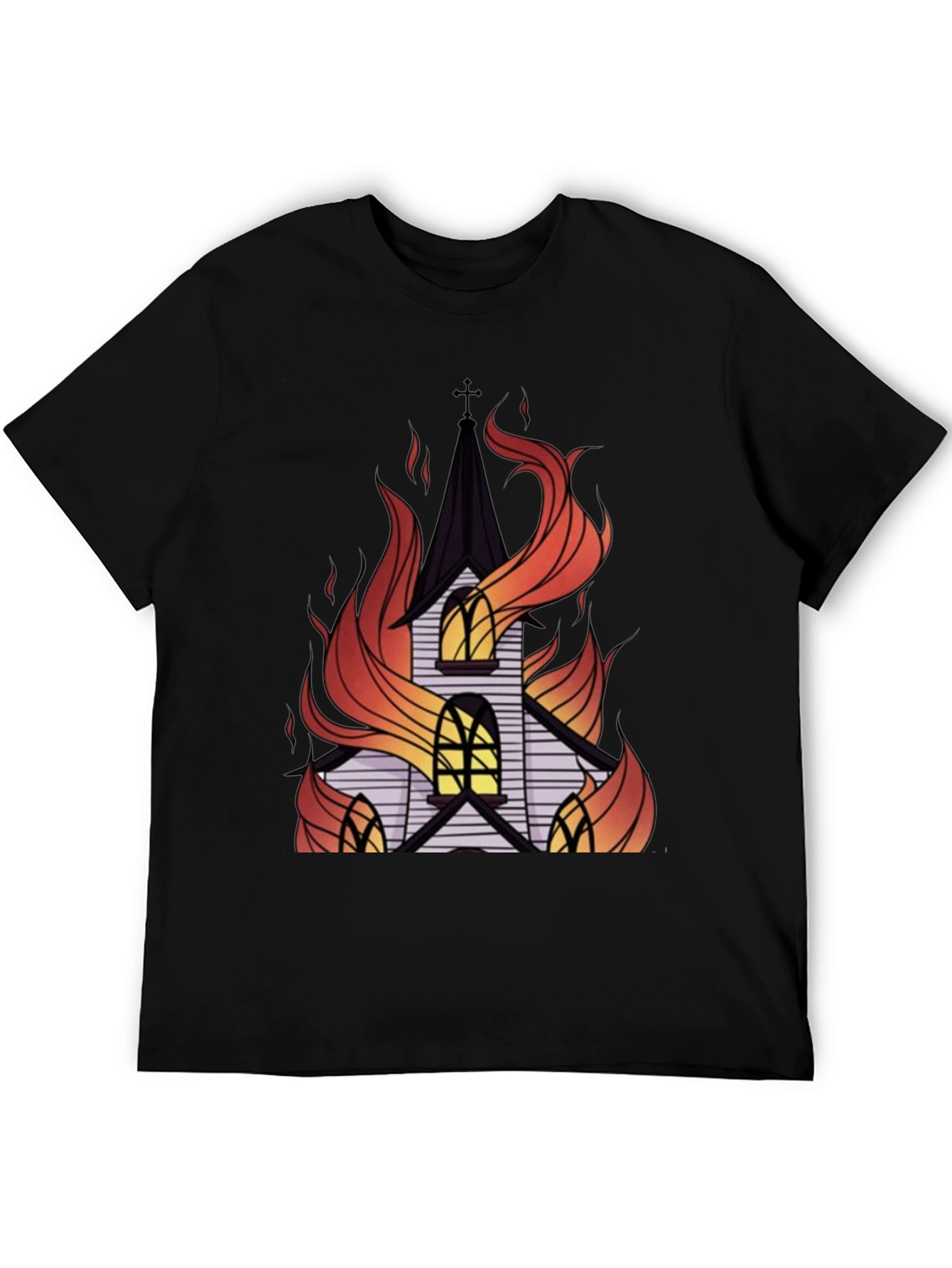 Embrace a bold statement with this striking black t-shirt featuring a captivating graphic print. The design showcases a detailed image of a church engulfed in stylized flames, creating a visually powerful and edgy aesthetic. Crafted from soft, breathable cotton, this tee offers exceptional comfort and durability for everyday wear. The vibrant colors of the flames contrast beautifully against the dark background, making this shirt a standout piece. Perfect for those who appreciate unique and alternative fashion, this t-shirt is ideal for casual outings, concerts, or expressing your individuality. Add a touch of rebellious flair to your wardrobe with this eye-catching graphic tee.